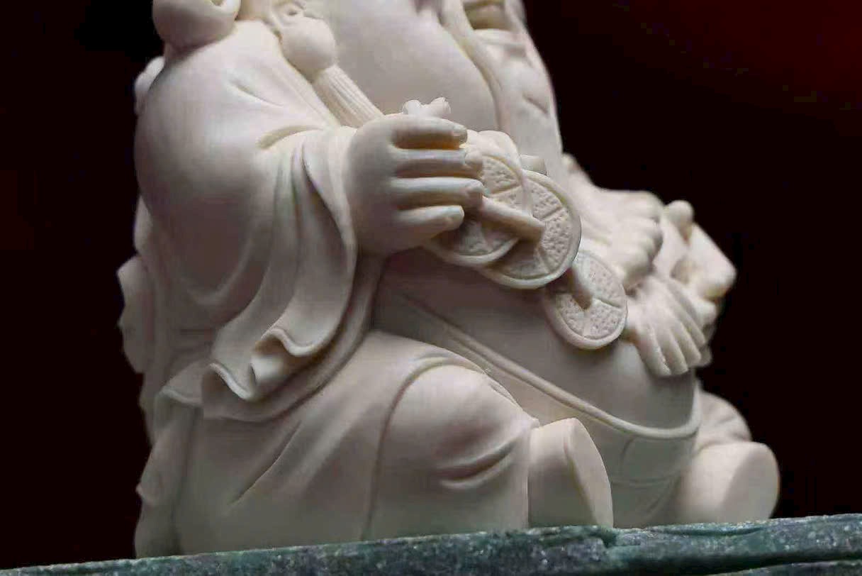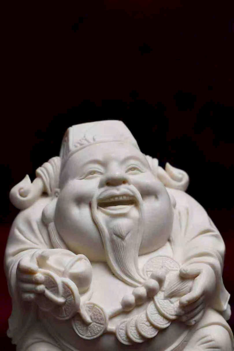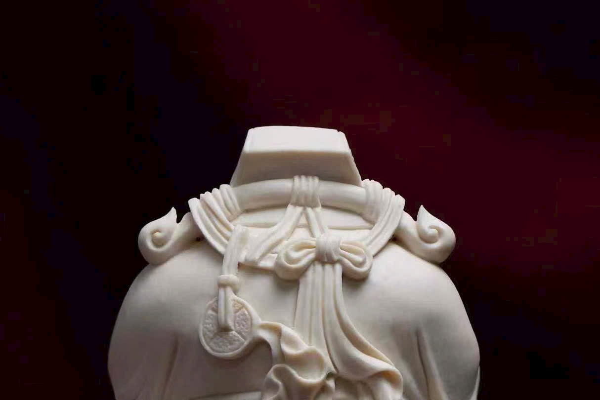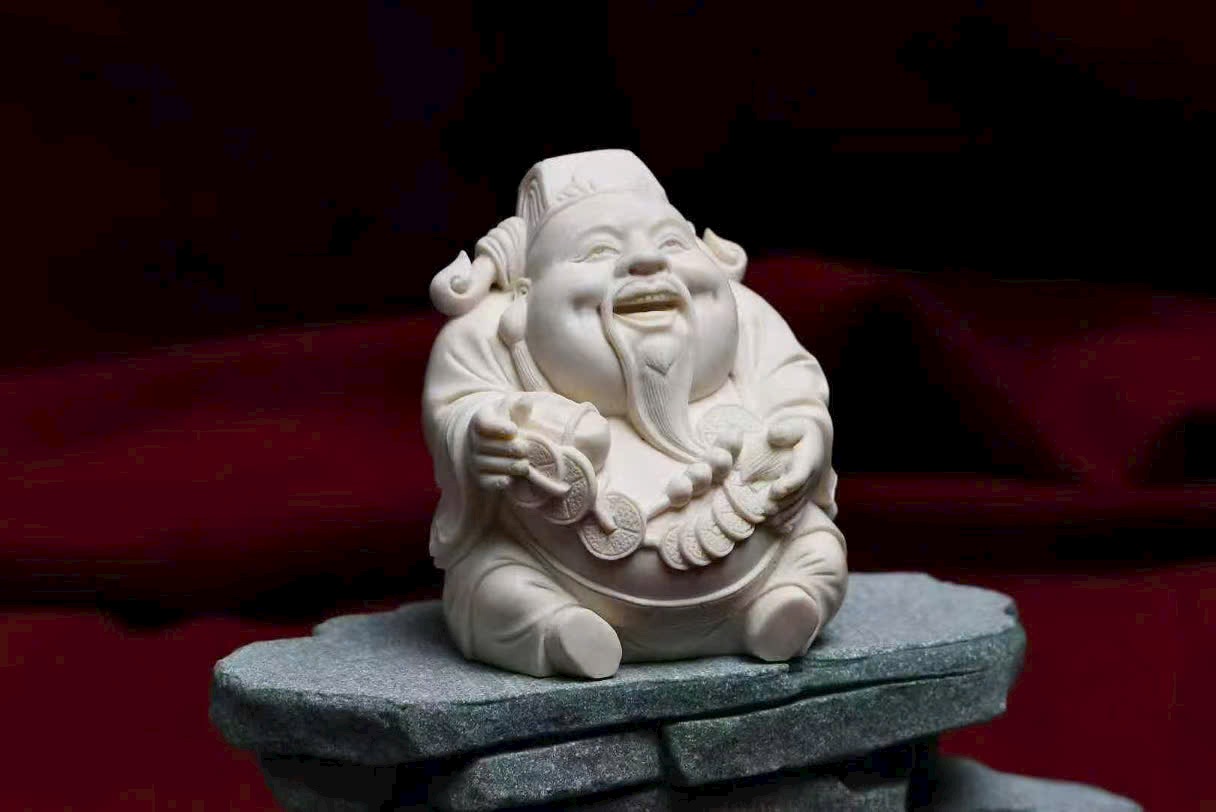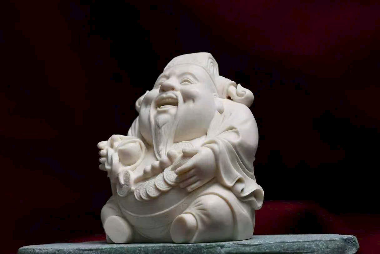 Tượng Thần Tài với nụ cười rạng rỡ, mắt và lông mày cong cong, toát lên vẻ thân thiện và hân hoan. Đầu đội mũ quan, y phục uốn lượn tự nhiên, trên tay cầm bảo vật được chạm khắc tinh xảo, thể hiện trọn vẹn khí chất phú quý sung túc. Màu sắc ấm áp, gợi cảm giác may mắn và thu hút tài lộc, tỏa ra vượng khí cát tường.