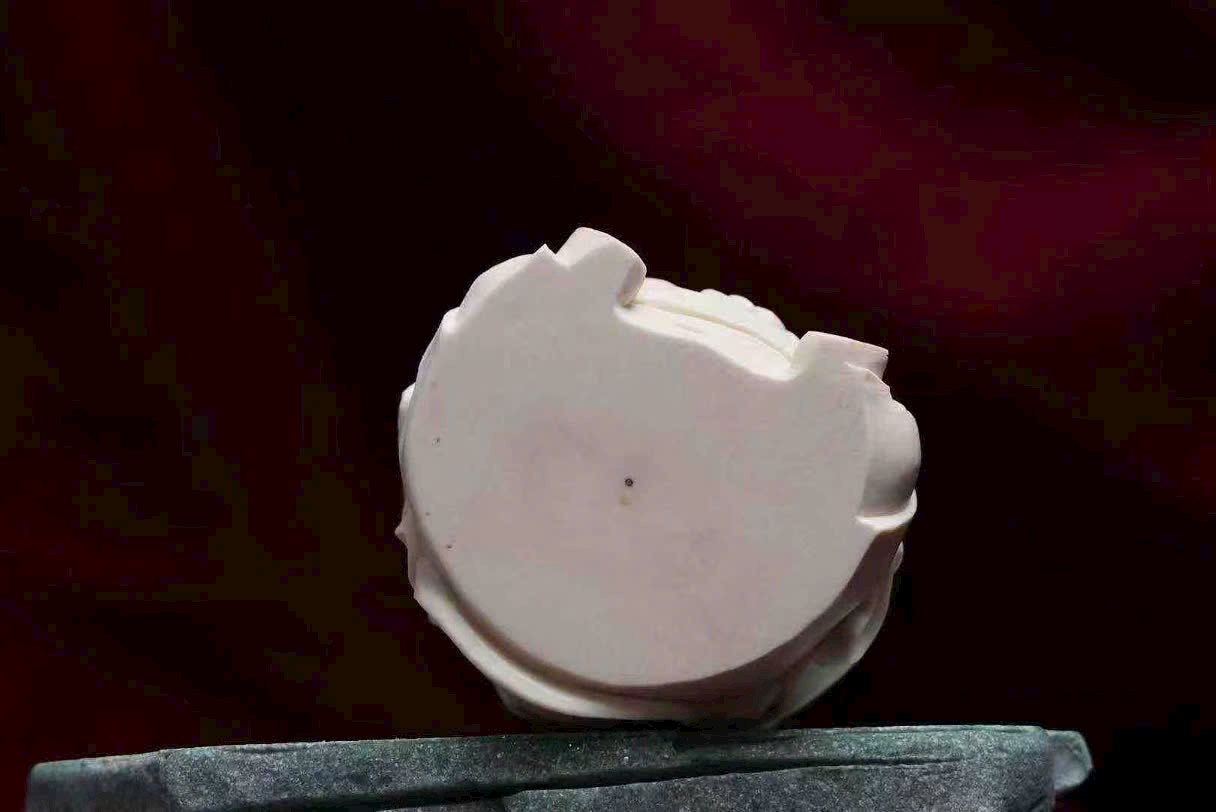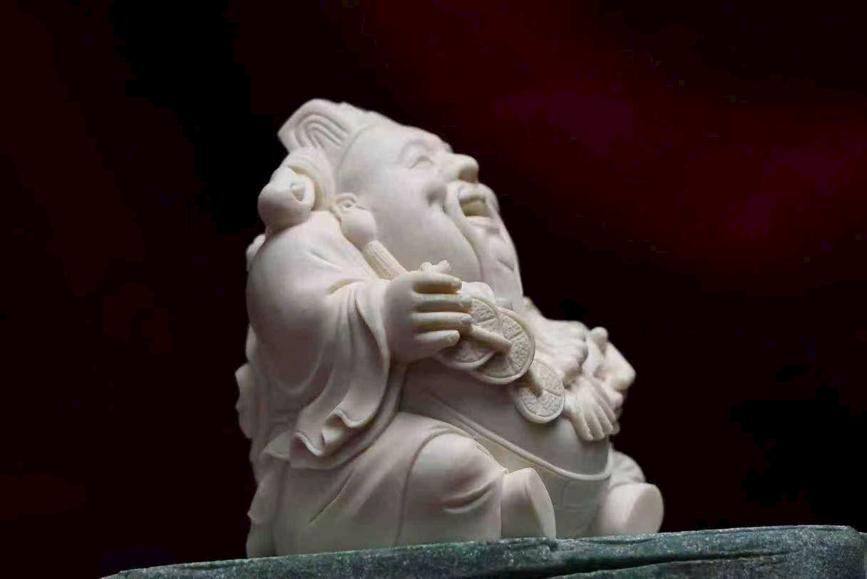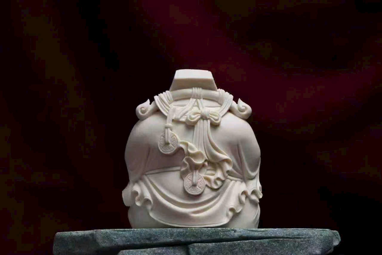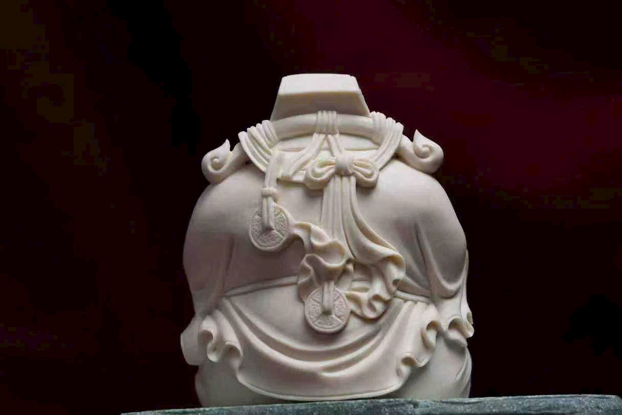 Tượng Thần Tài với nụ cười rạng rỡ, mắt và lông mày cong cong, toát lên vẻ thân thiện và hân hoan. Đầu đội mũ quan, y phục uốn lượn tự nhiên, trên tay cầm bảo vật được chạm khắc tinh xảo, thể hiện trọn vẹn khí chất phú quý sung túc. Màu sắc ấm áp, gợi cảm giác may mắn và thu hút tài lộc, tỏa ra vượng khí cát tường.