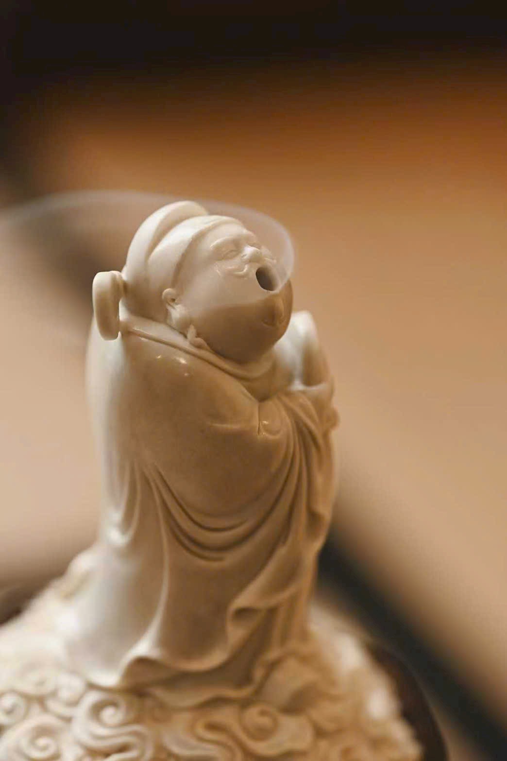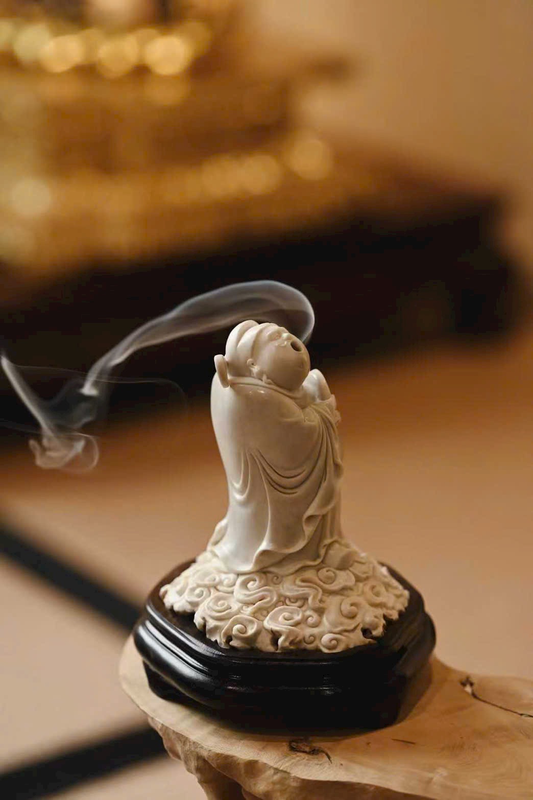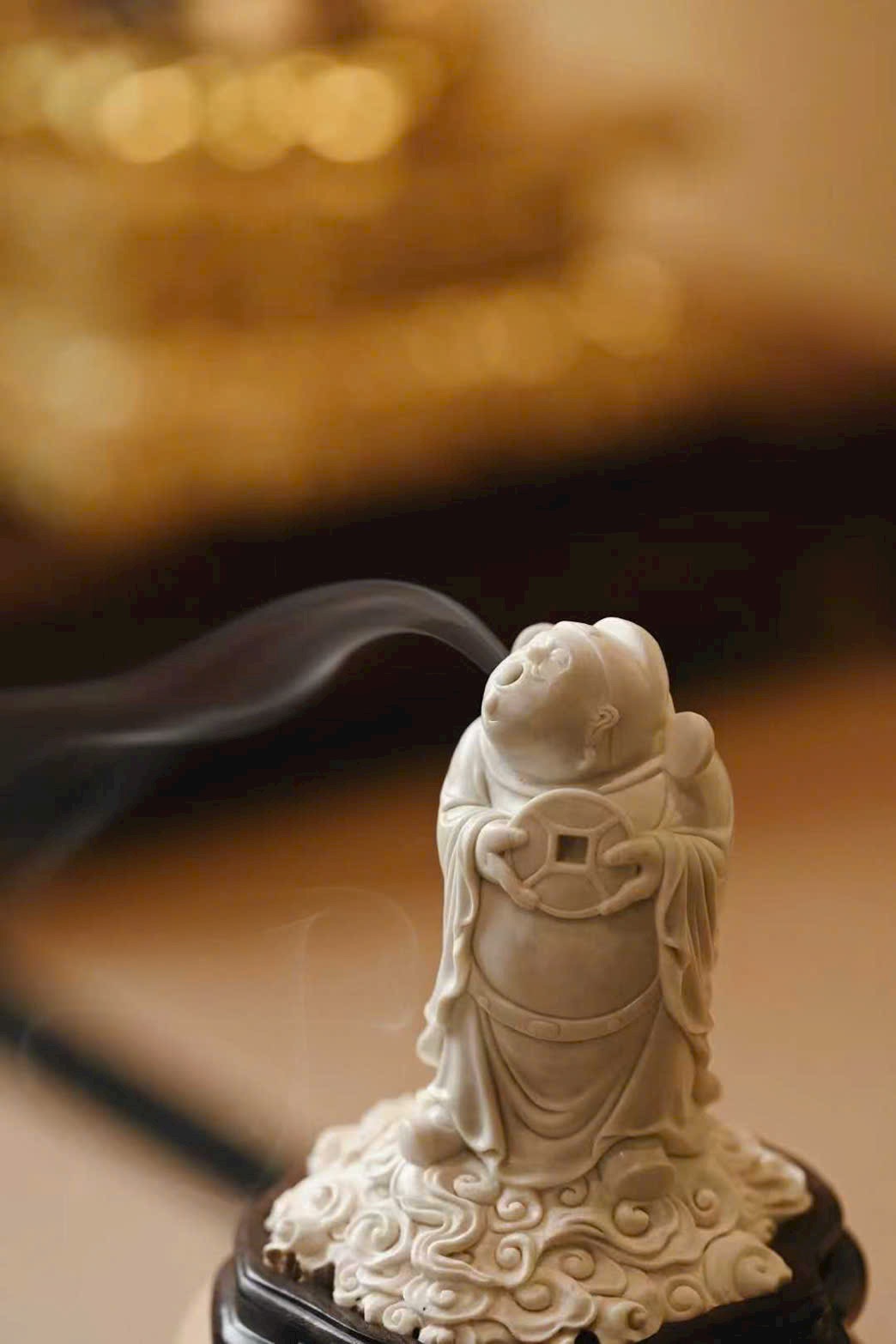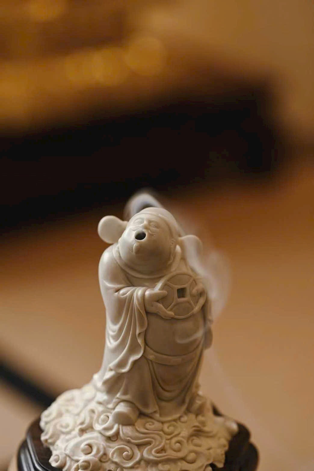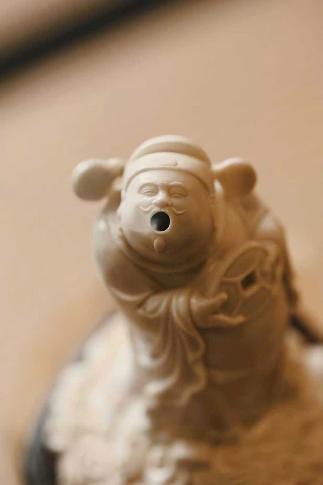 Chất liệu mịn màng, tinh tế. Gương mặt Thần Tài hiền từ, hoan hỷ, đầy phúc khí; khuôn diện tròn đầy như trăng rằm, thần thái thư thái an nhiên. Y phục tung bay theo gió, tay nâng đồng tiền, khí tượng chiêu tài tụ lộc hiện rõ. Tác phẩm mang ý nghĩa làm ăn hưng thịnh, tài lộc dồi dào, tiền tài hanh thông.