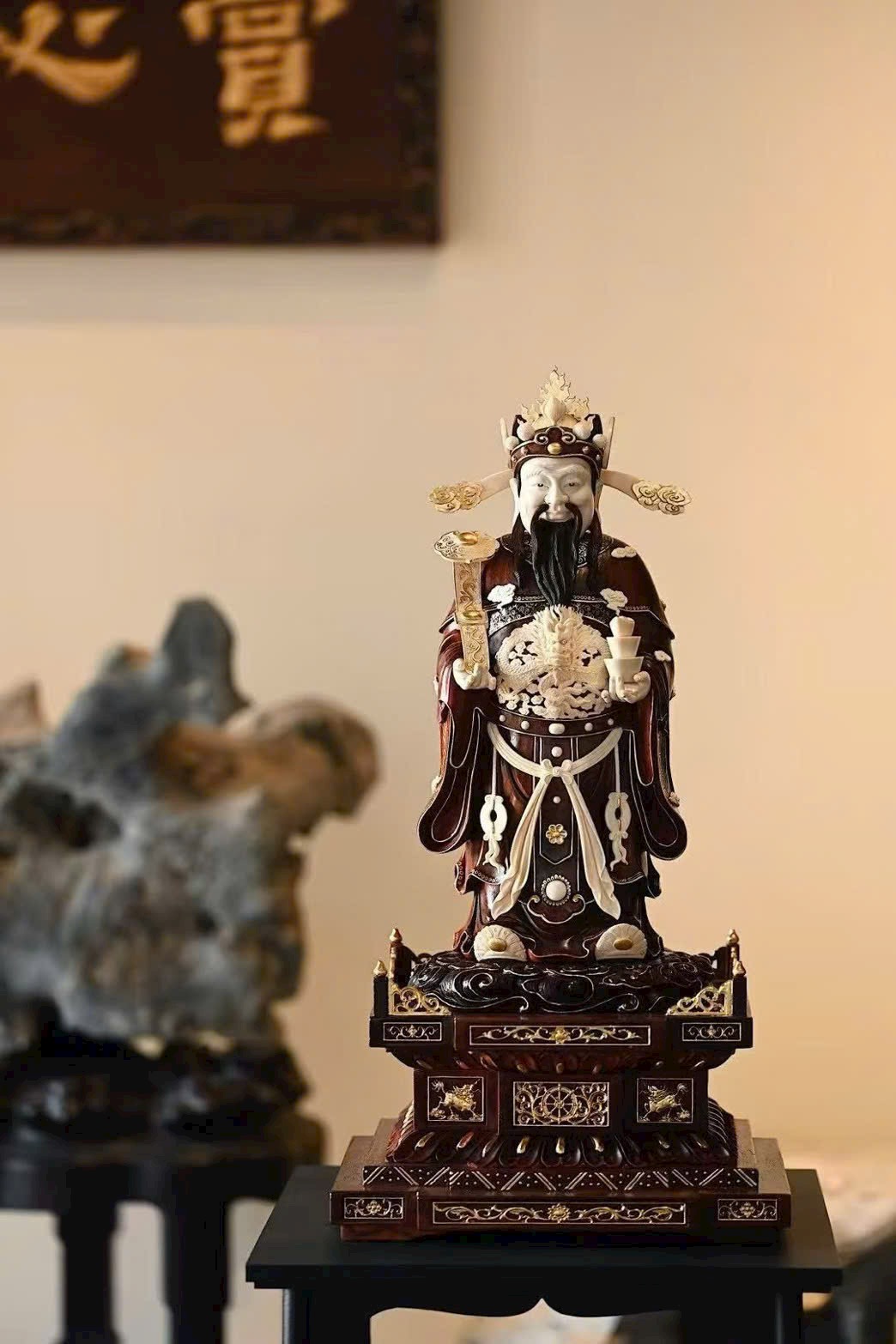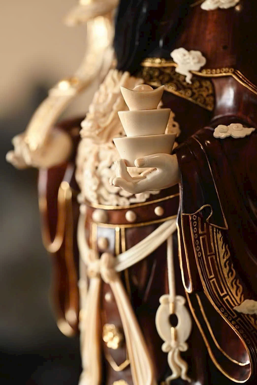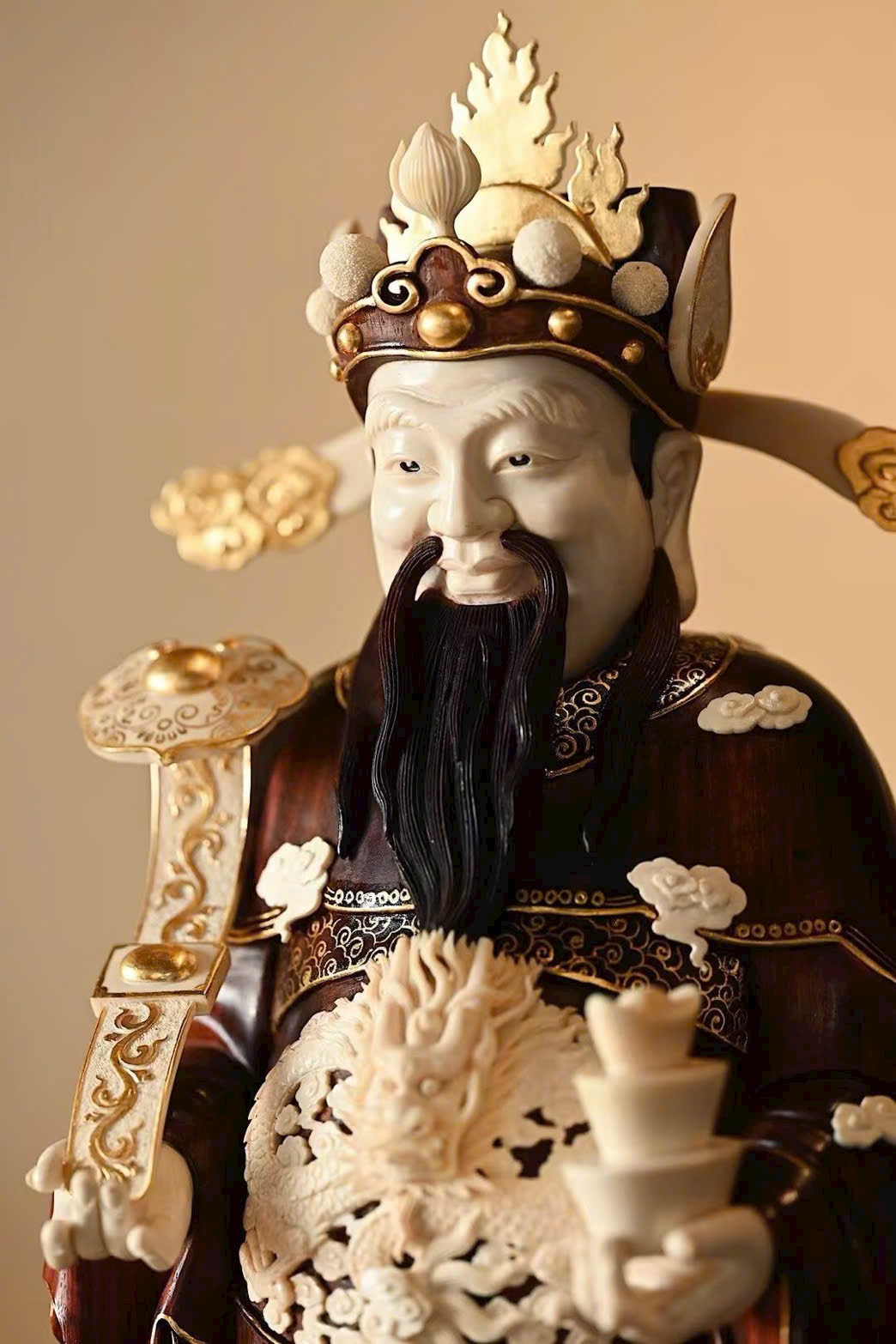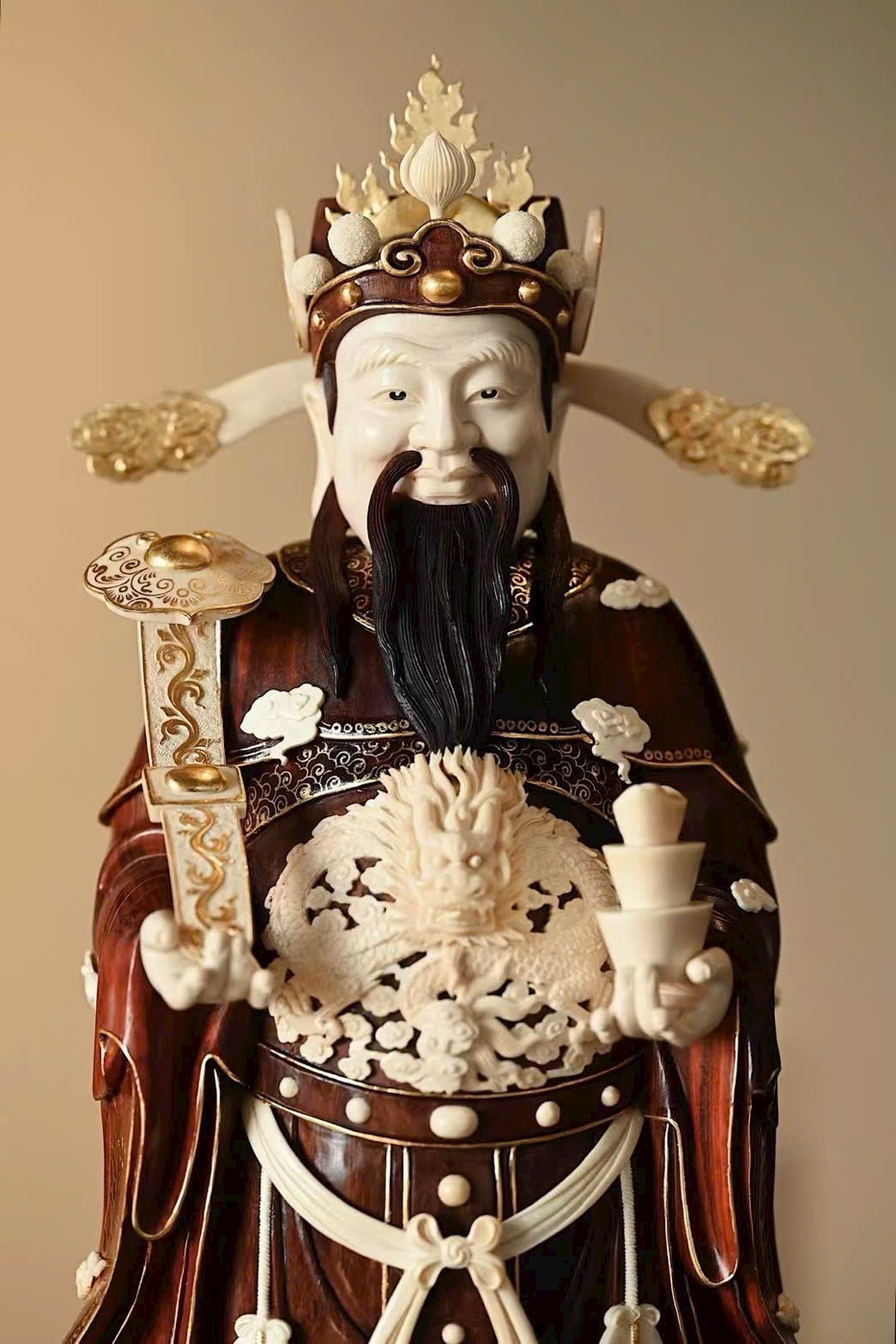 Tác phẩm được chạm khắc tinh xảo, y quan mũ ngọc, đai ngọc, như ý và nguyên bảo đều được thể hiện tự nhiên, sống động. Gương mặt khắc thần thái hiền hòa, mày mắt từ bi, nụ cười viên mãn — biểu trưng cho tích tài tụ bảo, phú quý cát tường.