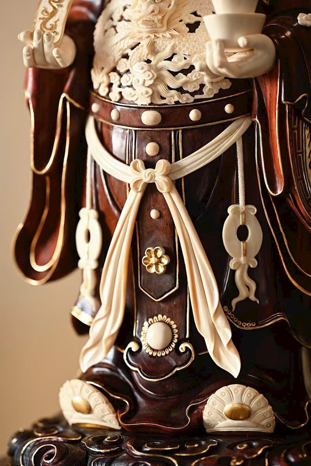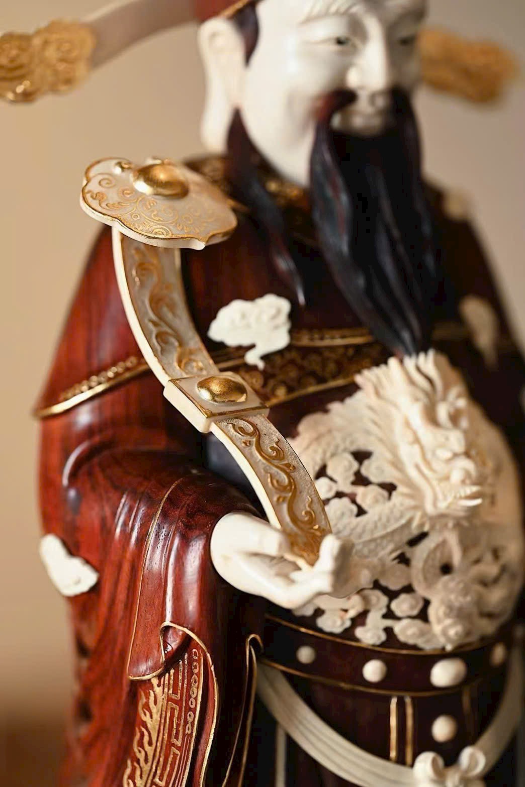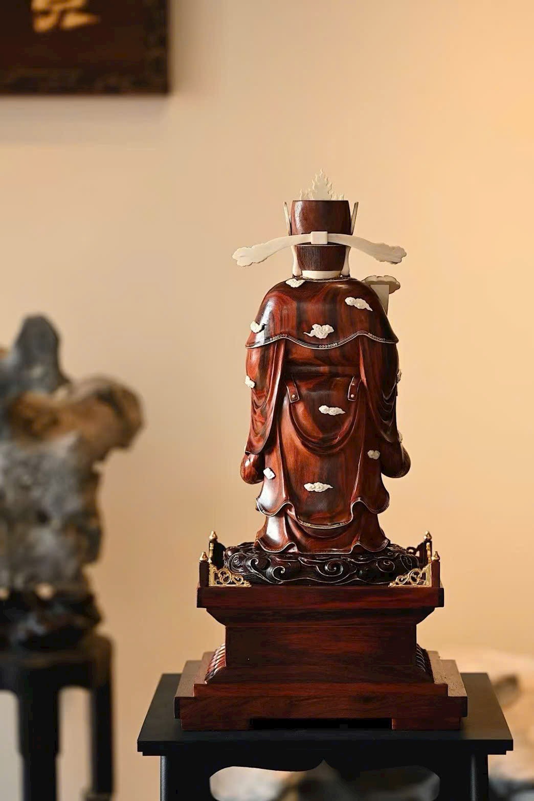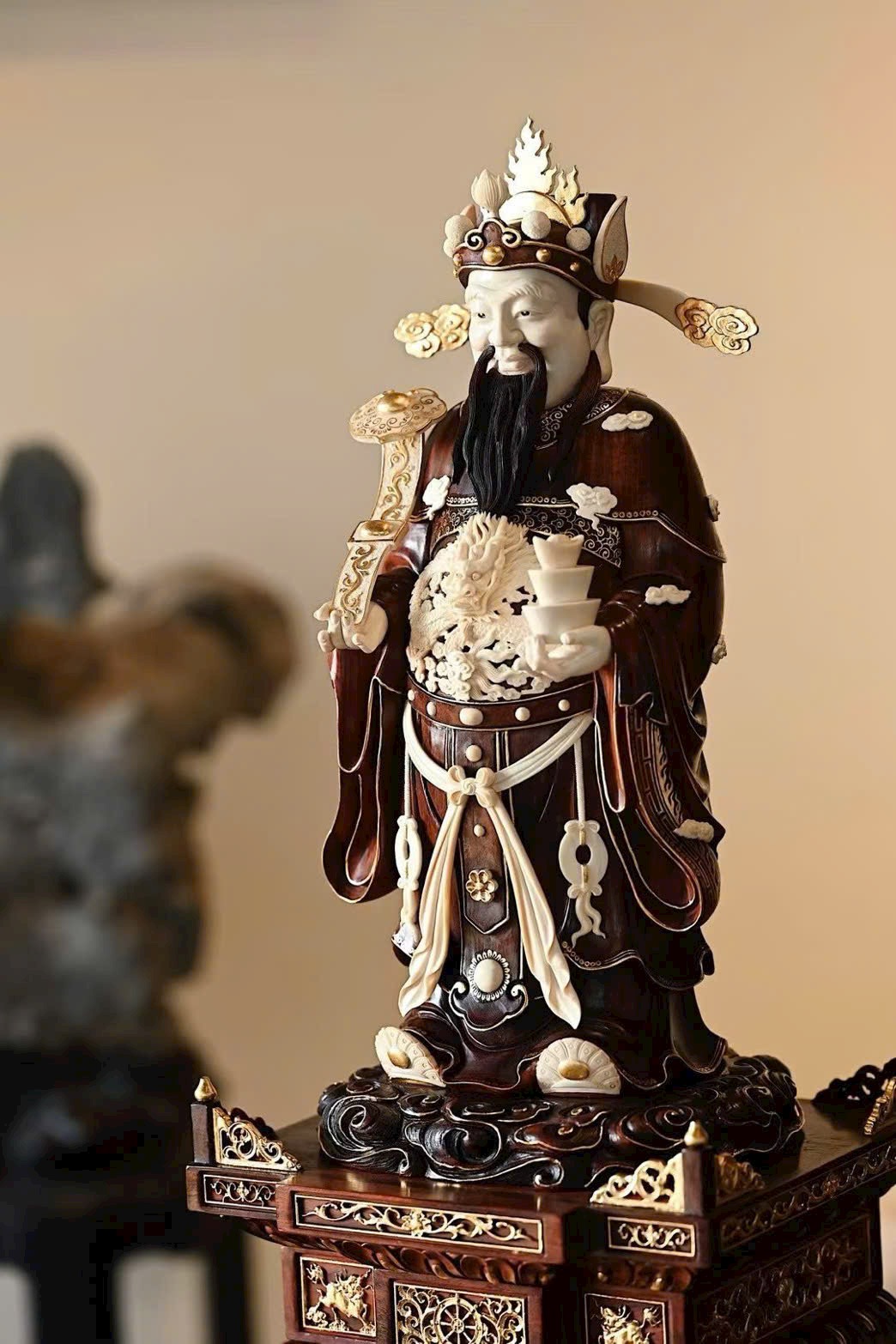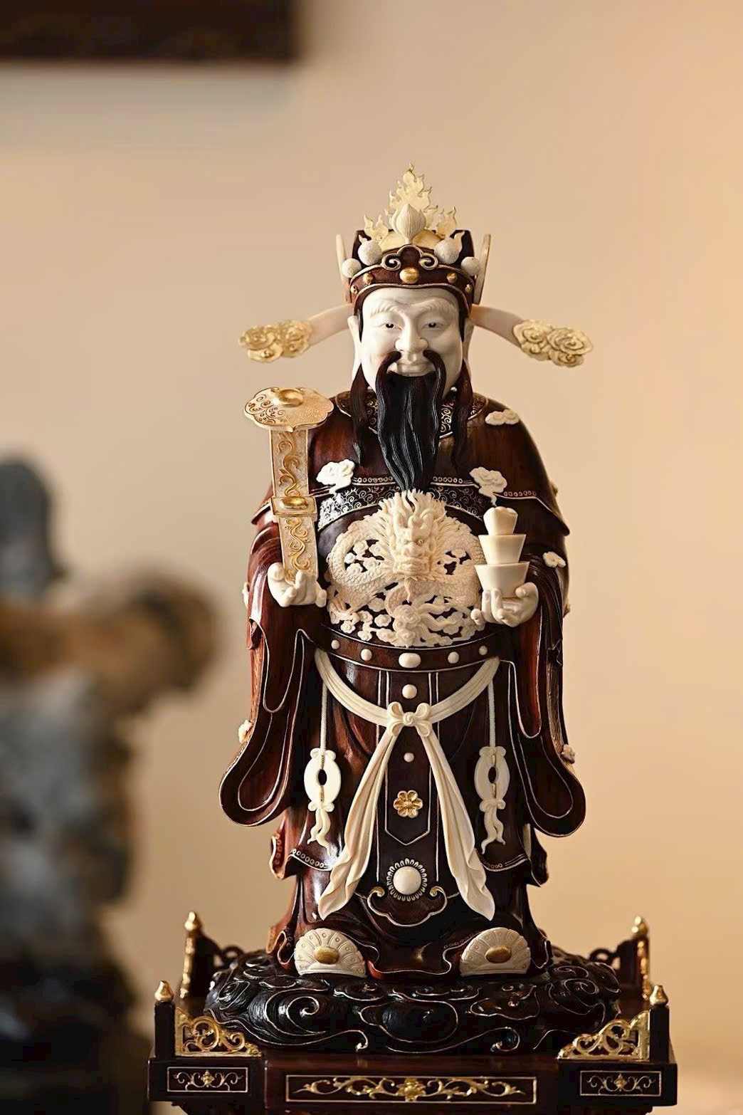 Tác phẩm được chạm khắc tinh xảo, y quan mũ ngọc, đai ngọc, như ý và nguyên bảo đều được thể hiện tự nhiên, sống động. Gương mặt khắc thần thái hiền hòa, mày mắt từ bi, nụ cười viên mãn — biểu trưng cho tích tài tụ bảo, phú quý cát tường.