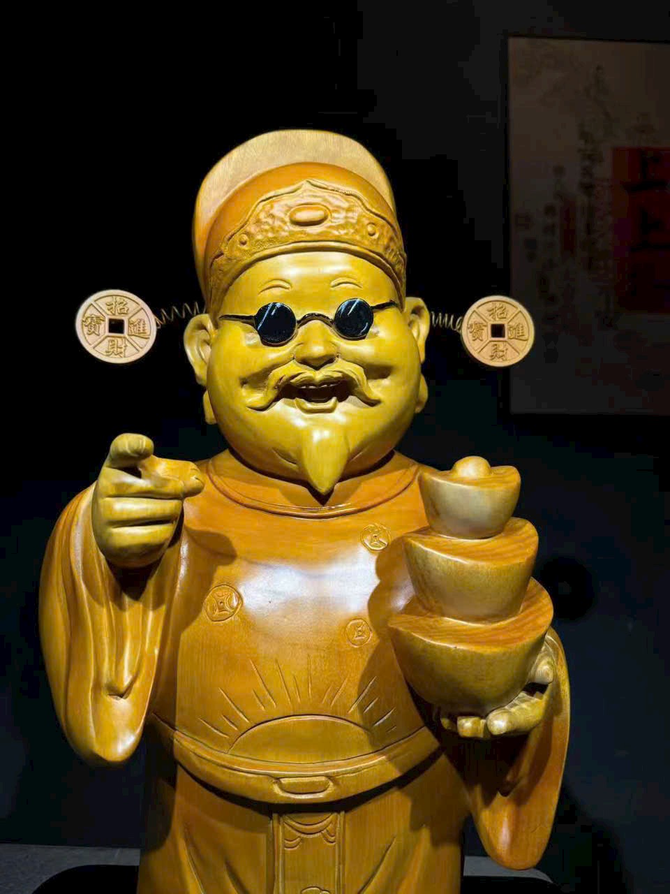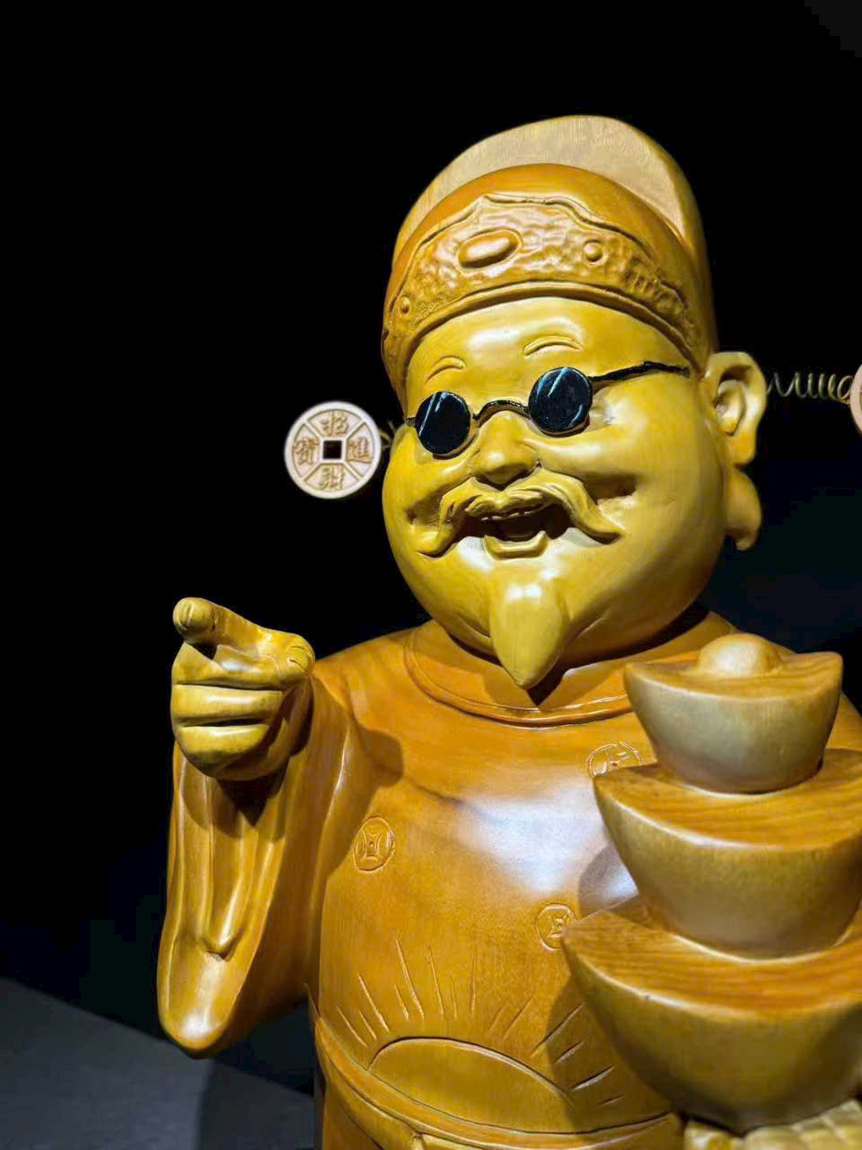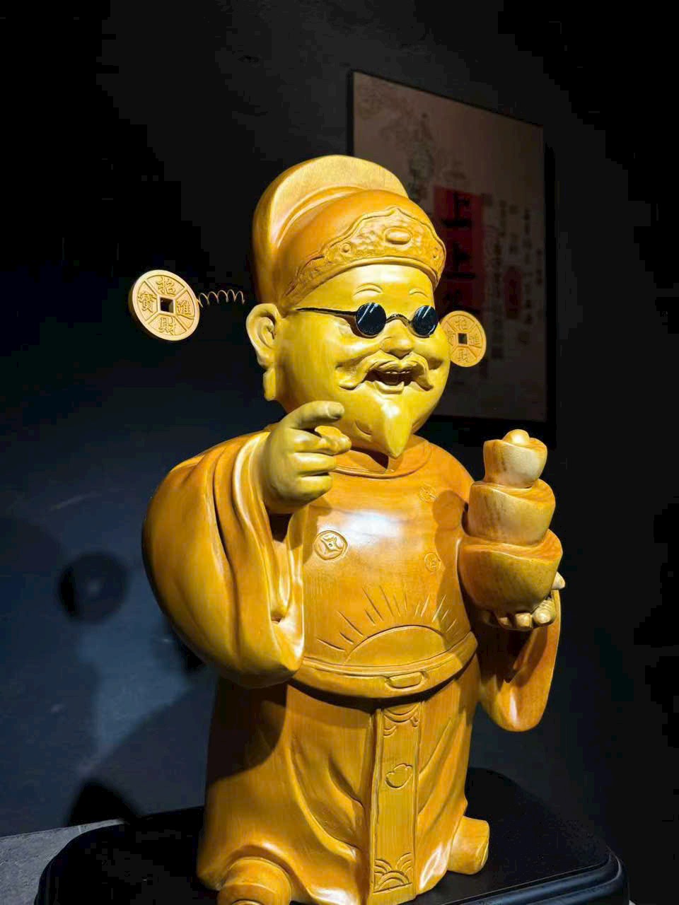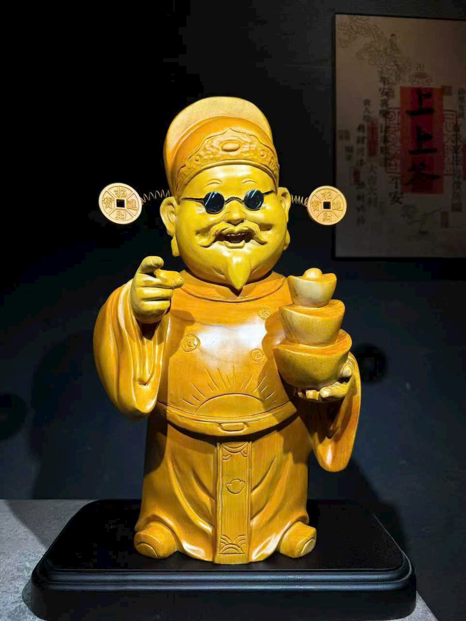 - Tạo hình vui tươi, mang ý nghĩa ai chỉ – người đó phát tài. Tác phẩm tượng trưng cho đại tài tiểu tài đều tụ, chính tài hoạnh tài cùng đến, gửi lời chúc mừng phát tài – vượng lộc quanh năm, rất phù hợp trưng bày tại cửa hàng, văn phòng, quầy thu ngân để chiêu tài hút lộc.