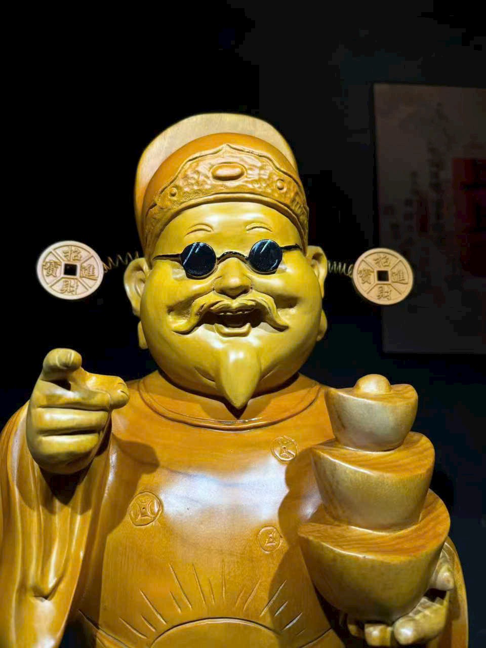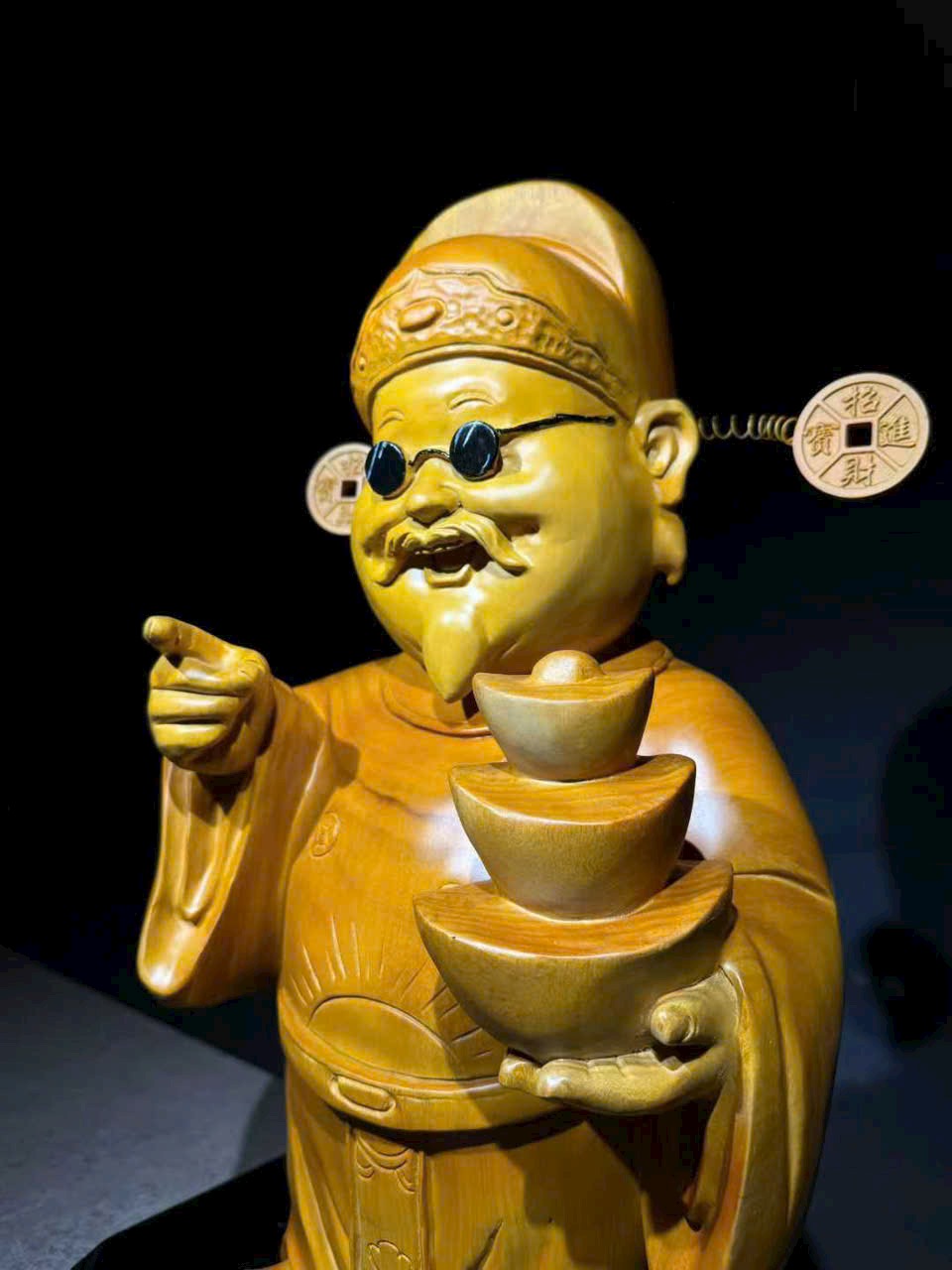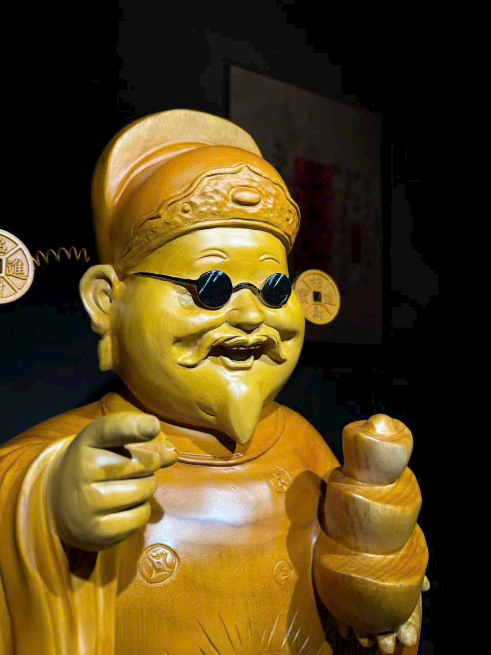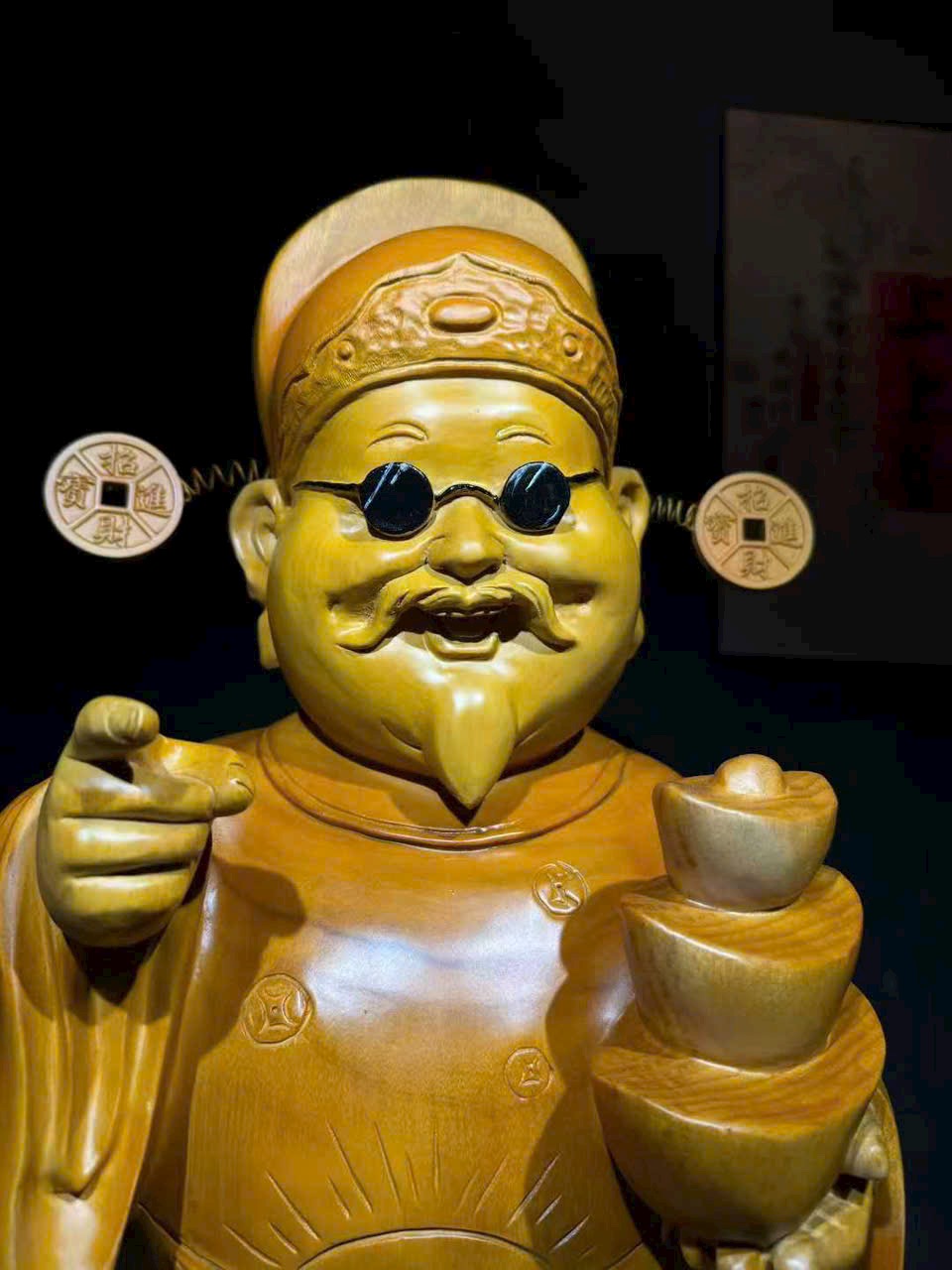 - Tạo hình vui tươi, mang ý nghĩa ai chỉ – người đó phát tài. Tác phẩm tượng trưng cho đại tài tiểu tài đều tụ, chính tài hoạnh tài cùng đến, gửi lời chúc mừng phát tài – vượng lộc quanh năm, rất phù hợp trưng bày tại cửa hàng, văn phòng, quầy thu ngân để chiêu tài hút lộc.