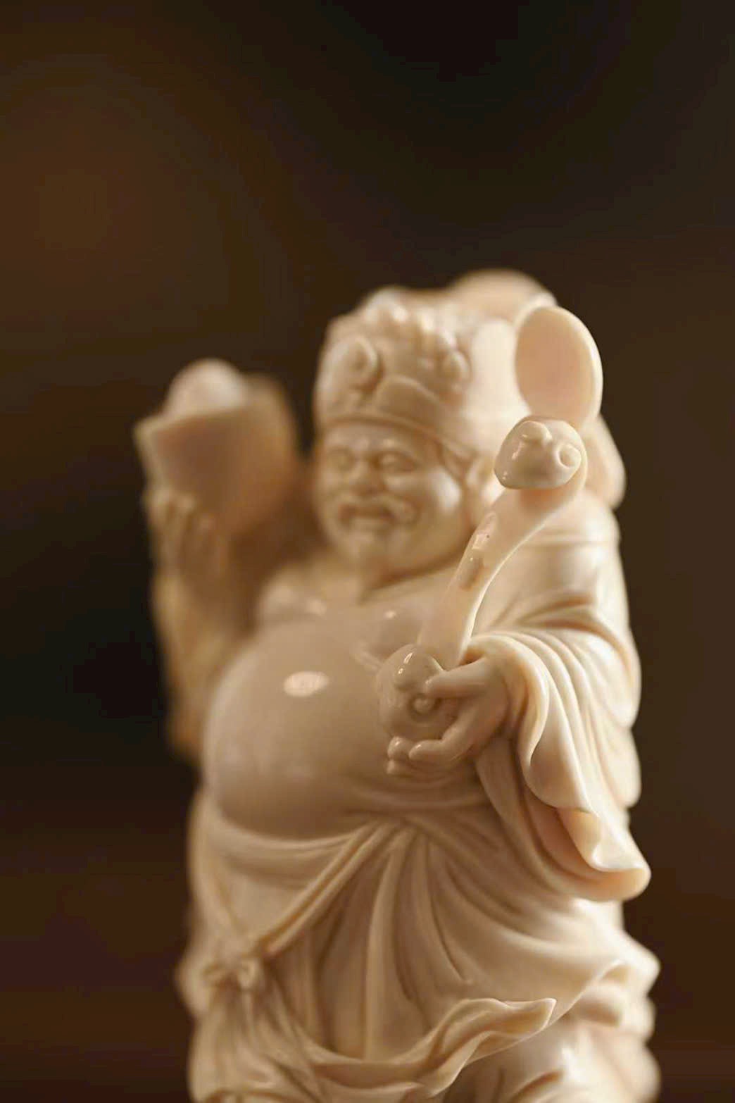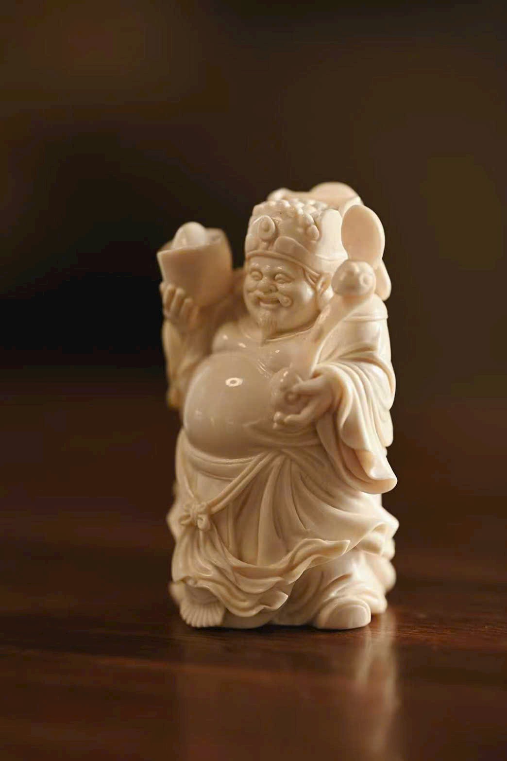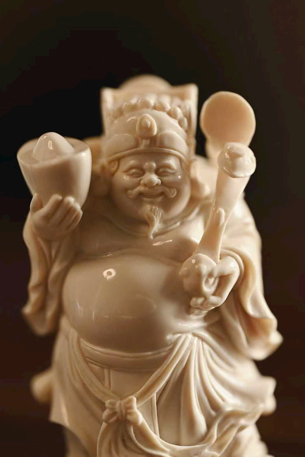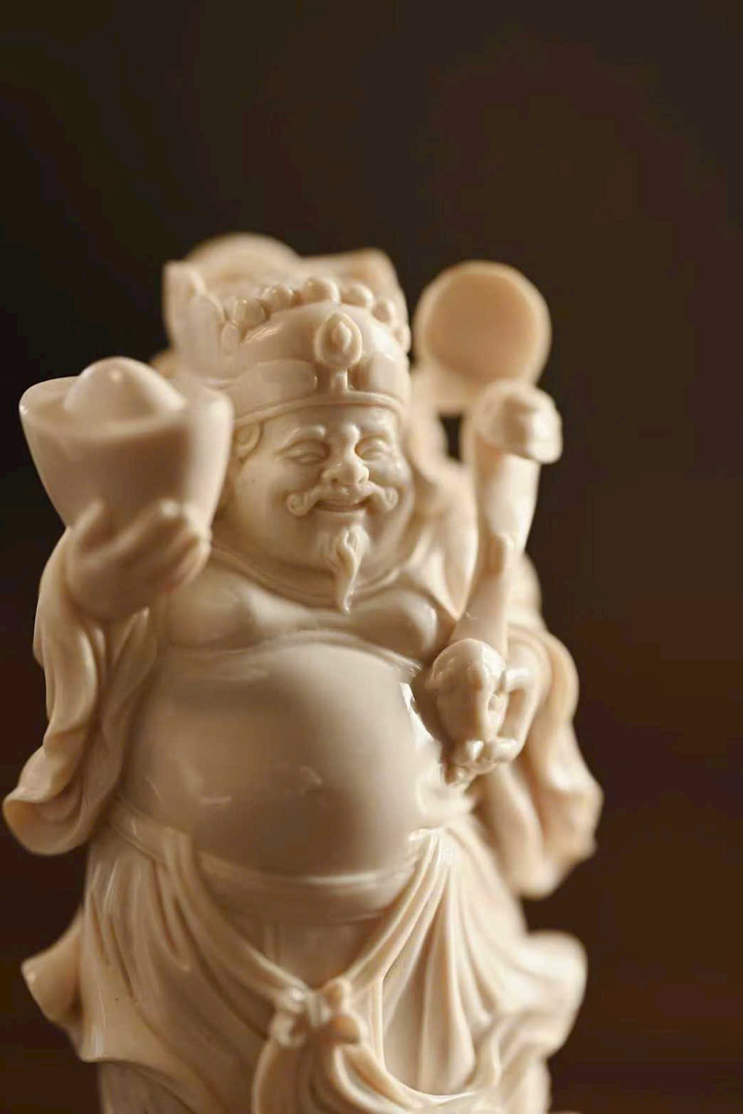 Chất liệu mịn chắc, tượng Thần Tài mở tướng từ hòa hỉ lạc, gương mặt đầy đặn như trăng rằm, thần sắc thư thái. Y bào như bay theo gió, tay ôm thỏi vàng và như ý, khí tượng chiêu tài nạp phúc hiện rõ, mang ý nghĩa tài lộc hanh thông – tài nguyên quảng tiến.
