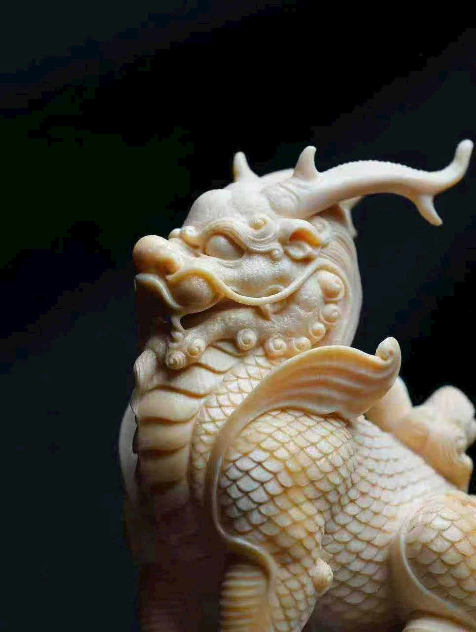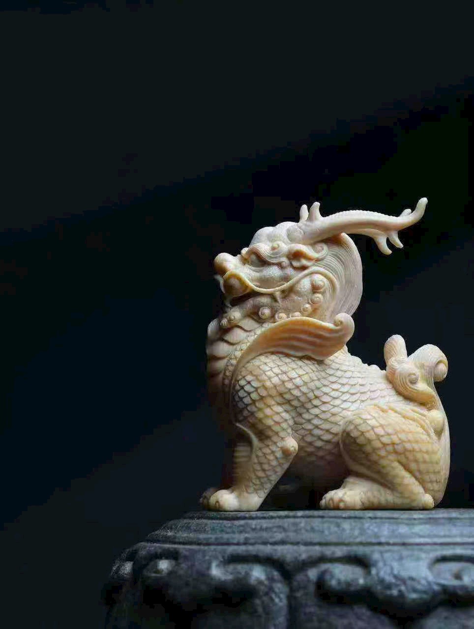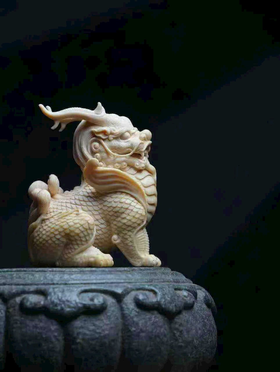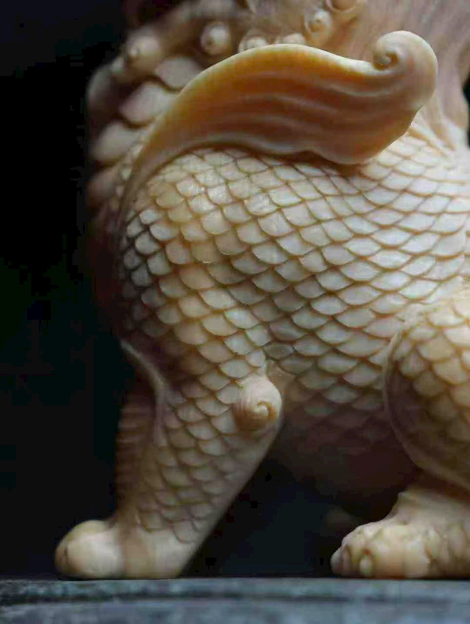 Tác phẩm khắc họa hình tượng kỳ lân ngẩng đầu ngồi trang nghiêm, khí thái thanh nhã. Ngũ quan được thể hiện bằng những đường khắc chìm giản lược nhưng tinh tế. Lồng ngực nở rõ, từng phiến giáp kỳ lân được thể hiện sắc nét, tầng lớp phân minh, tạo nên cảm giác mạnh mẽ mà uy nghi.