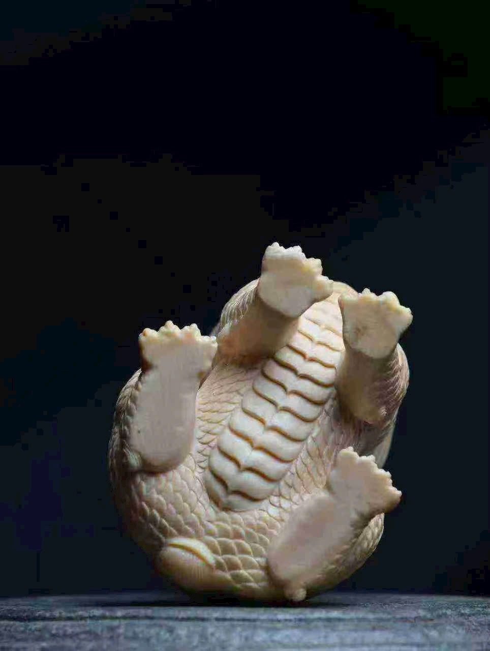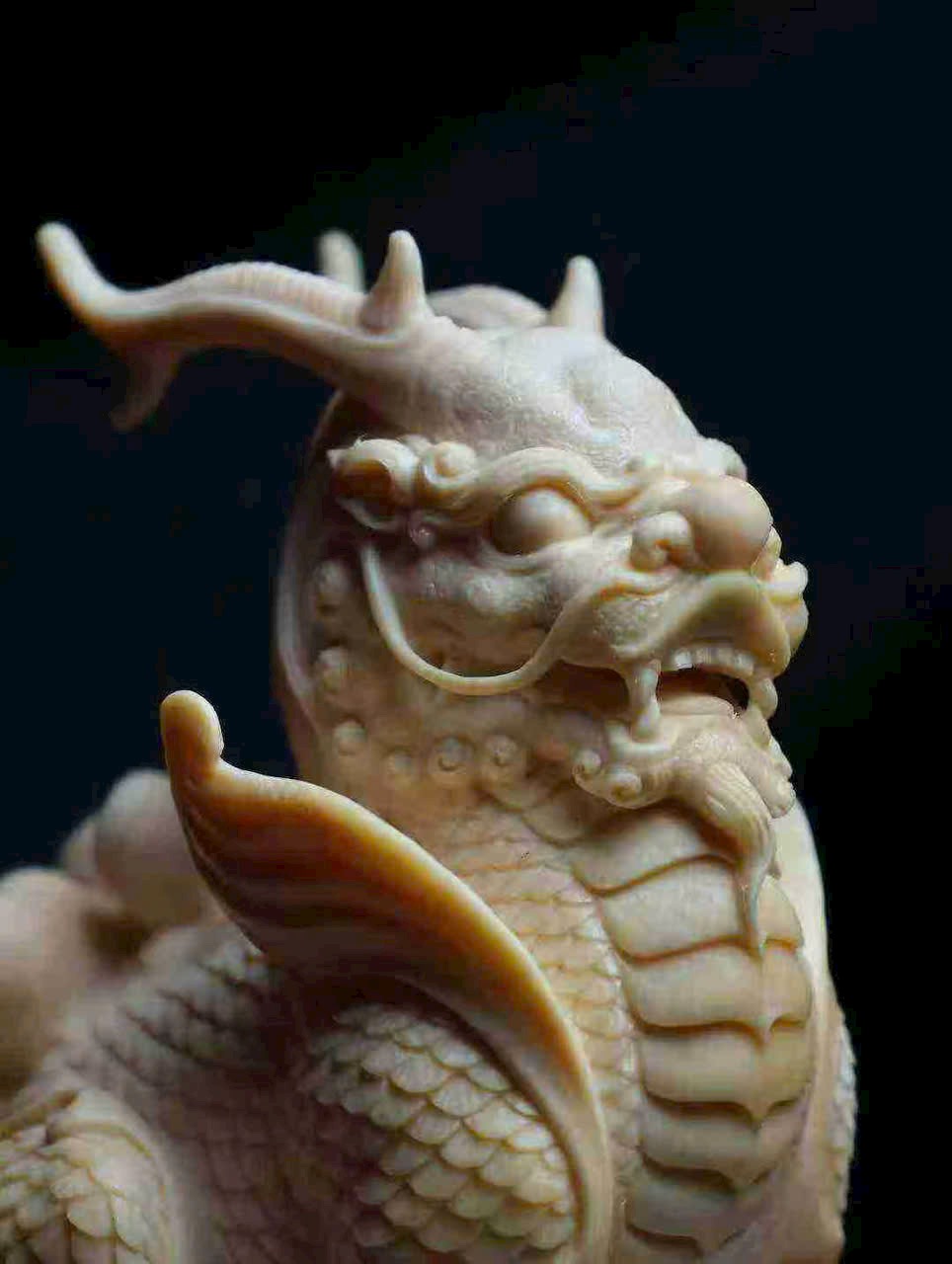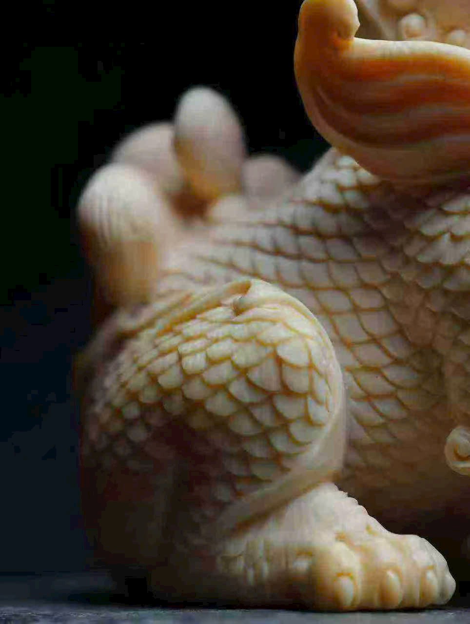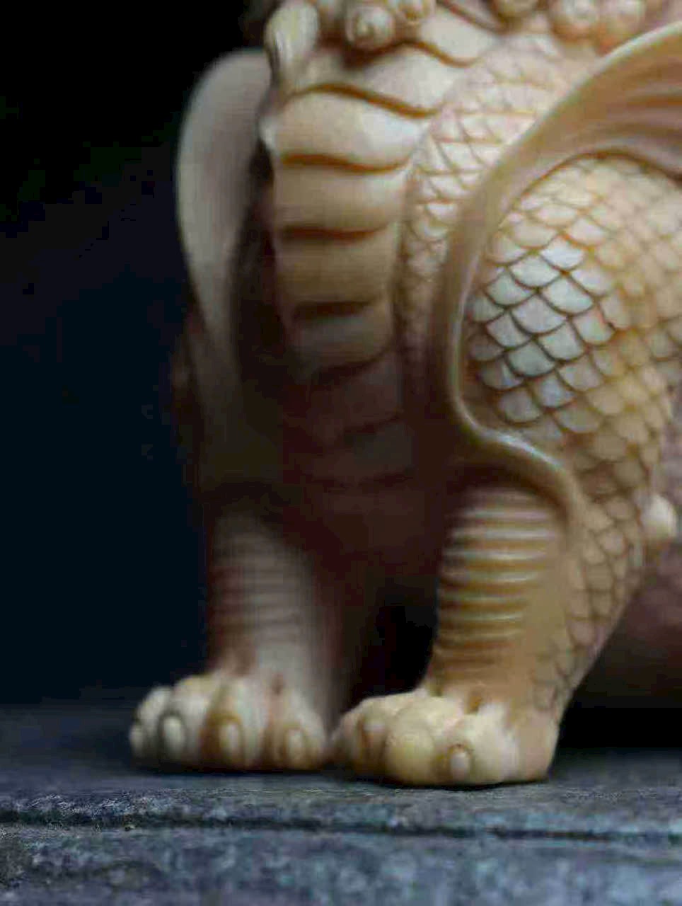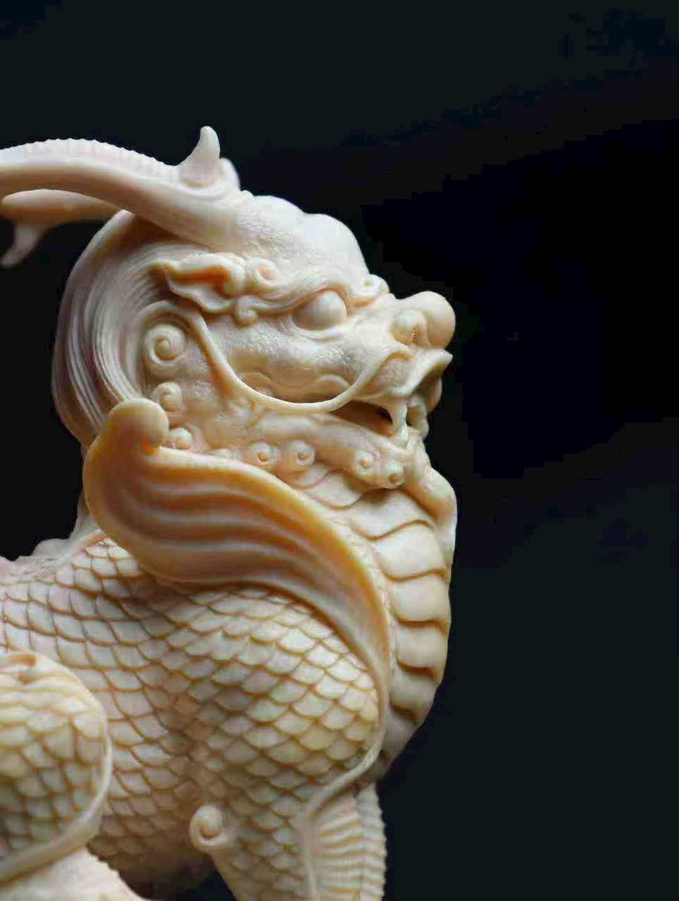 Tác phẩm khắc họa hình tượng kỳ lân ngẩng đầu ngồi trang nghiêm, khí thái thanh nhã. Ngũ quan được thể hiện bằng những đường khắc chìm giản lược nhưng tinh tế. Lồng ngực nở rõ, từng phiến giáp kỳ lân được thể hiện sắc nét, tầng lớp phân minh, tạo nên cảm giác mạnh mẽ mà uy nghi.