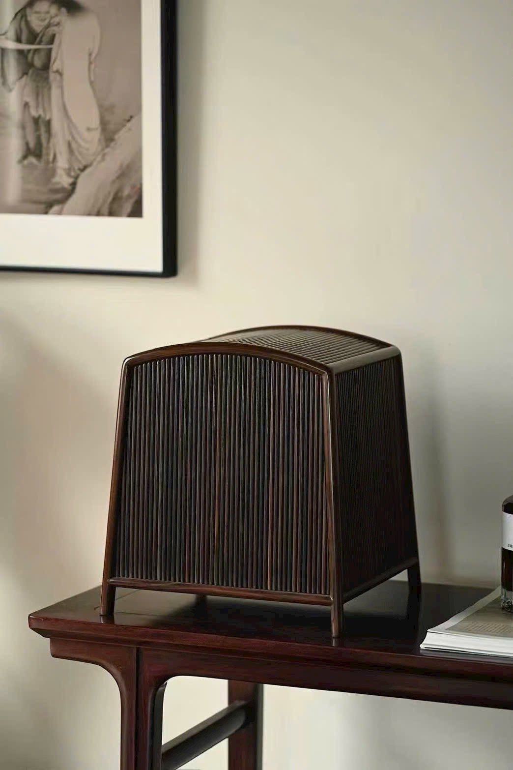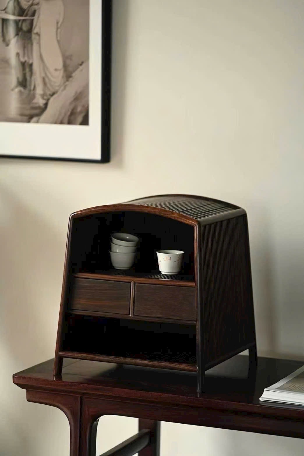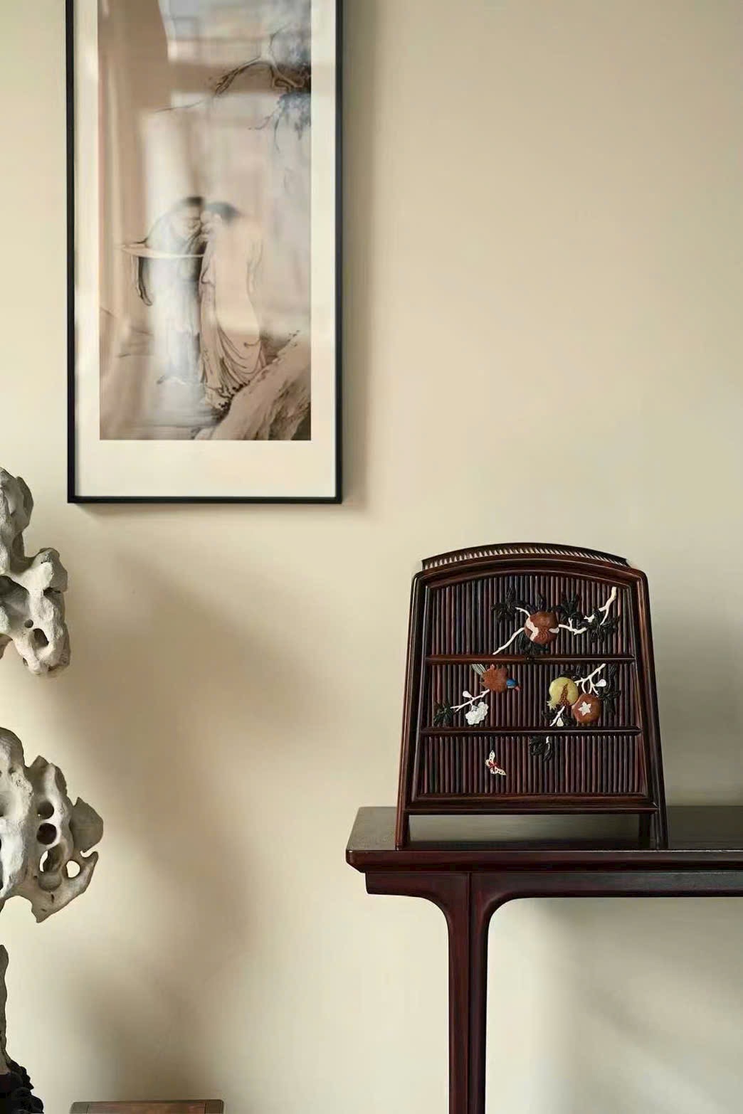 Dáng hộp giản dị mà khác biệt, bên trong có vách ngăn tiện dụng. Mặt hộp khảm bách bảo hình quả lựu chín, cành lá quấn quyện, bố cục thoáng đạt – hài hòa. Phù hợp cất giữ trà cụ, trà khô…, gửi gắm ý nghĩa phú quý, cát tường tốt đẹp.