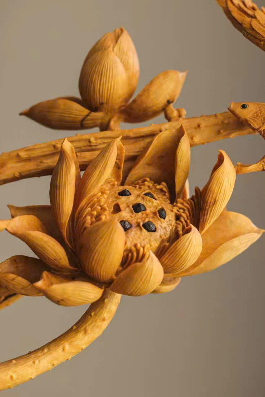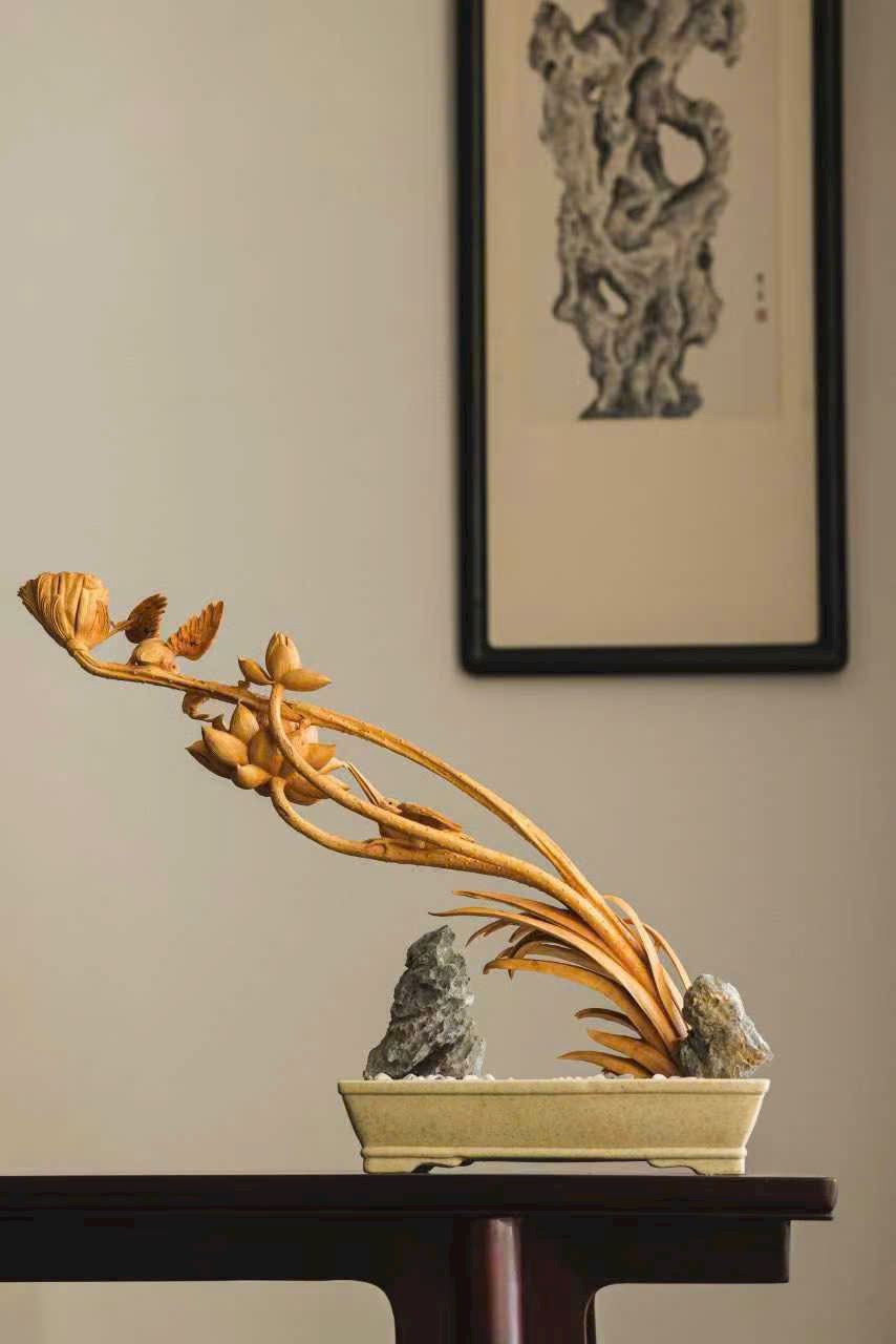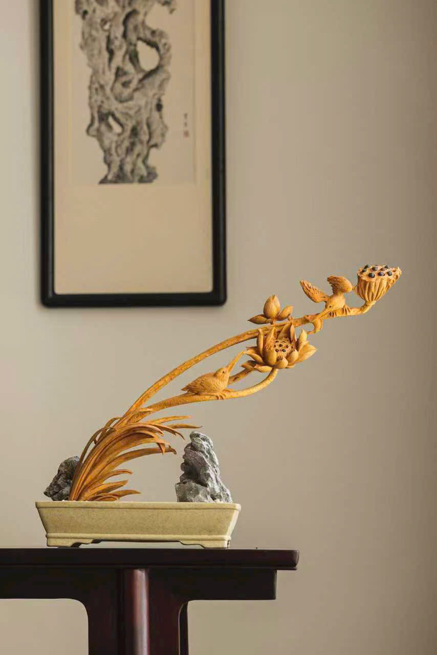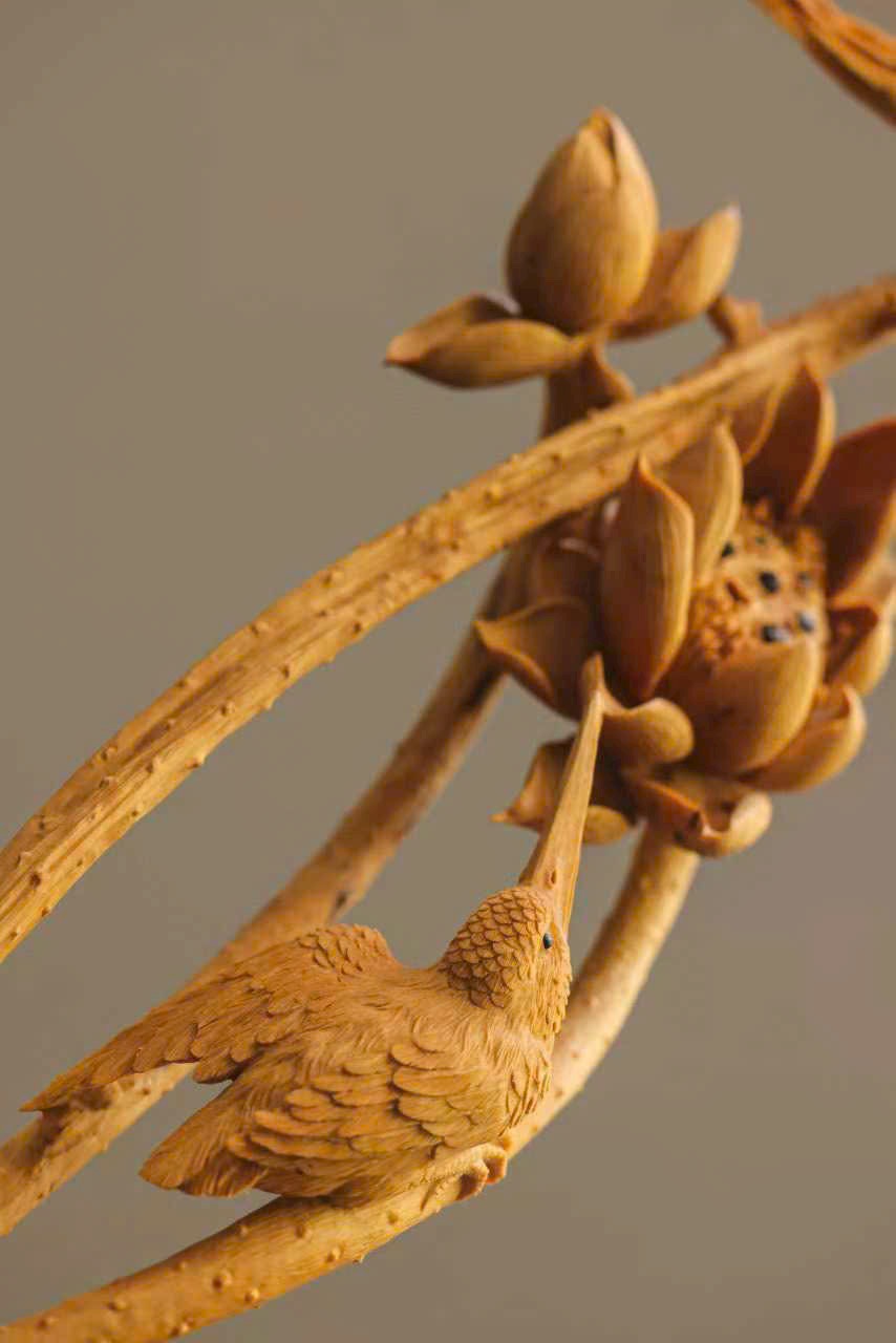 Tượng khắc từ gỗ hoàng dương, từng cánh sen được chạm khắc tỉ mỉ, đường vân rõ nét như thật; chim nhỏ khẽ đậu, thần thái sinh động tựa linh vật giáng phúc. Sen thanh tượng trưng cho sự thuần khiết, linh tước mang điềm lành, tác phẩm hòa quyện nét thanh tao và tinh xảo, đem lại cảm giác an hòa, phúc lộc viên mãn cho không gian trưng bày.