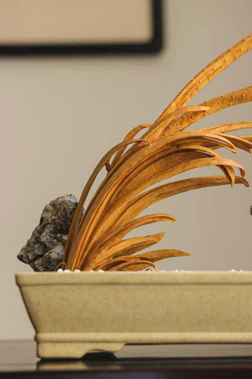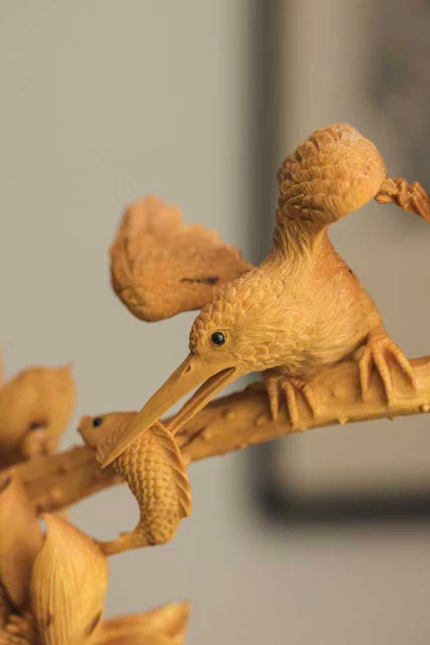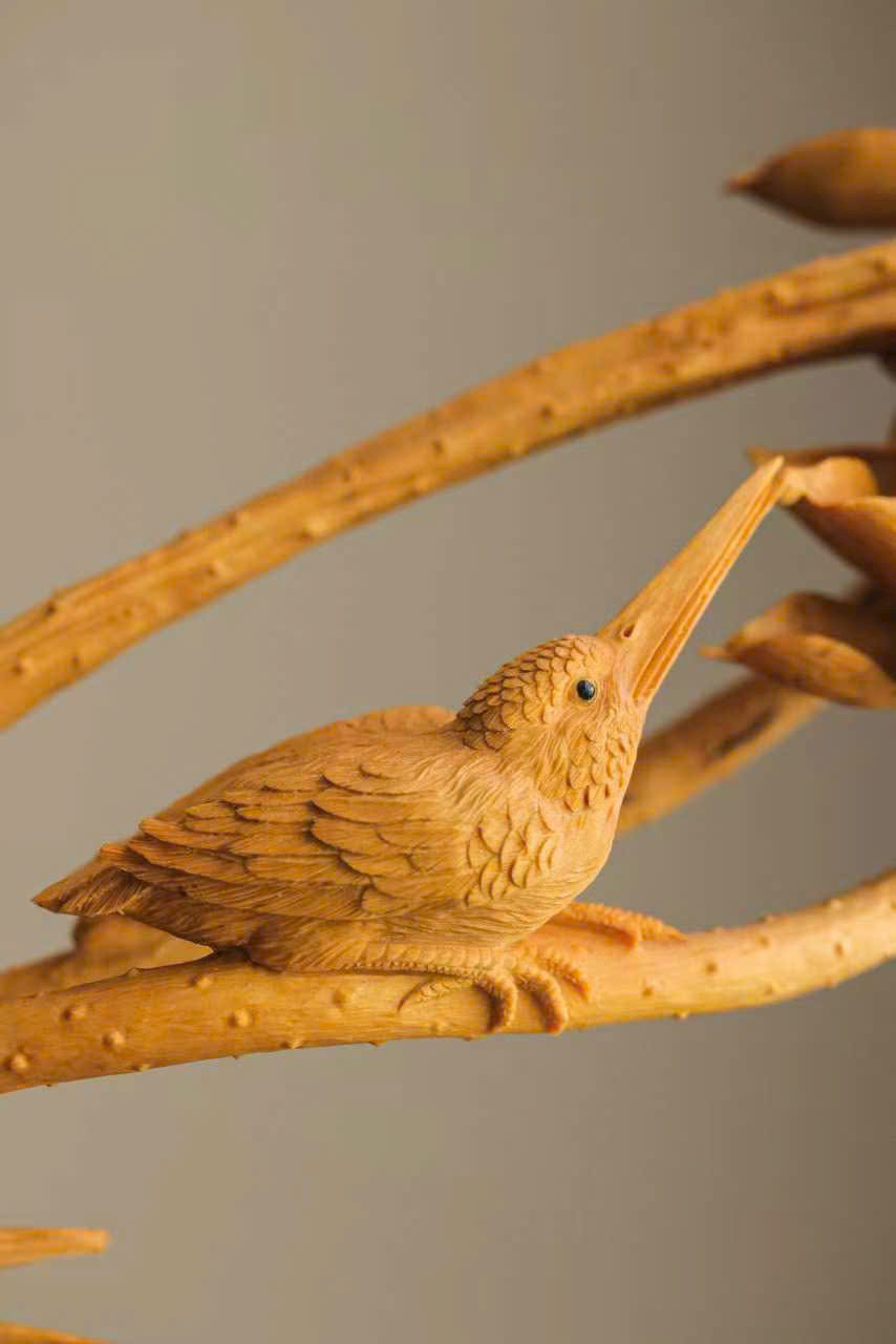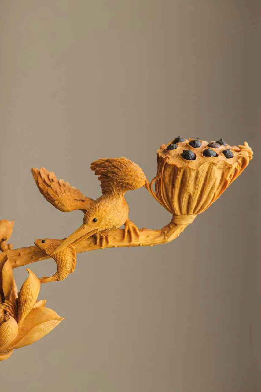 Tượng khắc từ gỗ hoàng dương, từng cánh sen được chạm khắc tỉ mỉ, đường vân rõ nét như thật; chim nhỏ khẽ đậu, thần thái sinh động tựa linh vật giáng phúc. Sen thanh tượng trưng cho sự thuần khiết, linh tước mang điềm lành, tác phẩm hòa quyện nét thanh tao và tinh xảo, đem lại cảm giác an hòa, phúc lộc viên mãn cho không gian trưng bày.