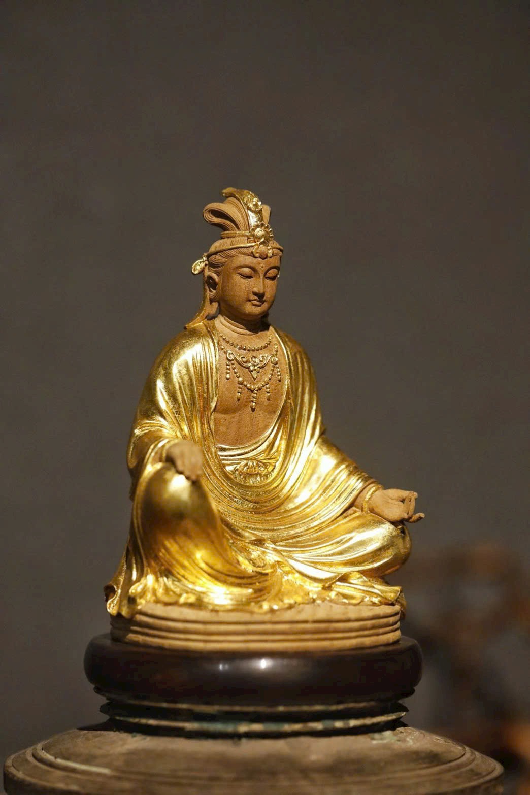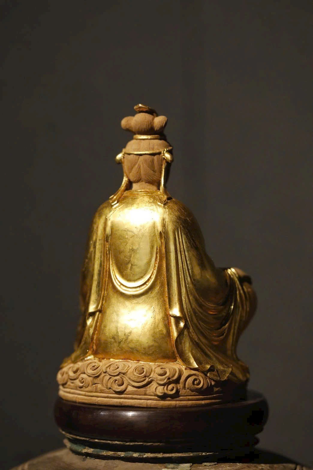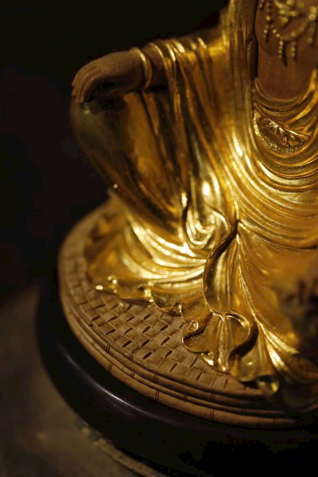 Tôn tượng Quan Âm với gương mặt từ hòa, tà y phảng phất như sóng nước; lớp vàng lá phủ thân làm nổi bật pháp tướng ôn nhu. Dáng ngồi an nhiên, chi tiết anh lạc tinh tế thanh nhã, phần đế giữ nét mộc mạc càng làm bật lên thiền ý tĩnh lặng, sâu xa.