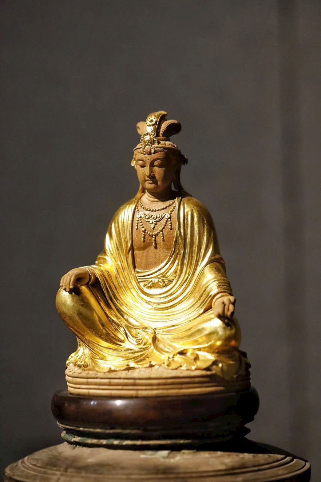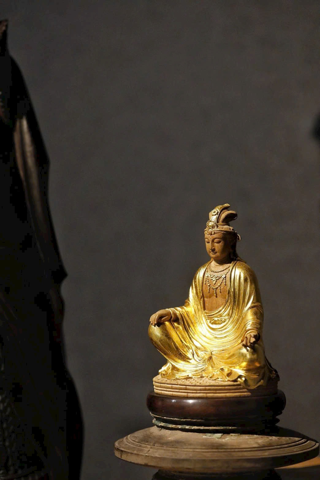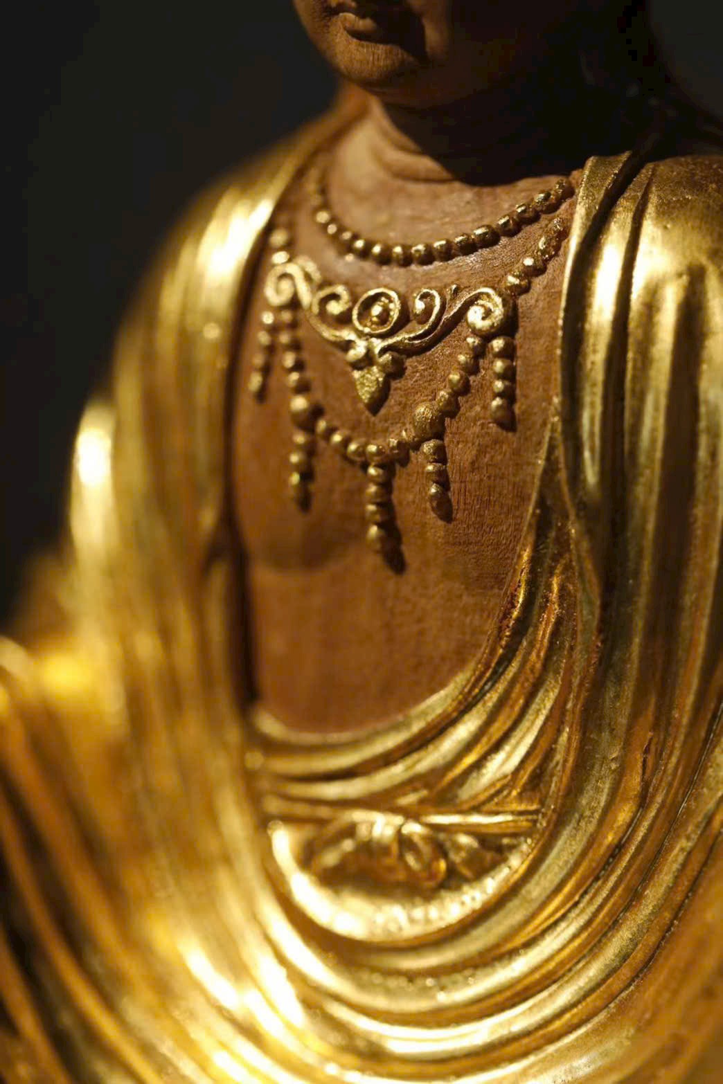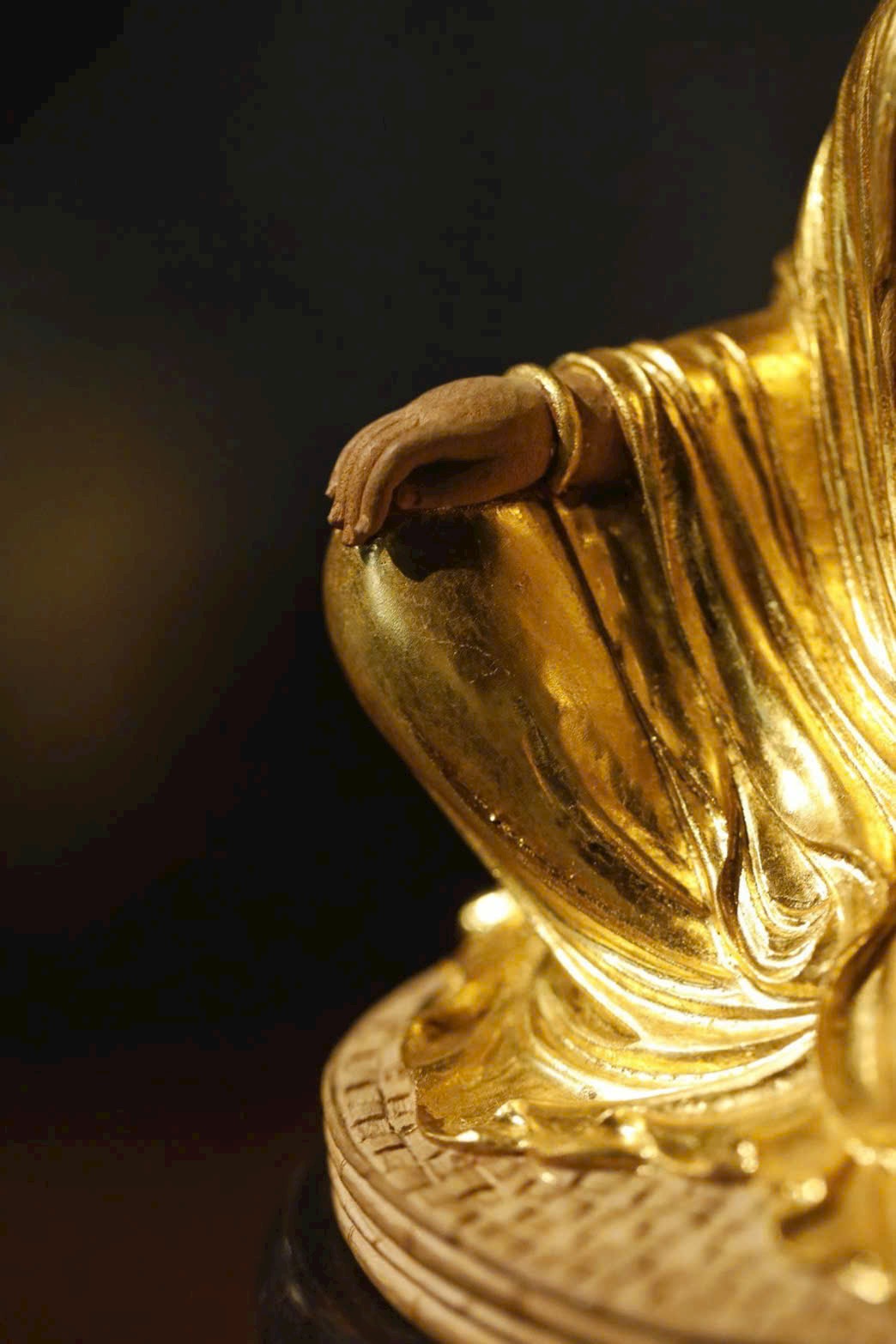 Tôn tượng Quan Âm với gương mặt từ hòa, tà y phảng phất như sóng nước; lớp vàng lá phủ thân làm nổi bật pháp tướng ôn nhu. Dáng ngồi an nhiên, chi tiết anh lạc tinh tế thanh nhã, phần đế giữ nét mộc mạc càng làm bật lên thiền ý tĩnh lặng, sâu xa.
