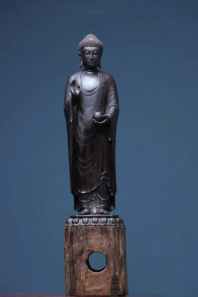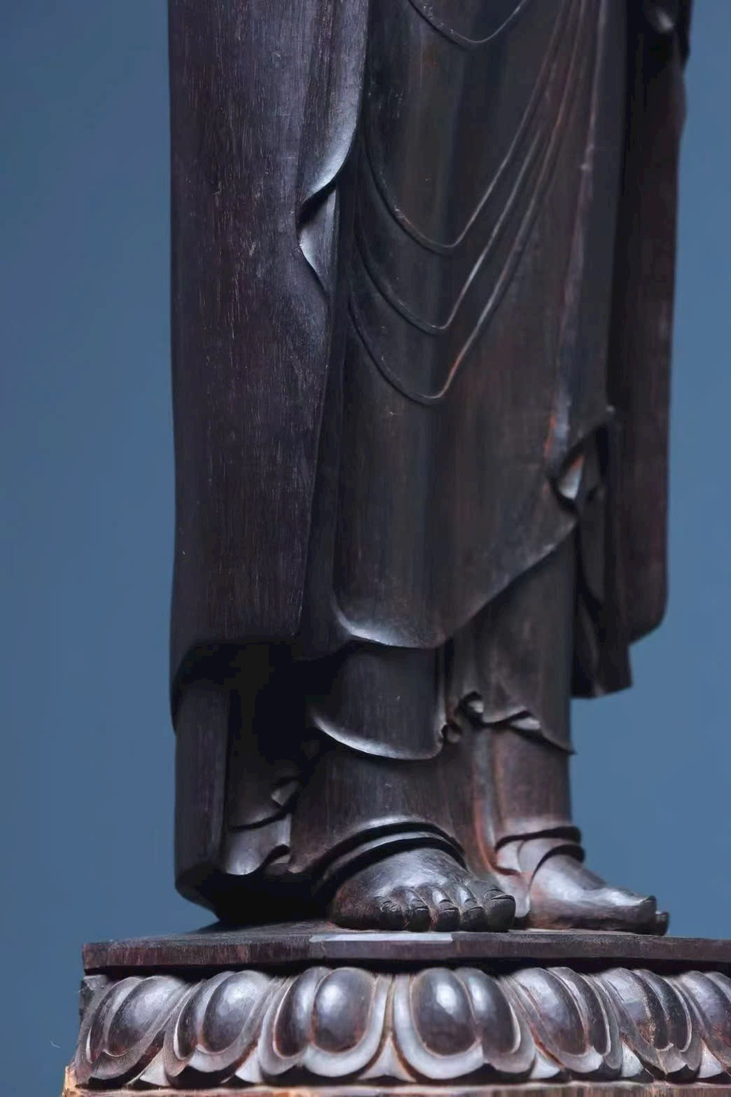 Ngài chân trần đứng trên khối tử đàn nguyên sinh chưa đẽo gọt — bố cục độc đáo, hàm chứa tư tưởng siêu thoát và tuệ giác sâu xa, gợi liên tưởng đến chí nguyện kiên định của Phật trong hành trình khổ hạnh cầu đạo, độ thoát chúng sinh.
