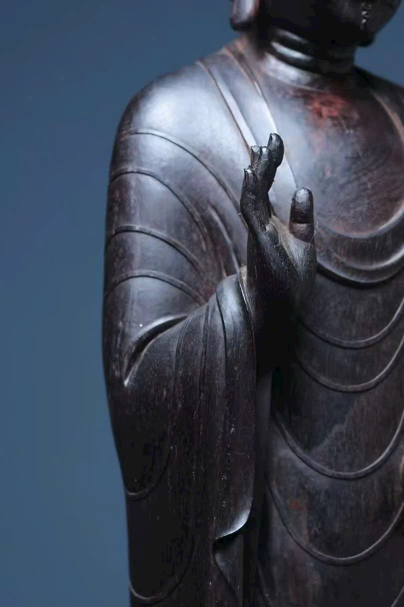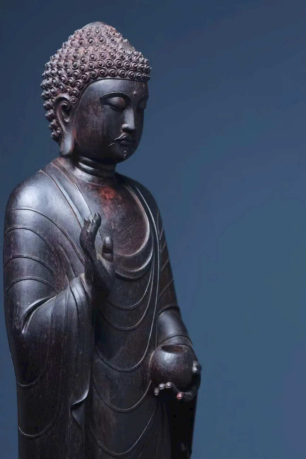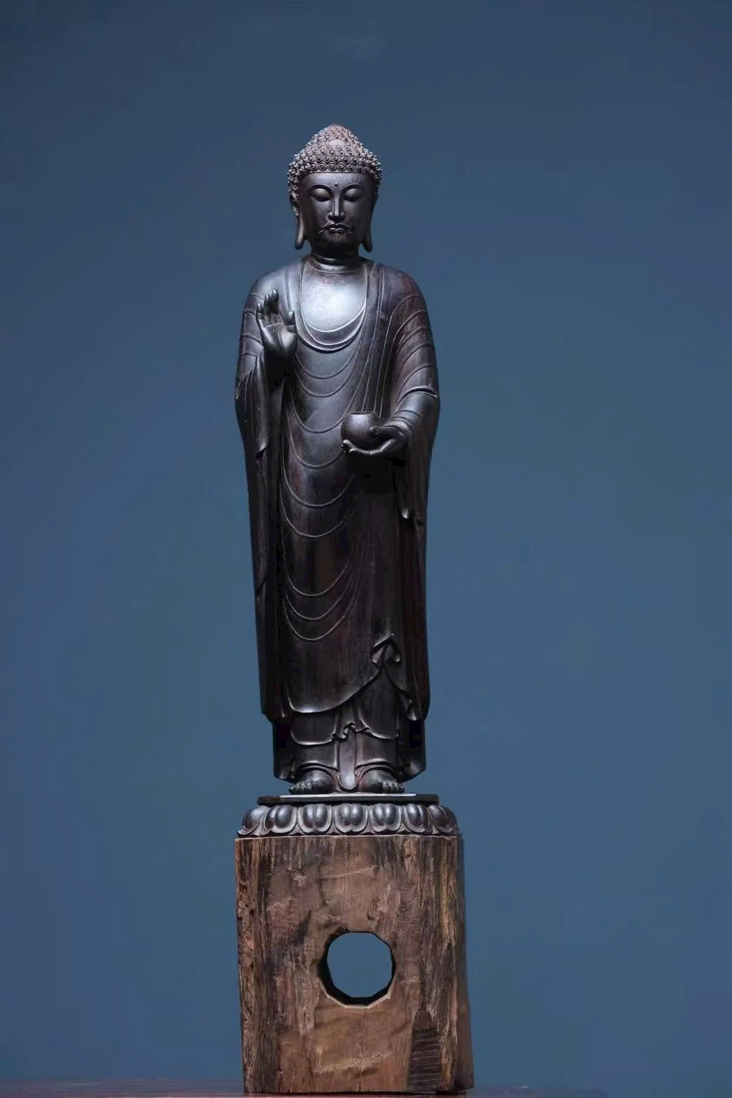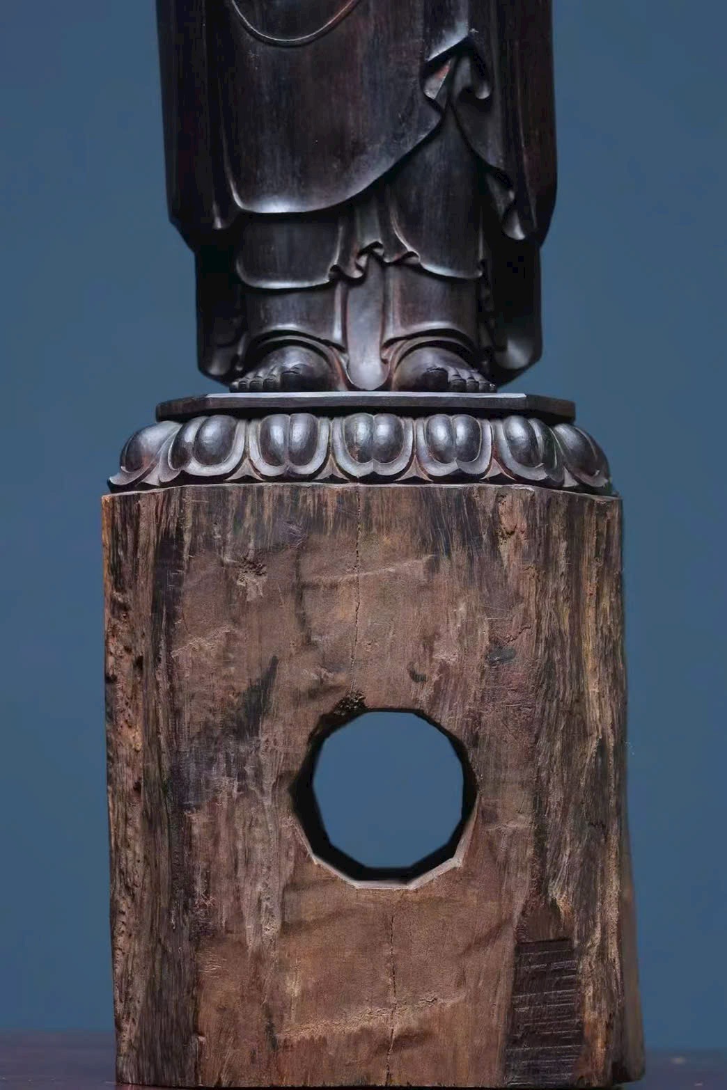 Tác phẩm tạc từ gỗ tử đàn tiểu diệp quý hiếm, lấy nguyên liệu tháo nhà xưa, hiếm có khó tìm, mang nét trầm tĩnh sâu xa và khí vận lịch sử dày dặn.
