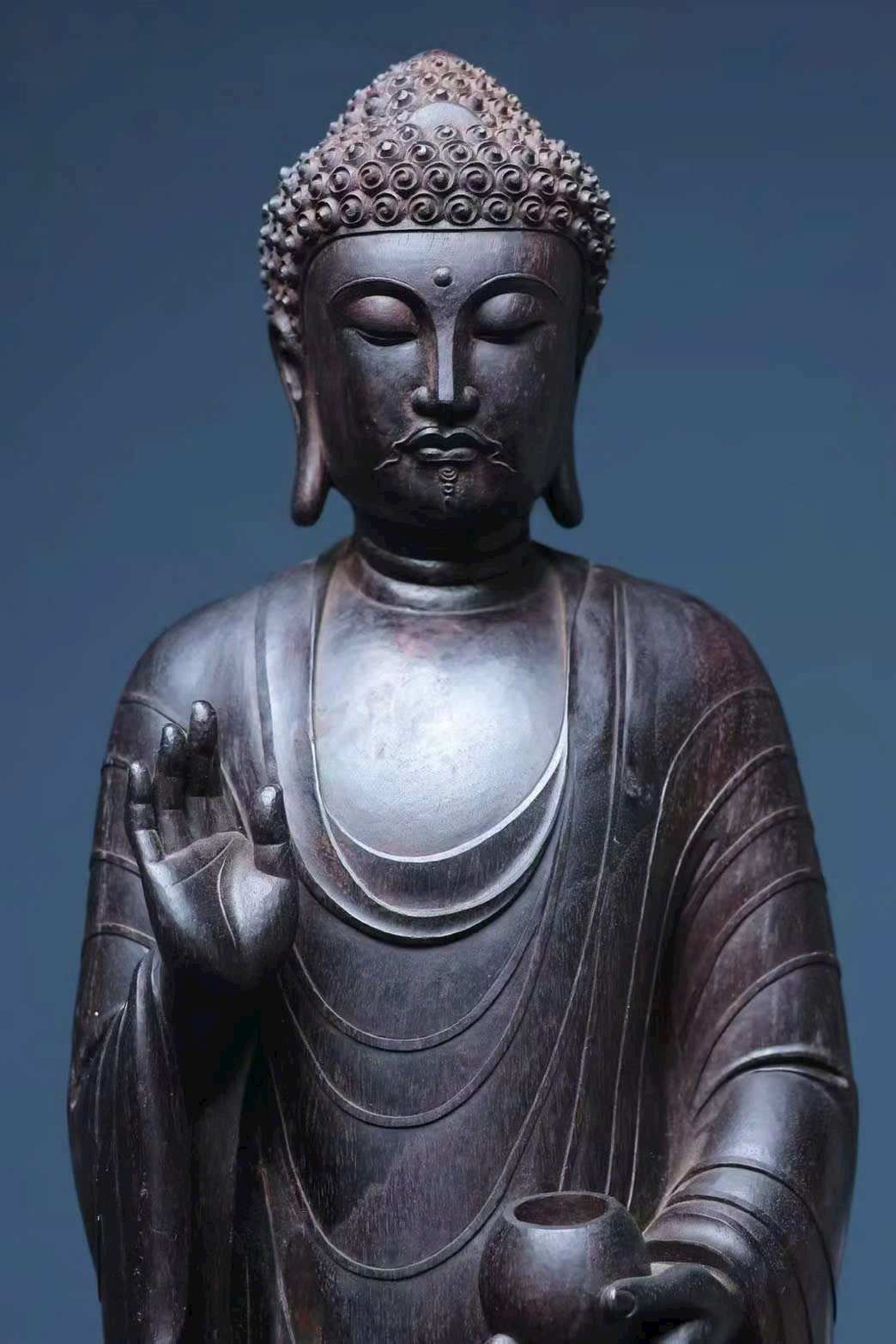 Tượng Thích Ca Mâu Ni đầu nhục kế cao, tóc xoắn ốc dày đều, sống mũi thẳng, mày cong mắt sáng, má rộng tai dài, ba nếp cổ biểu tượng phúc tướng. Điểm đặc biệt là hàng ria nhỏ thanh thoát — phong cách điêu khắc đặc trưng thời Ngụy Tấn Nam Bắc triều, gợi niềm hoài cổ thâm trầm.