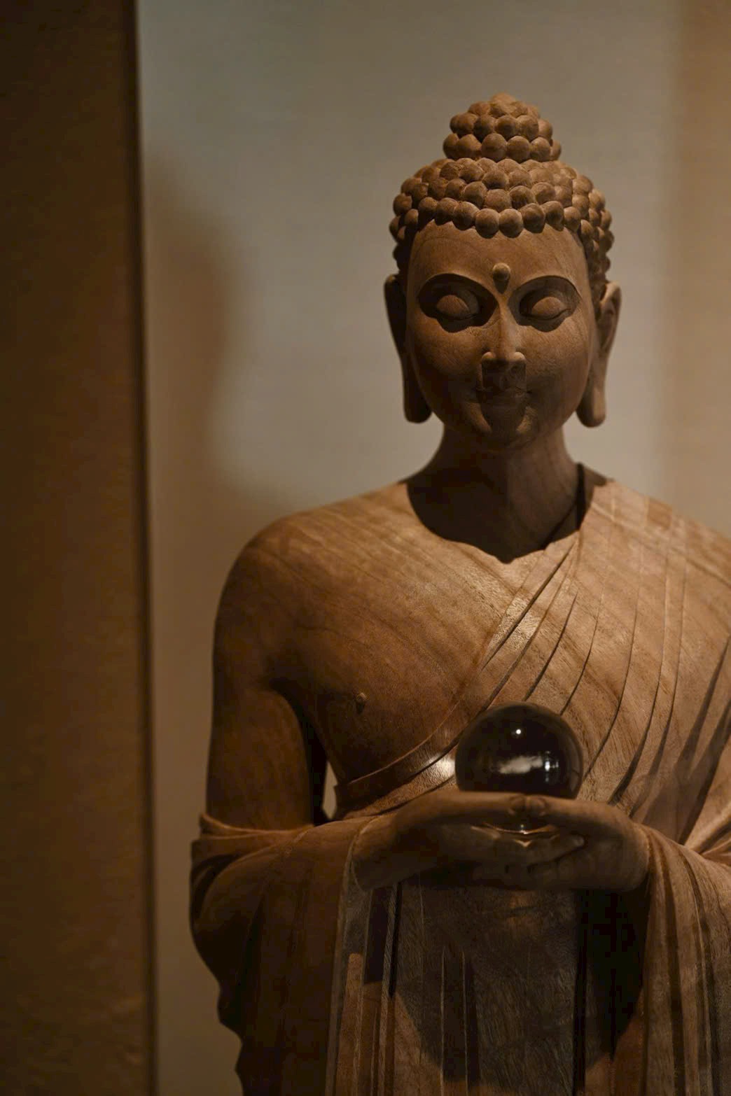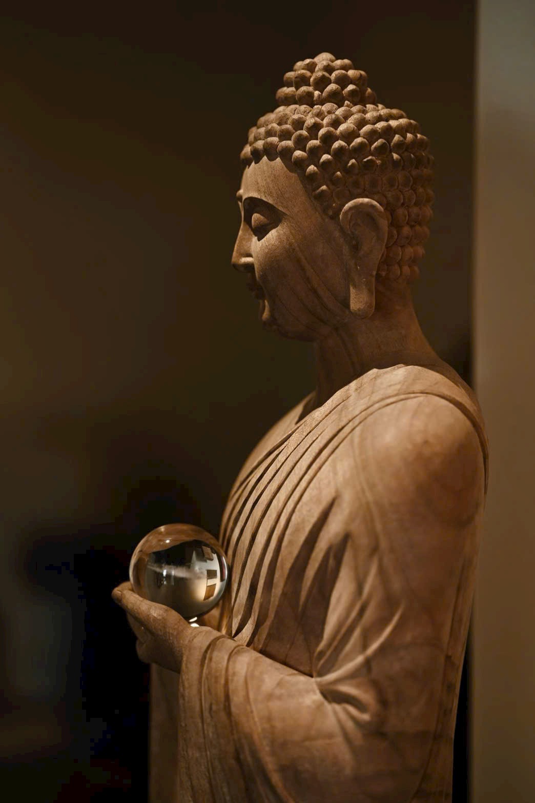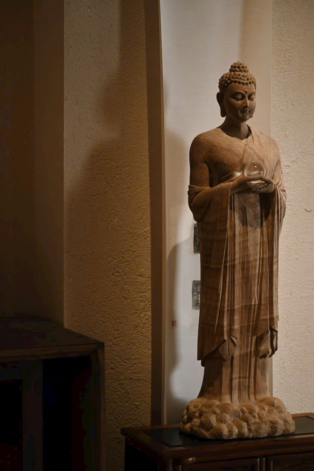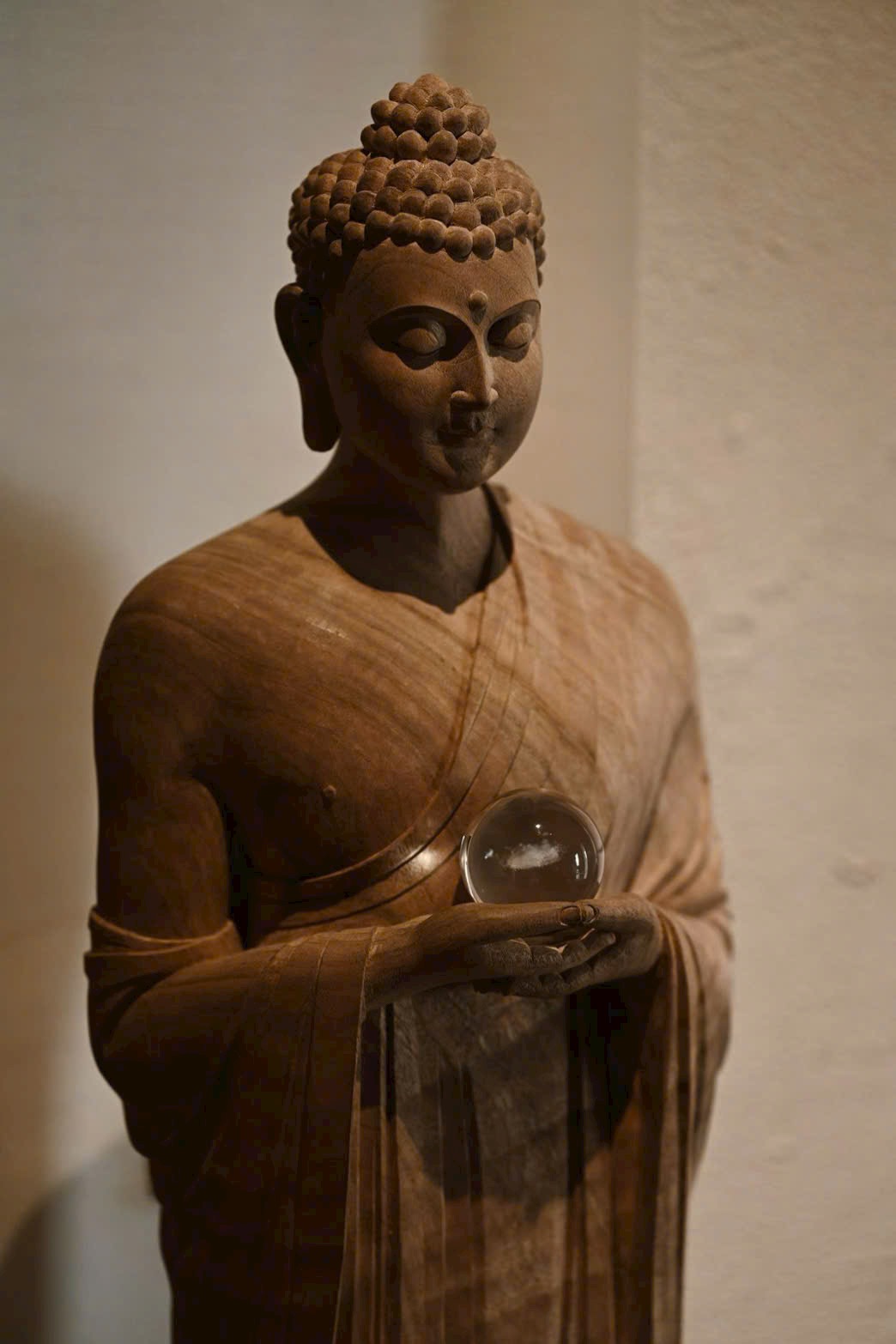 Tượng Thích Ca Mâu Ni mang thần thái ung dung rộng lượng, dáng đứng thanh nhã, ánh mắt hơi khép như đang từ bi nhìn xuống muôn loài chúng sinh. Hai tay nâng bảo châu, thế đứng tự tại; nếp áo buông rủ mềm mại, hài hòa giữa trí tuệ và thiện lành, toát lên khí chất thù thắng, cát tường.