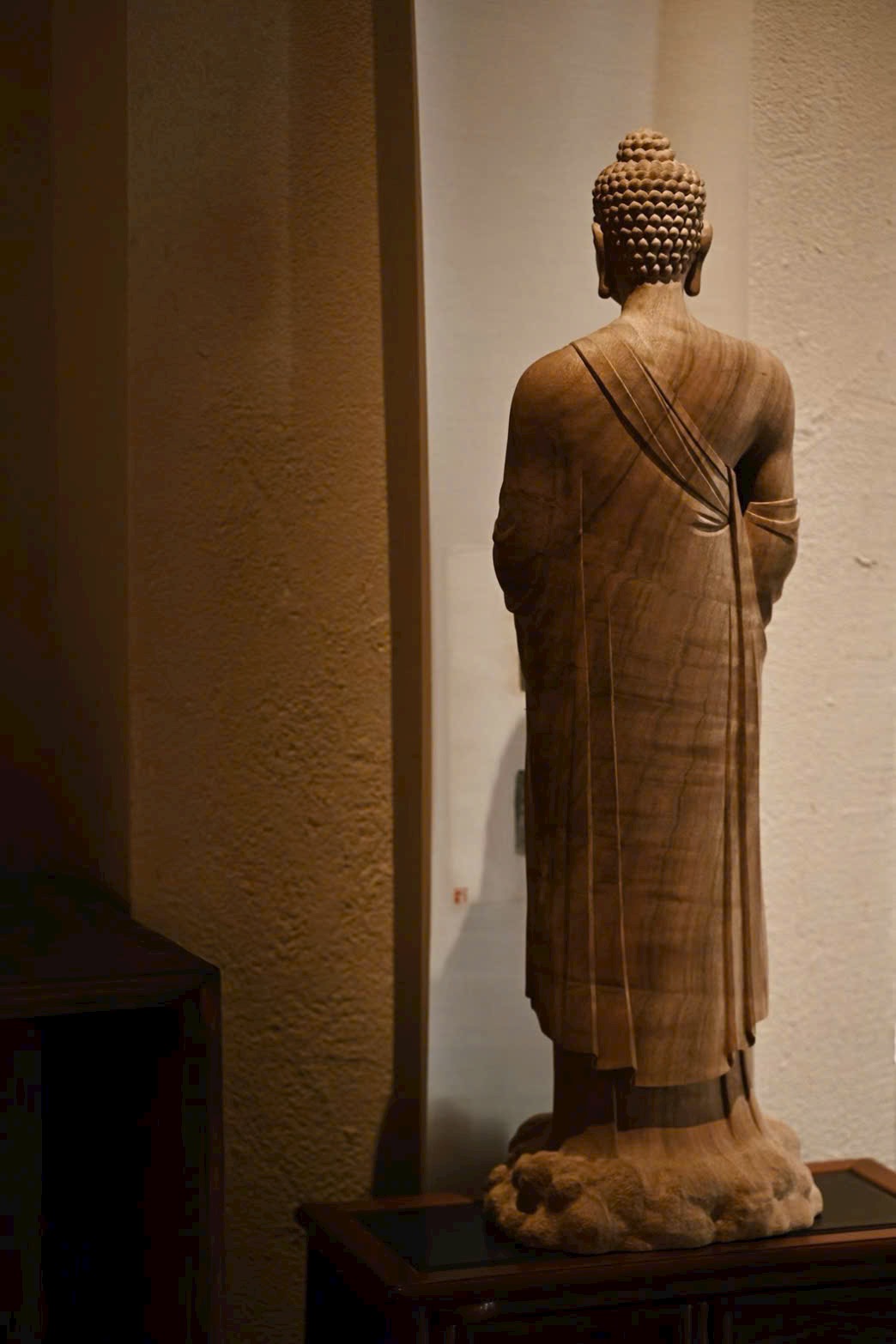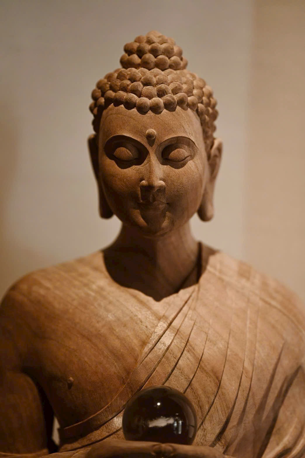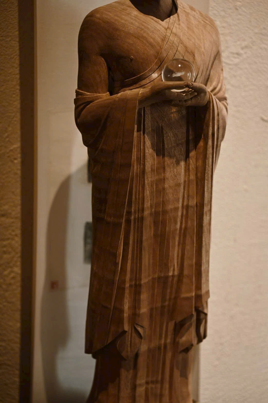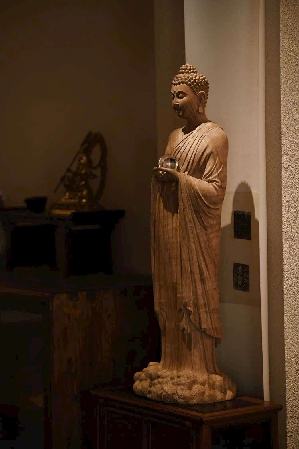 Tượng Thích Ca Mâu Ni mang thần thái ung dung rộng lượng, dáng đứng thanh nhã, ánh mắt hơi khép như đang từ bi nhìn xuống muôn loài chúng sinh. Hai tay nâng bảo châu, thế đứng tự tại; nếp áo buông rủ mềm mại, hài hòa giữa trí tuệ và thiện lành, toát lên khí chất thù thắng, cát tường.