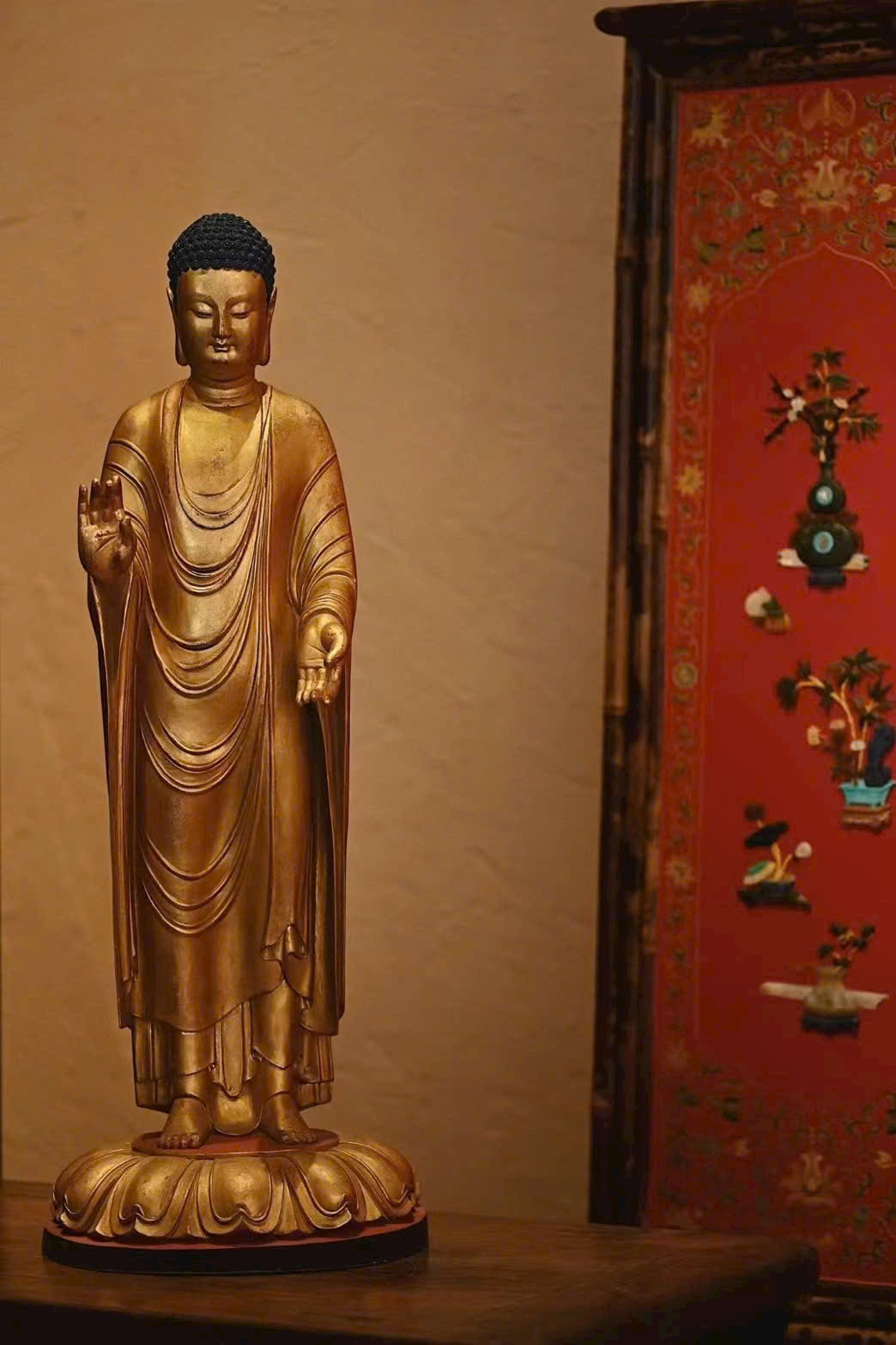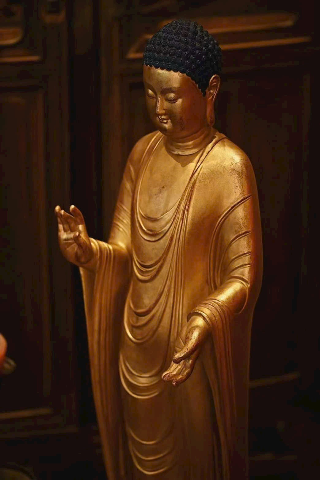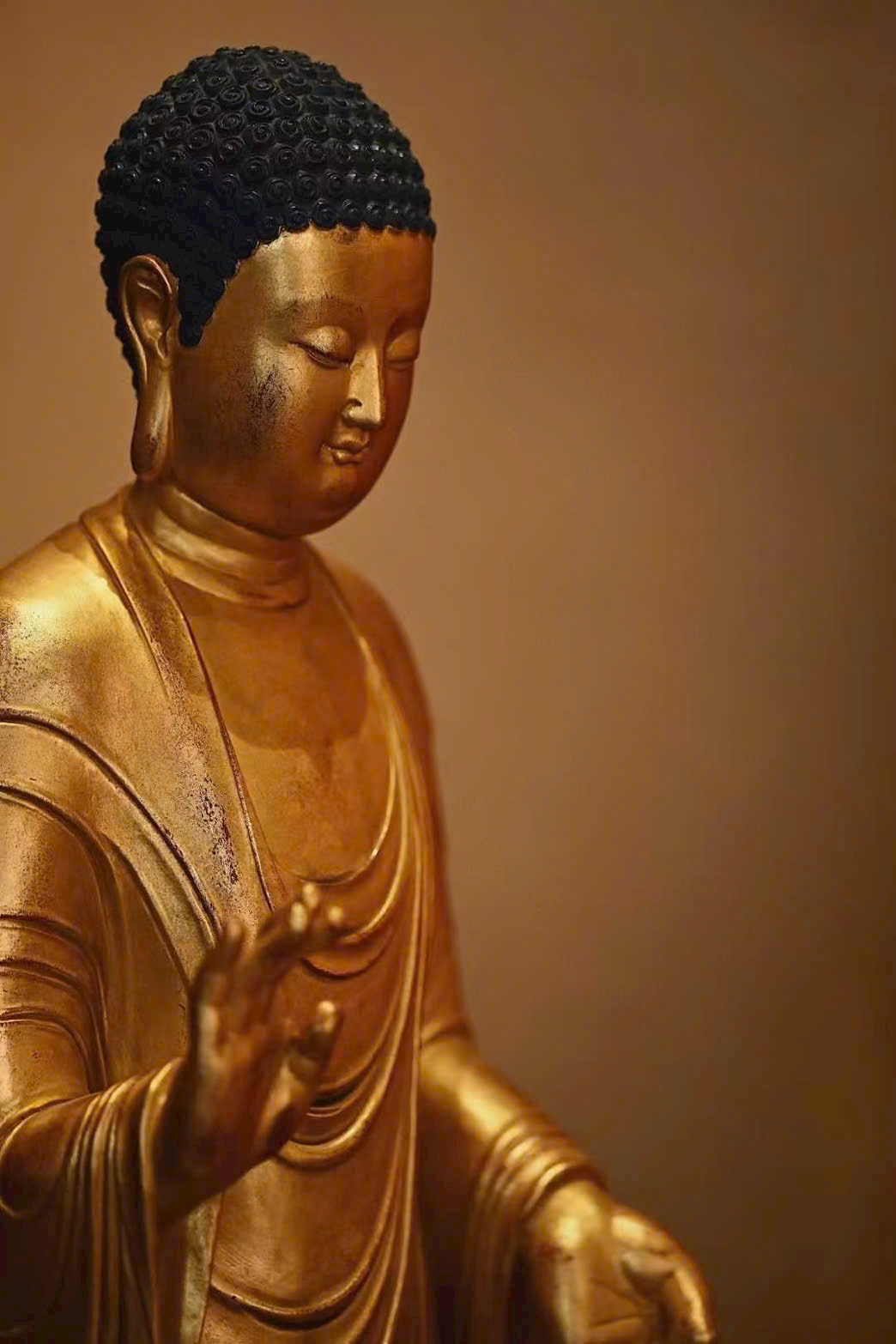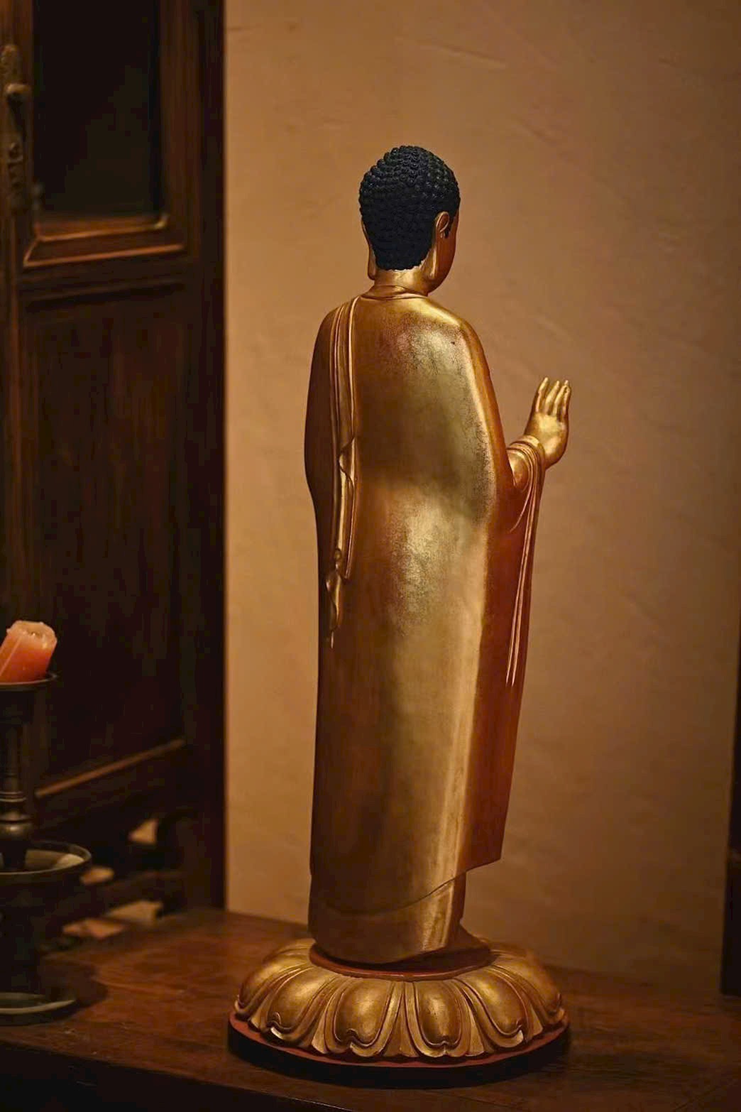 Thích Ca Mâu Ni đứng tự tại, tóc xoắn ốc điêu khắc rõ ràng, ánh mắt từ bi hướng xuống. Y phục mềm mại, uyển chuyển như mây trôi nước chảy, kết hợp hoàn hảo giữa hình dáng và thần thái, toát lên vẻ uy nghi trang nghiêm và may mắn.