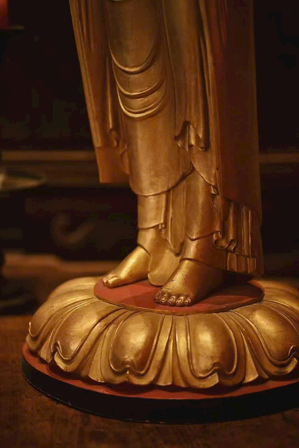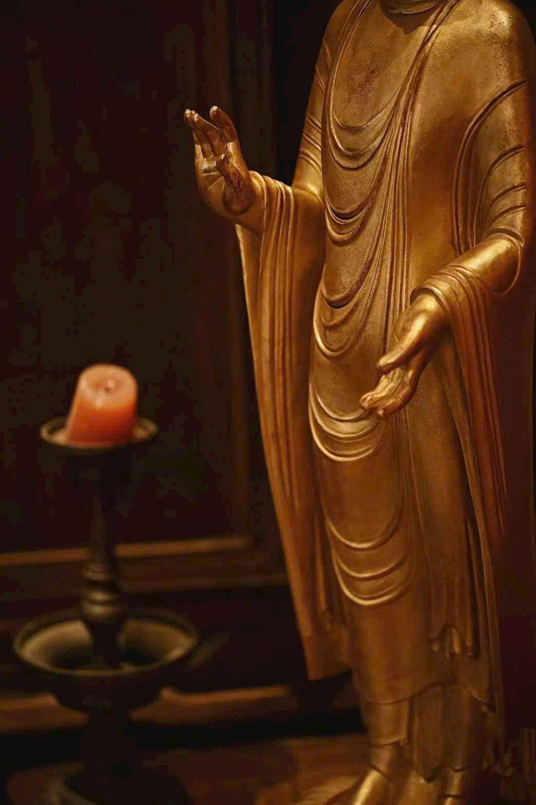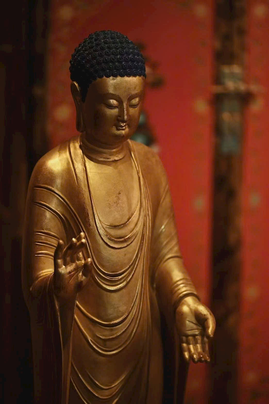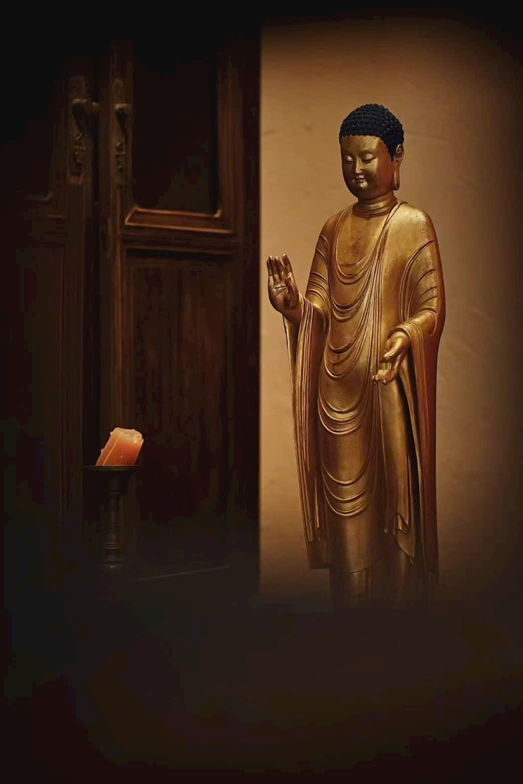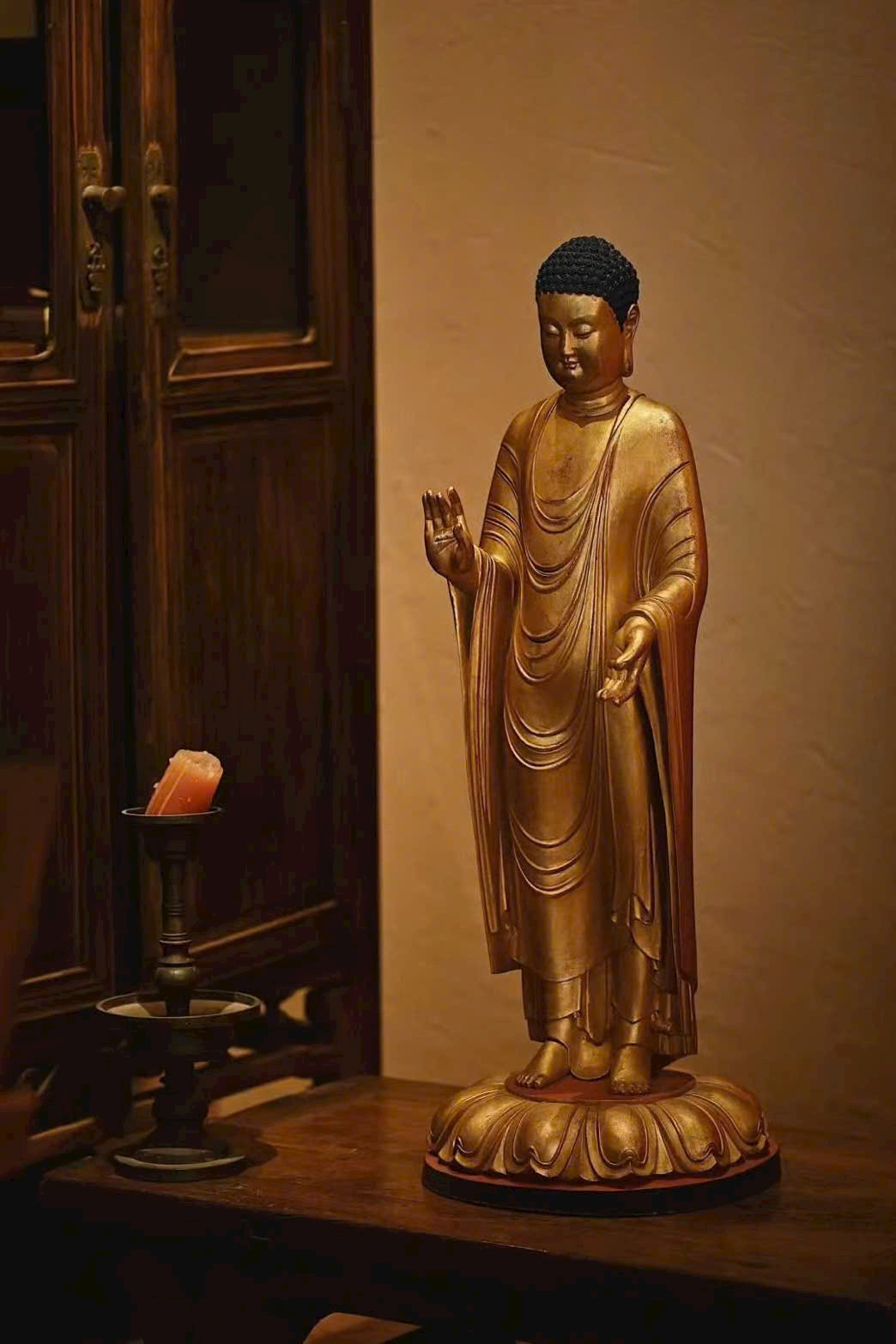 Thích Ca Mâu Ni đứng tự tại, tóc xoắn ốc điêu khắc rõ ràng, ánh mắt từ bi hướng xuống. Y phục mềm mại, uyển chuyển như mây trôi nước chảy, kết hợp hoàn hảo giữa hình dáng và thần thái, toát lên vẻ uy nghi trang nghiêm và may mắn.