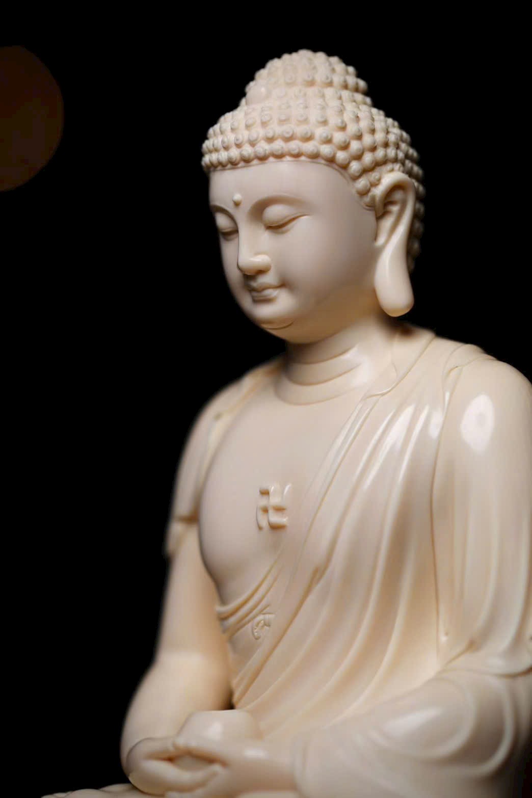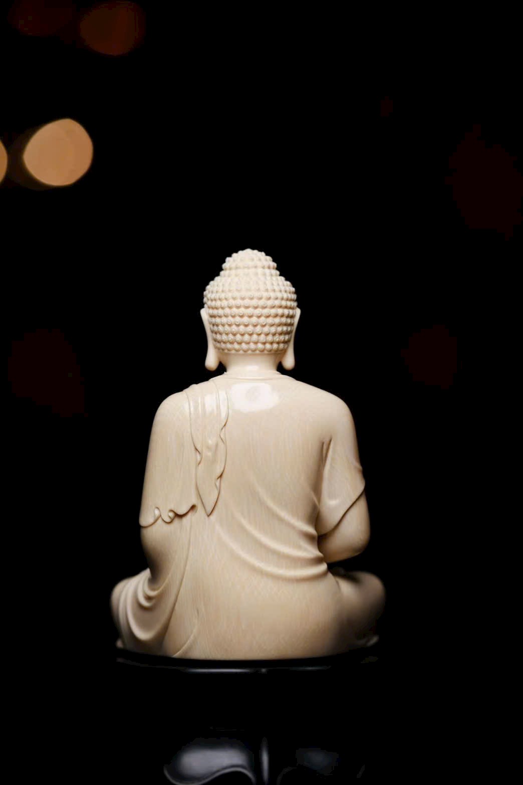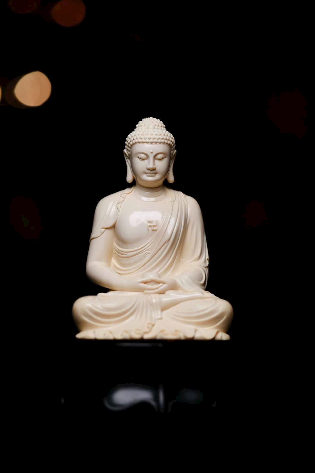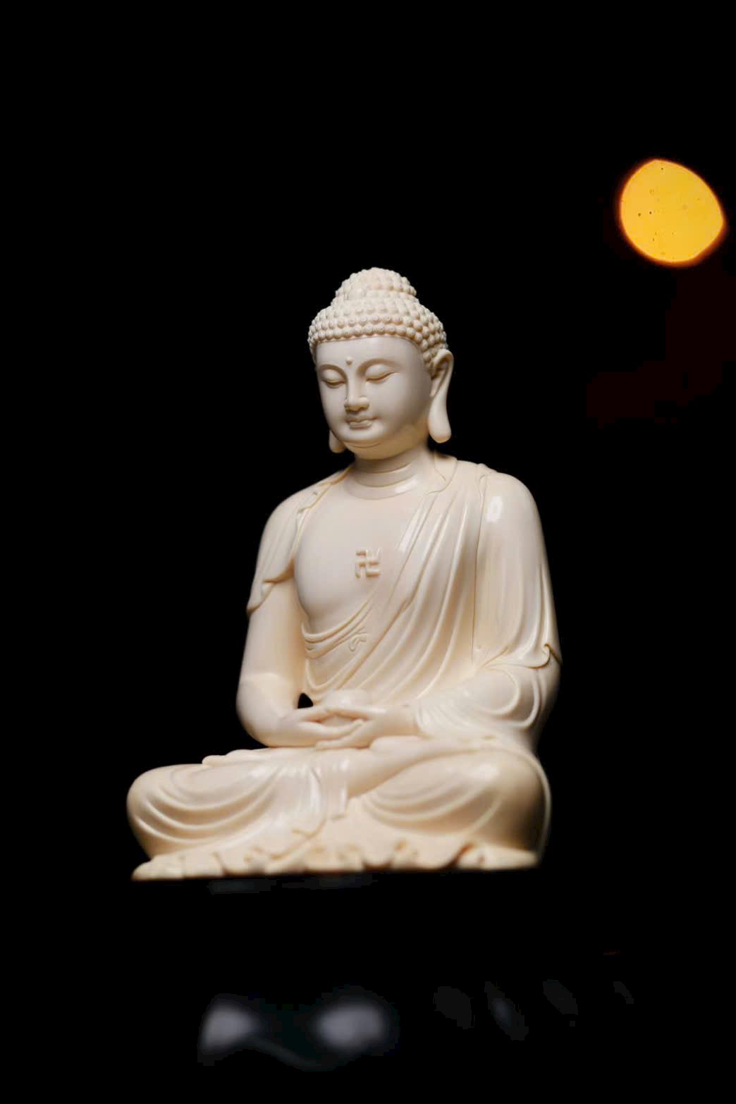 Tuyển chọn nguyên liệu ng.à voi ma mút 5A tuyệt phẩm. Tượng tôn dung trang nghiêm, Thế Tôn diện tướng đầy đặn, đôi tai dài chấm vai, ngồi tĩnh tọa mắt khép nhẹ, bảo y khoác thân uyển chuyển, nếp áo buông rủ tự nhiên. Pháp tướng hiển lộ sự từ bi và trang nghiêm.
