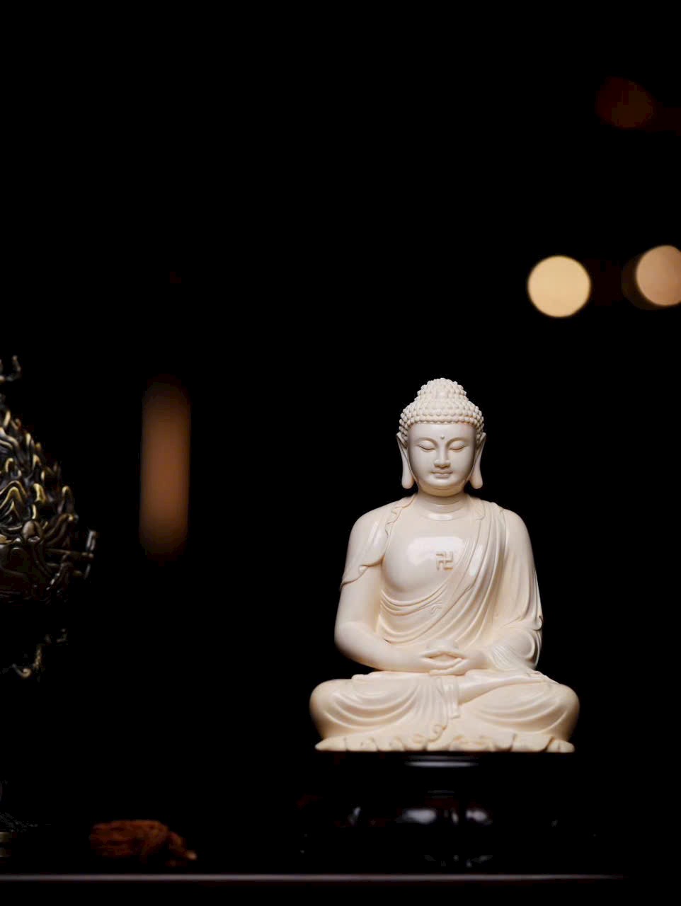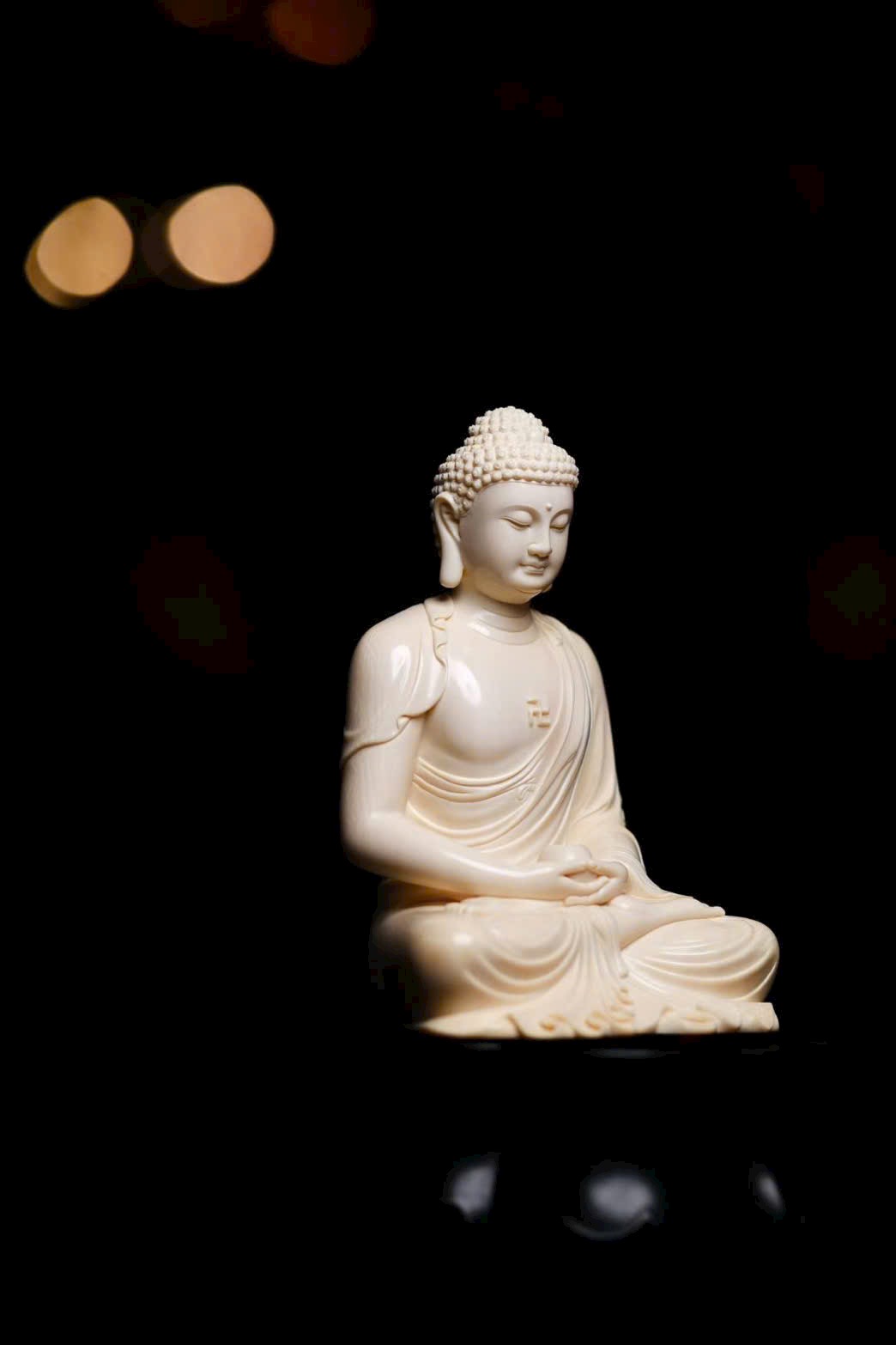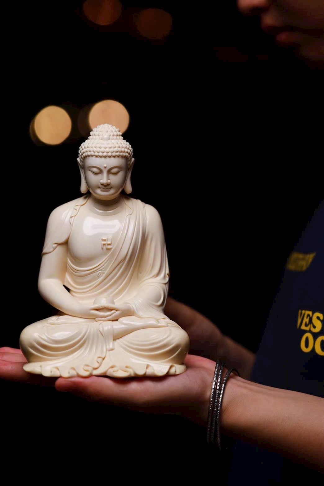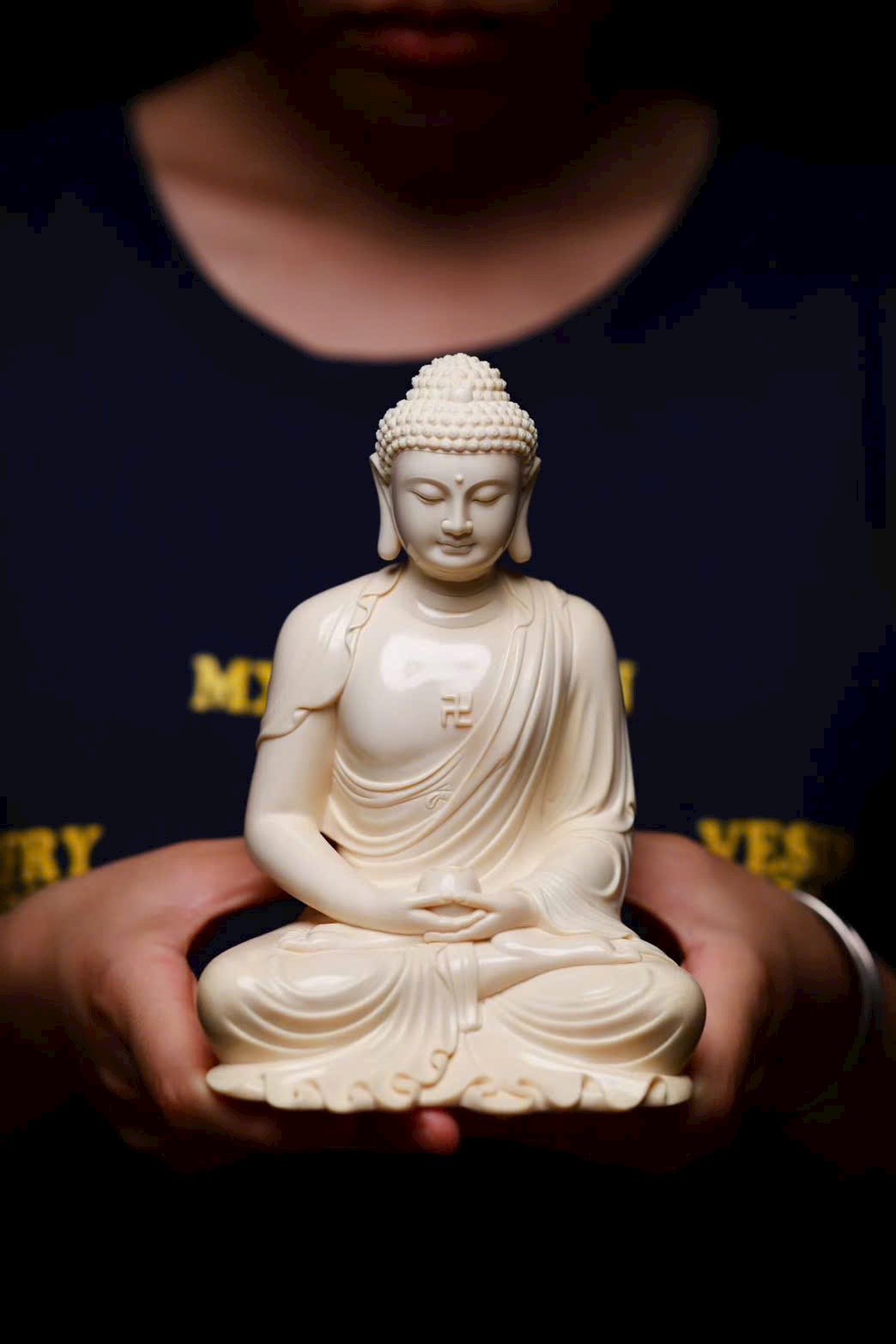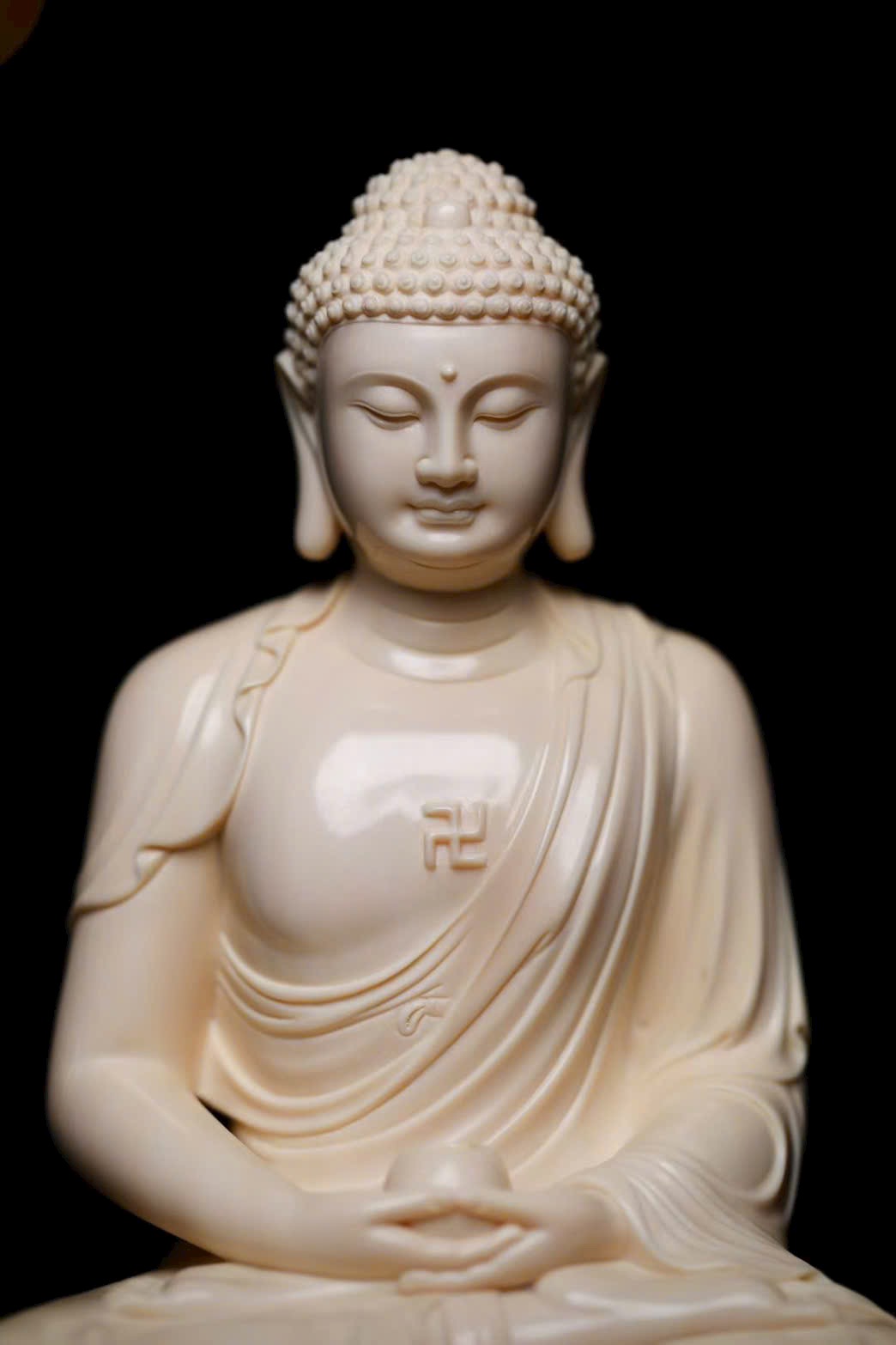 Tuyển chọn nguyên liệu ng.à voi ma mút 5A tuyệt phẩm. Tượng tôn dung trang nghiêm, Thế Tôn diện tướng đầy đặn, đôi tai dài chấm vai, ngồi tĩnh tọa mắt khép nhẹ, bảo y khoác thân uyển chuyển, nếp áo buông rủ tự nhiên. Pháp tướng hiển lộ sự từ bi và trang nghiêm.