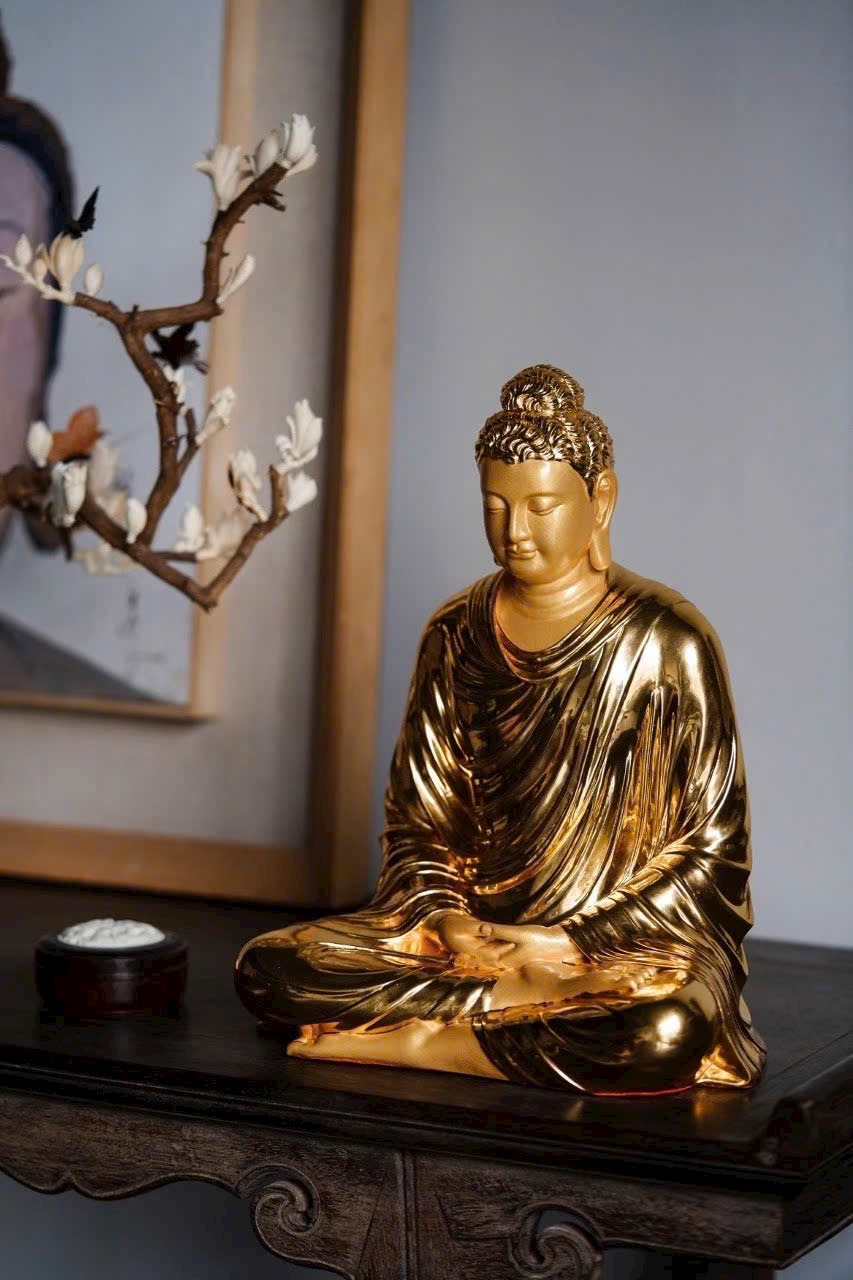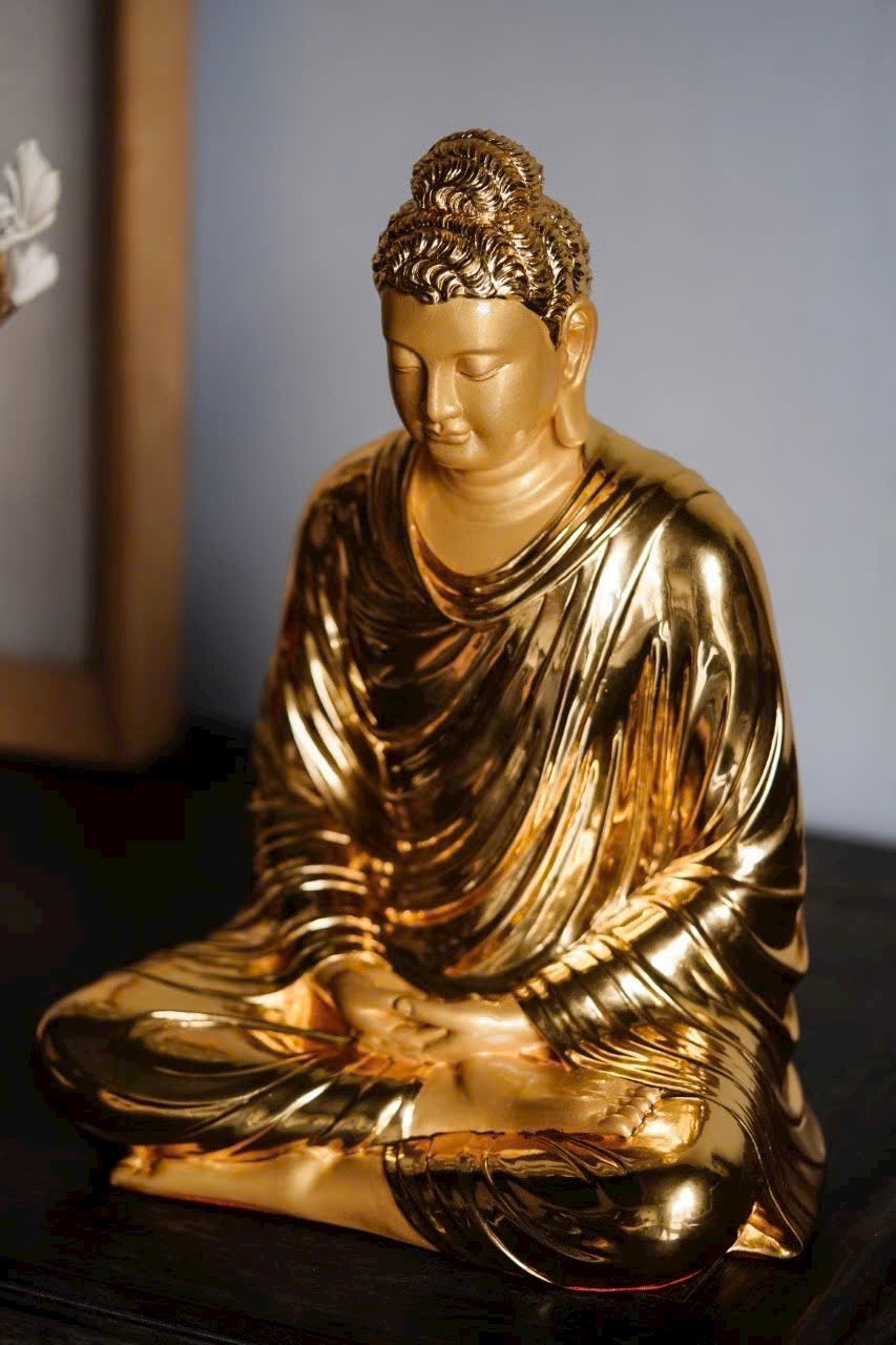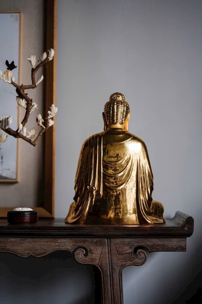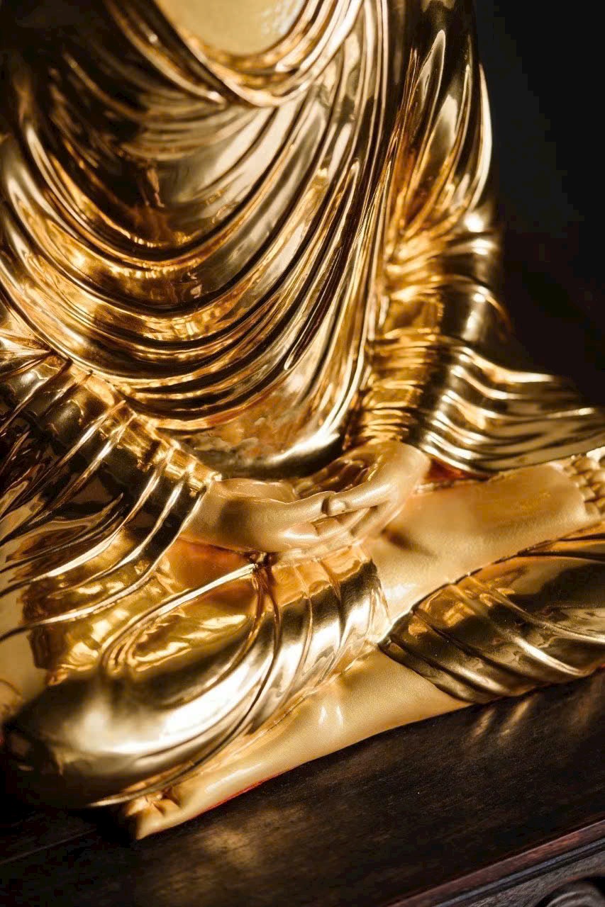 Phật Tổ an tọa thế kiết già, vạt áo buông rủ mềm mại như dòng nước, ánh vàng dát mỏng tỏa sáng hào quang Phật pháp. Đôi mày khẽ cụp, nụ cười hiền hòa, tướng mạo uy nghi mà từ bi. Một khối gỗ – một cõi tịnh độ, một niệm khởi – một đóa Bồ đề nở rộ.