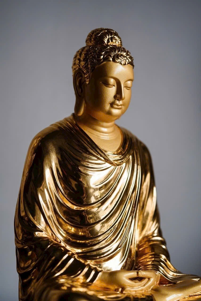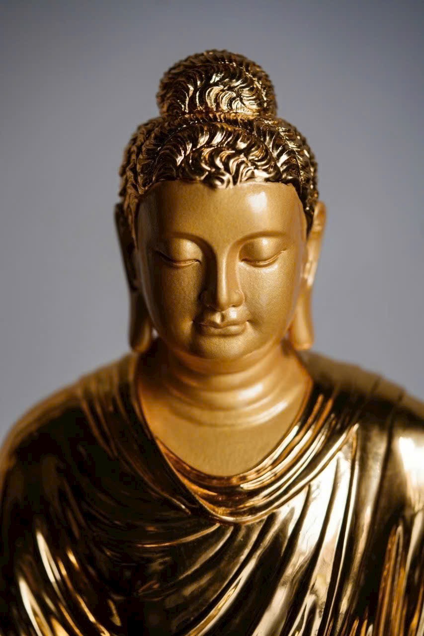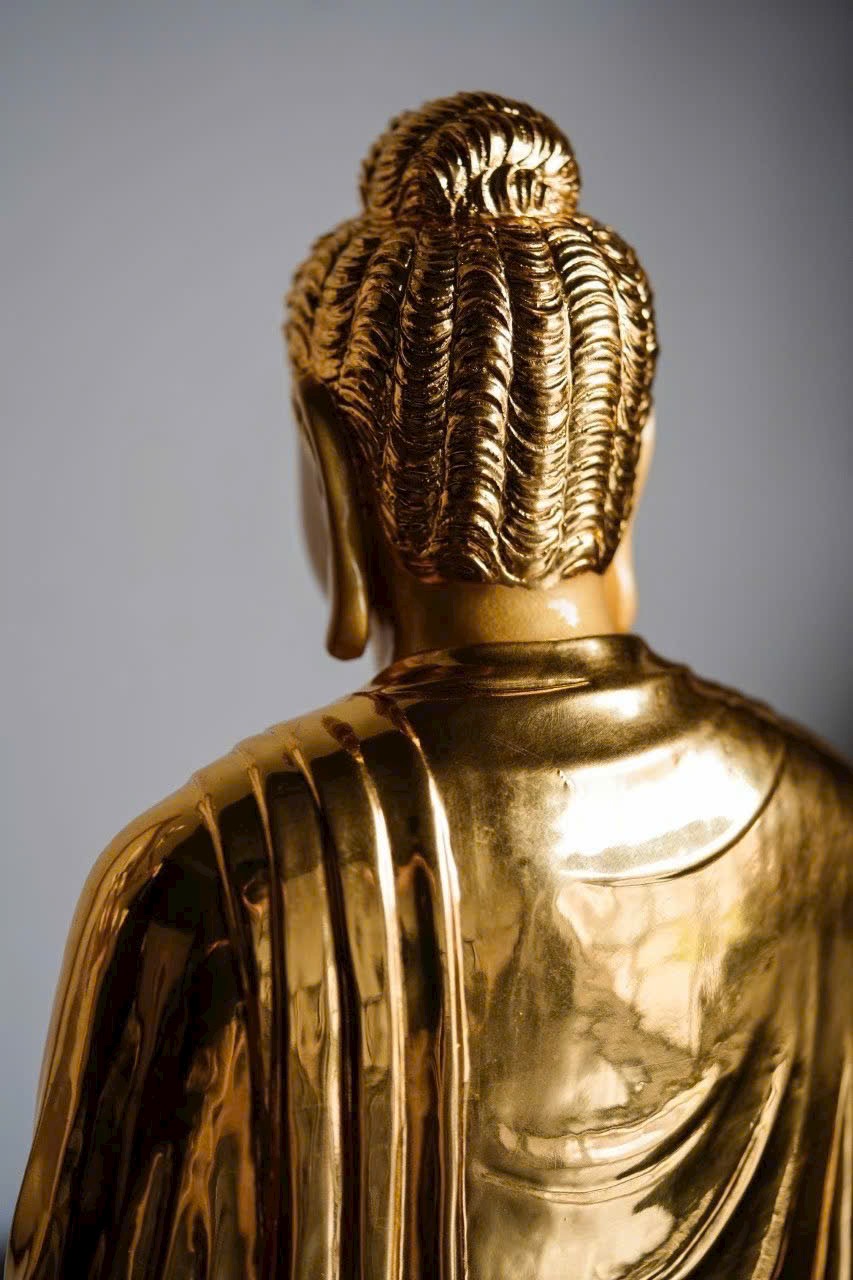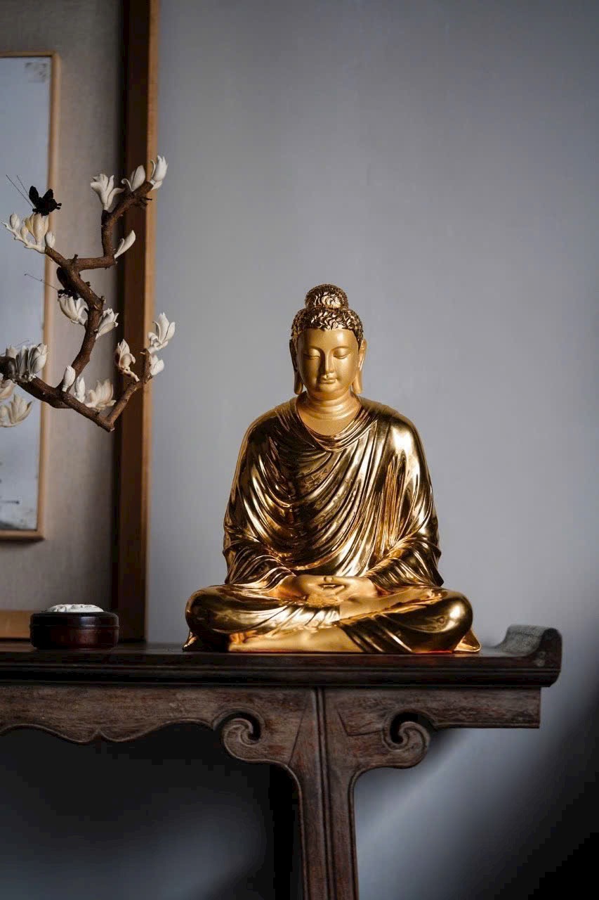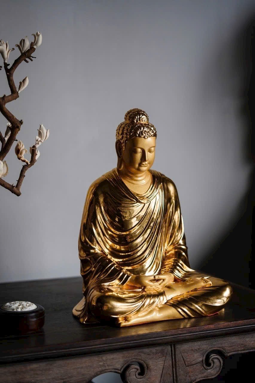 Phật Tổ an tọa thế kiết già, vạt áo buông rủ mềm mại như dòng nước, ánh vàng dát mỏng tỏa sáng hào quang Phật pháp. Đôi mày khẽ cụp, nụ cười hiền hòa, tướng mạo uy nghi mà từ bi. Một khối gỗ – một cõi tịnh độ, một niệm khởi – một đóa Bồ đề nở rộ.