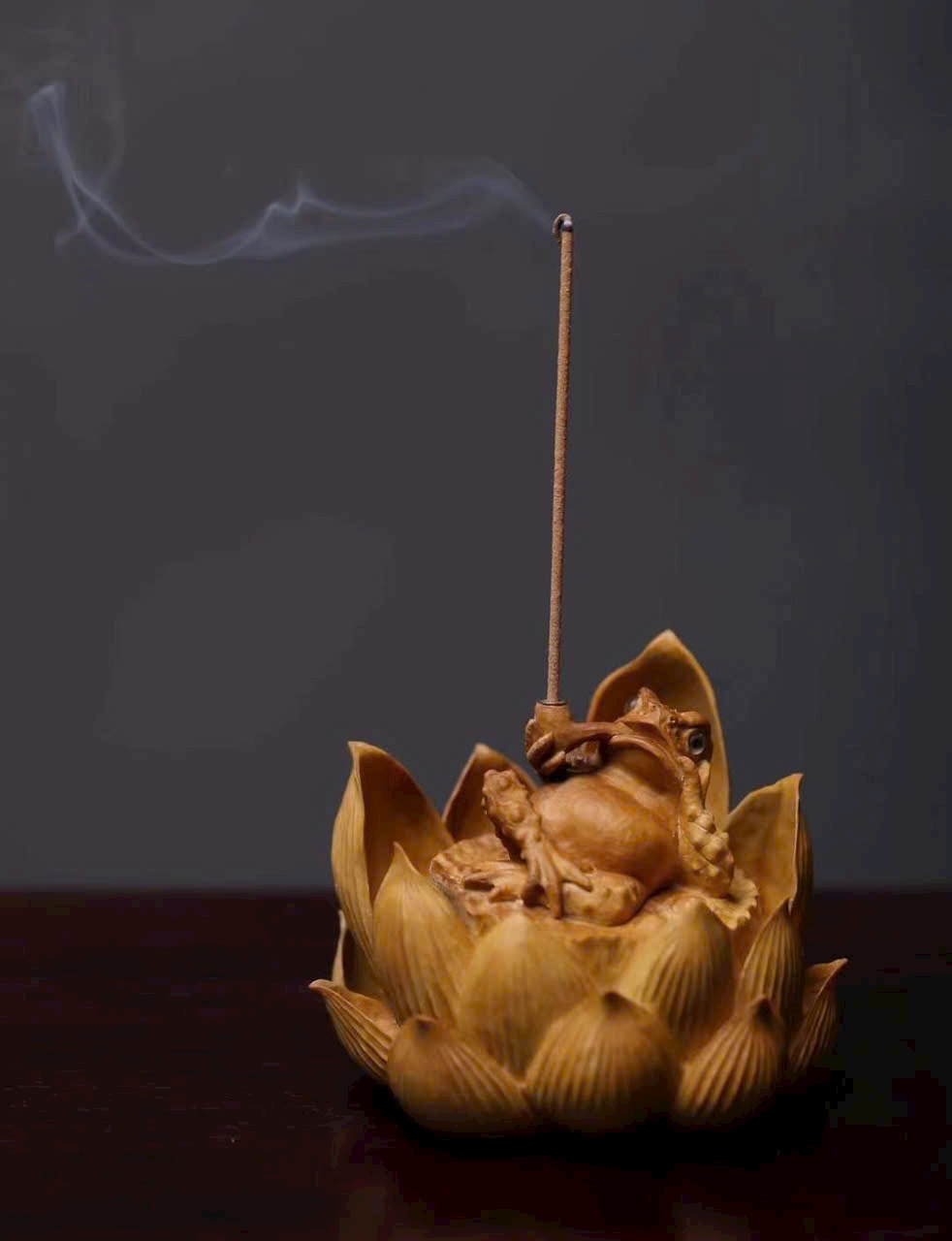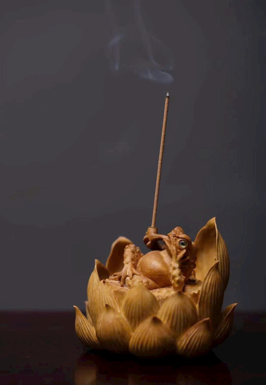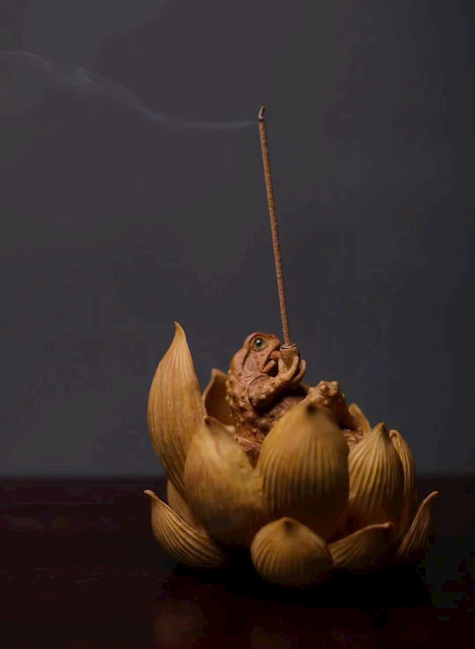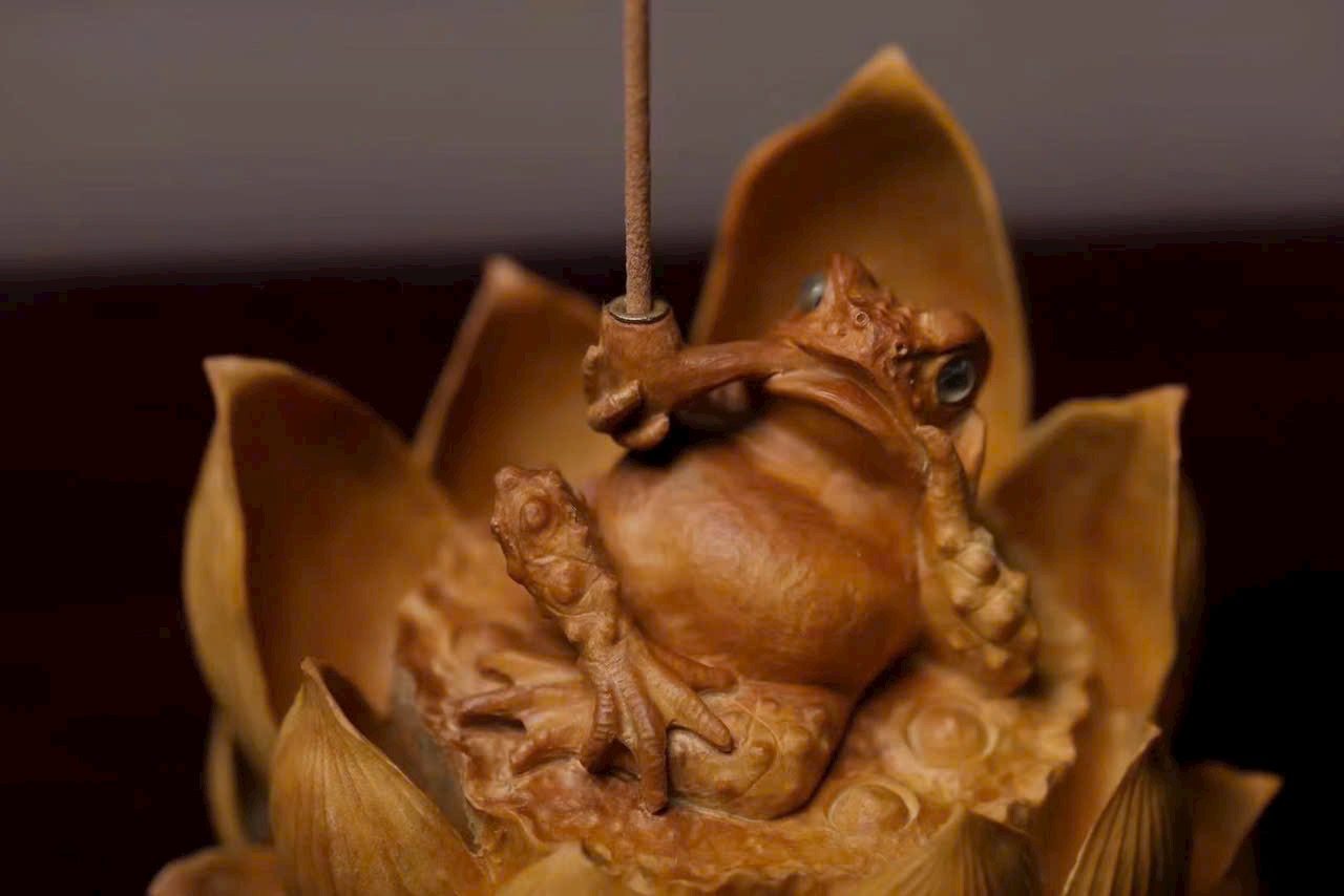 Cánh hoa sen mềm mại, vân rõ tự nhiên. Trên đài sen, cóc vàng nằm nghiêng, chân giao nhau, mắt mở to sống động. Khi đốt trầm, khói nhẹ bay lên, thêm phần thiền vị và cổ phong tao nhã.