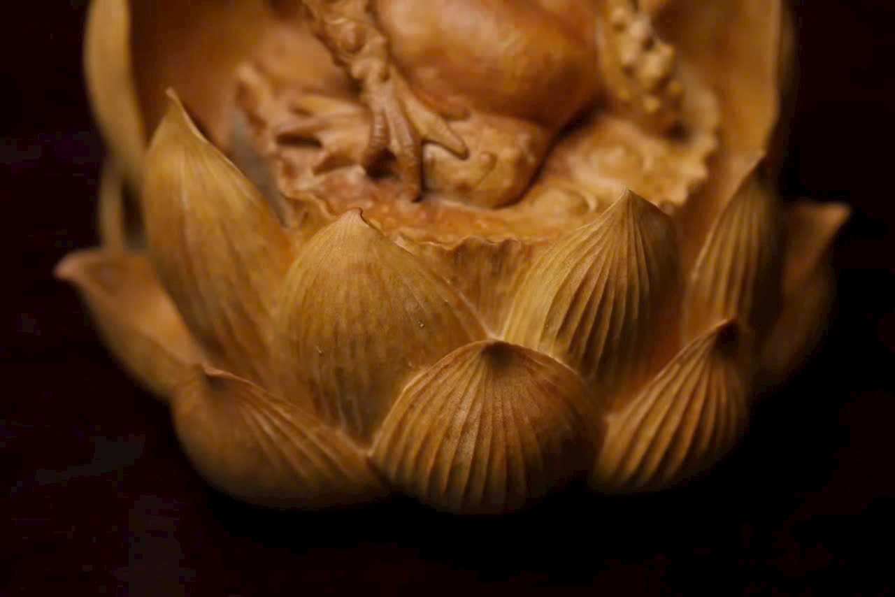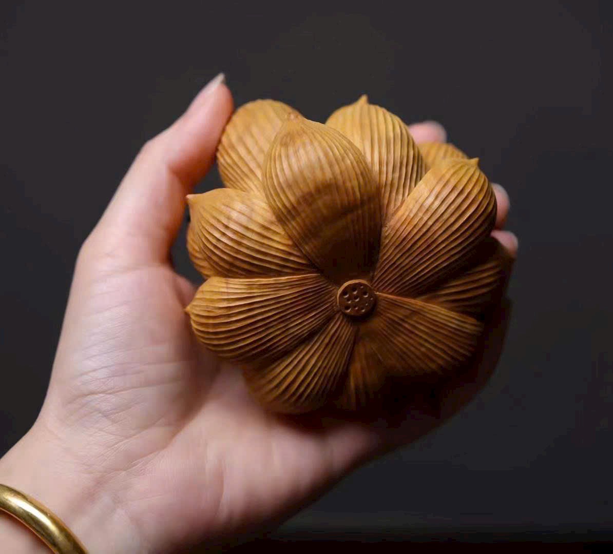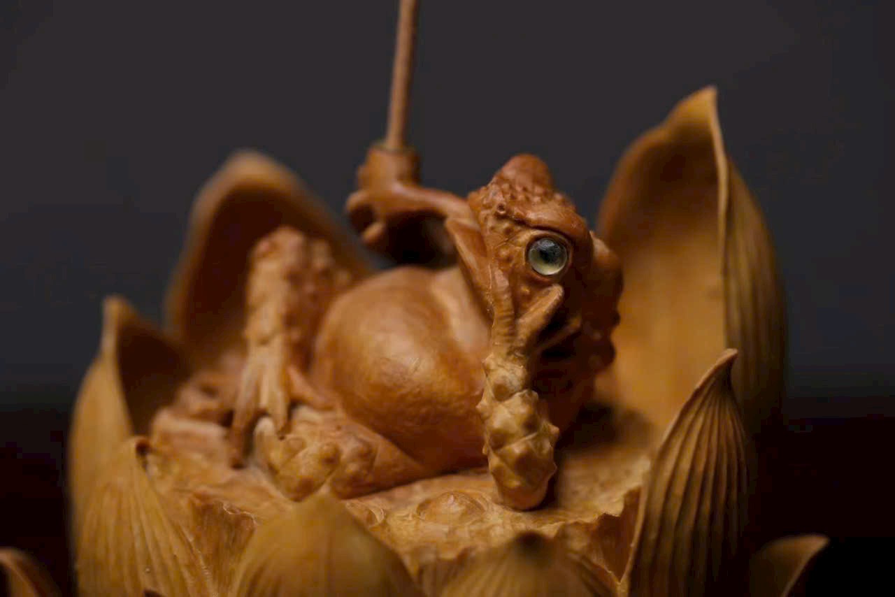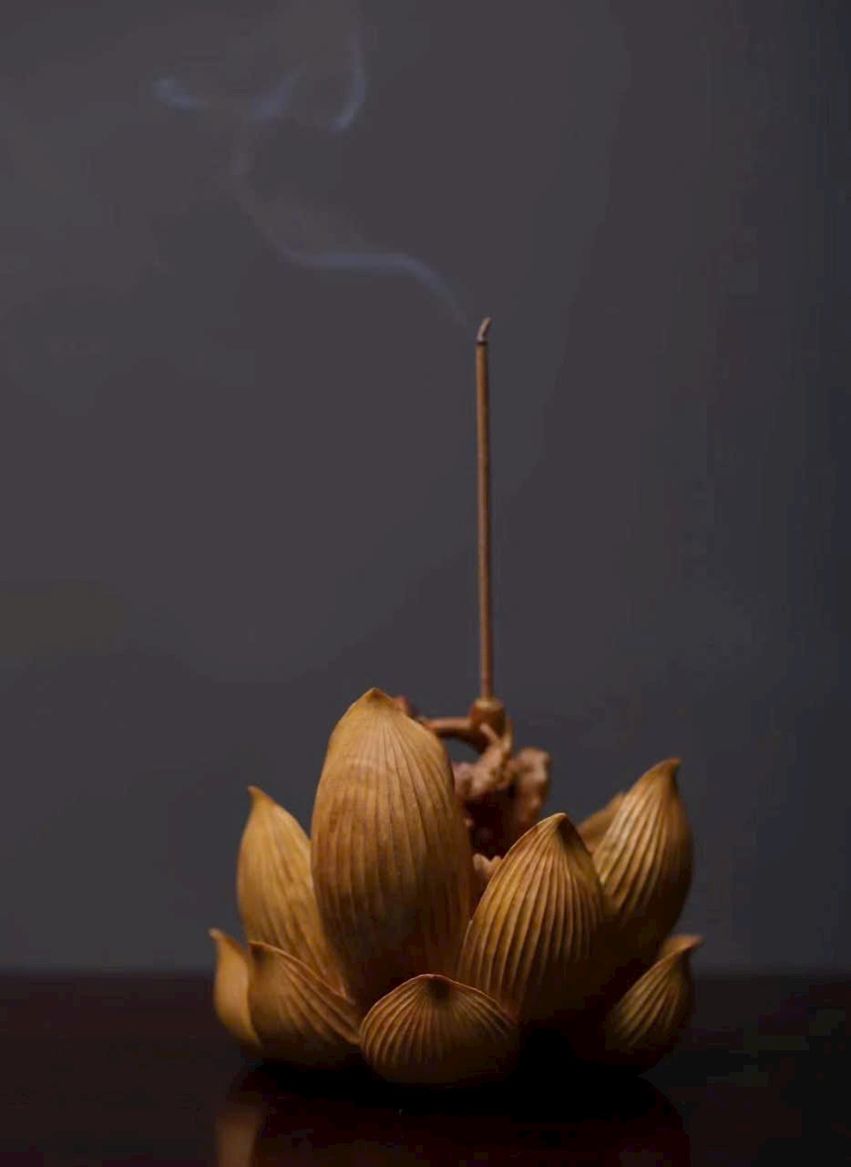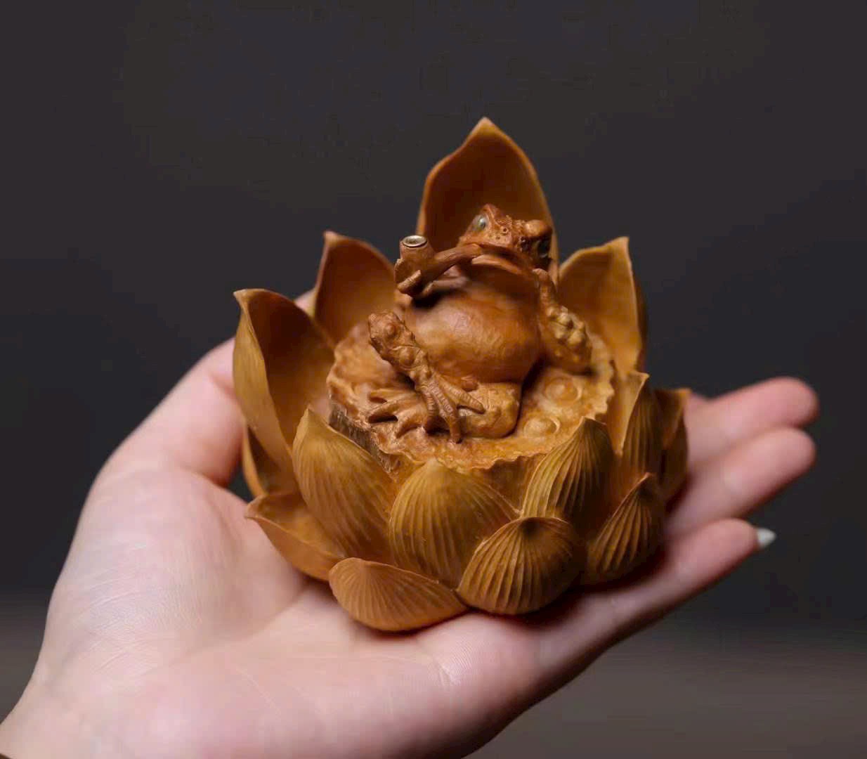 Cánh hoa sen mềm mại, vân rõ tự nhiên. Trên đài sen, cóc vàng nằm nghiêng, chân giao nhau, mắt mở to sống động. Khi đốt trầm, khói nhẹ bay lên, thêm phần thiền vị và cổ phong tao nhã.