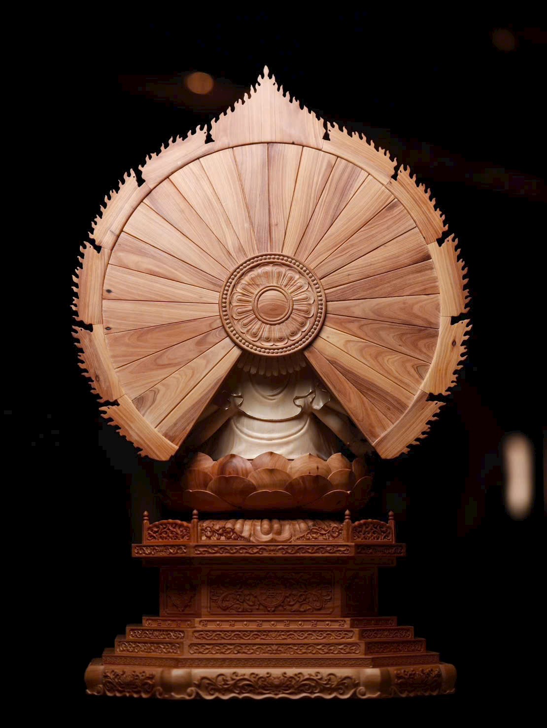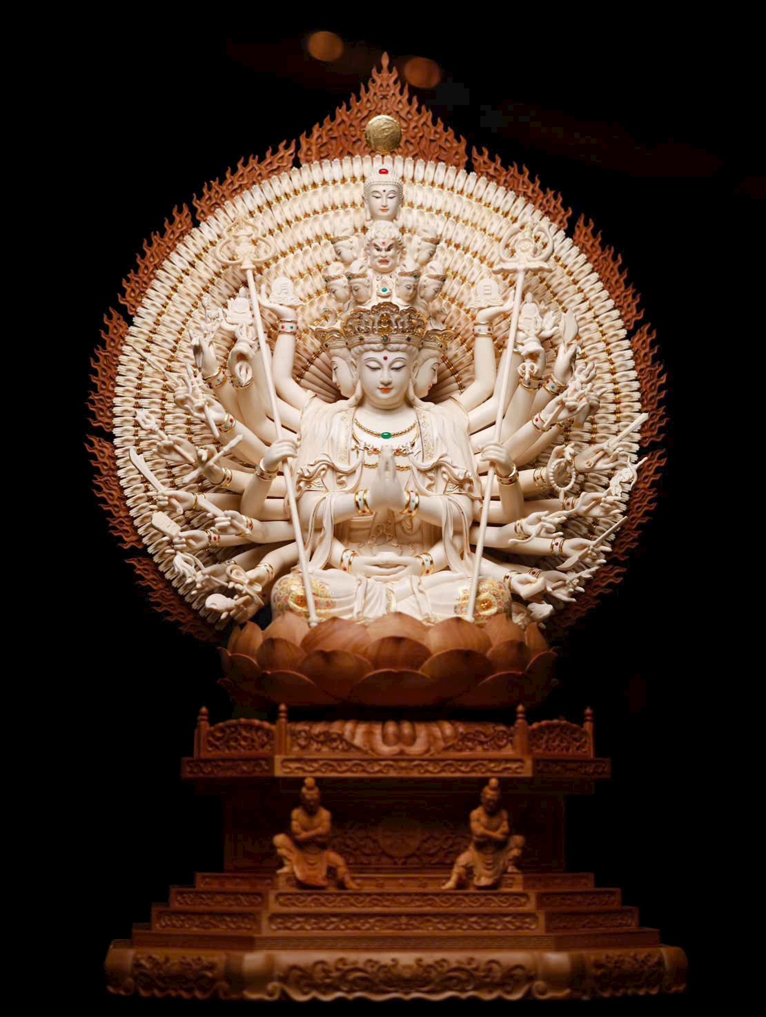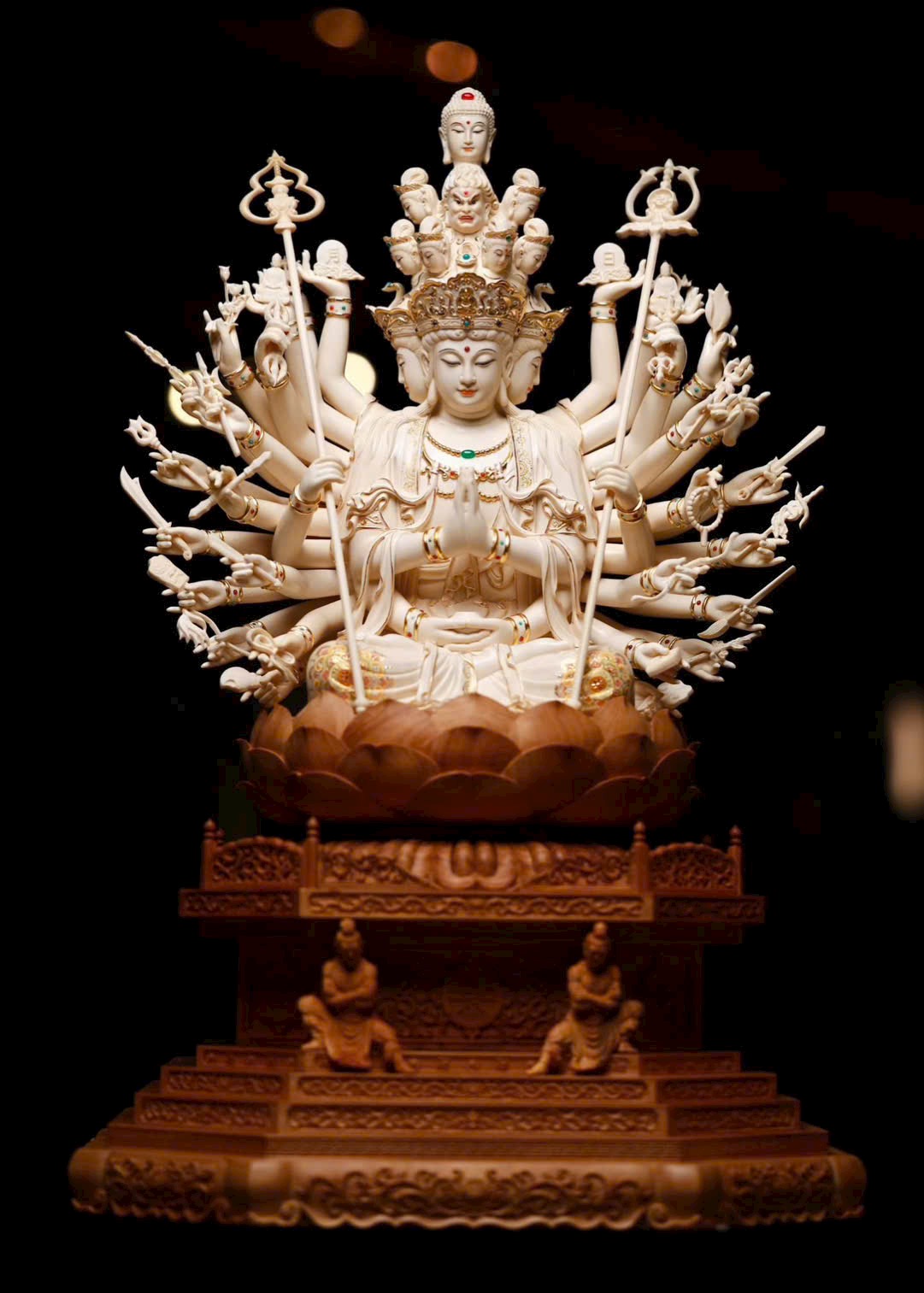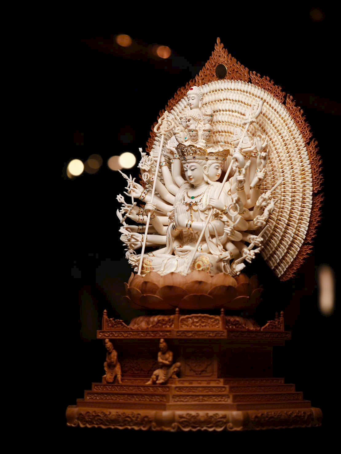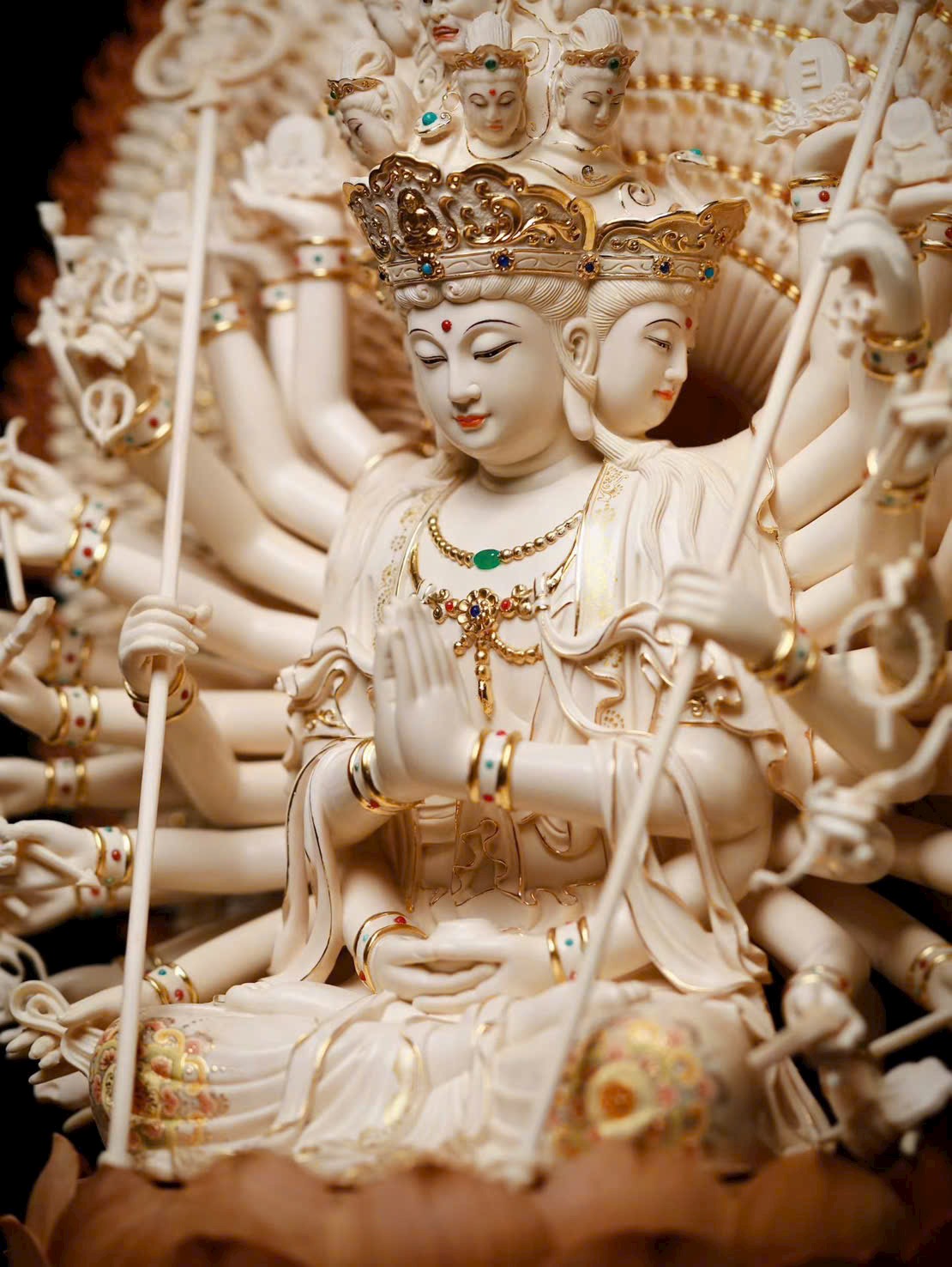 Tác phẩm Thiên Thủ Quan Âm là trọng khí tiêu biểu của năm, do Nghệ nhân Mỹ thuật – Thủ công cấp Tỉnh dồn tâm huyết đích thân chế tác, độc bản duy nhất. Chọn lọc ngà voi ma mút lão liệu 5A thượng hạng, chạm khắc tinh công tuyệt mỹ. Hình tượng Quan Âm từ bi an tọa trên tòa sen, thiên thủ tỏa mở, pháp tướng trang nghiêm, linh vận lưu chuyển, hàm chứa đại nguyện phổ độ chúng sinh. Đường đao phức tạp tinh xảo, bố cục khí thế hùng vĩ, là bảo phẩm hiếm có xứng đáng sưu tầm – truyền đời.