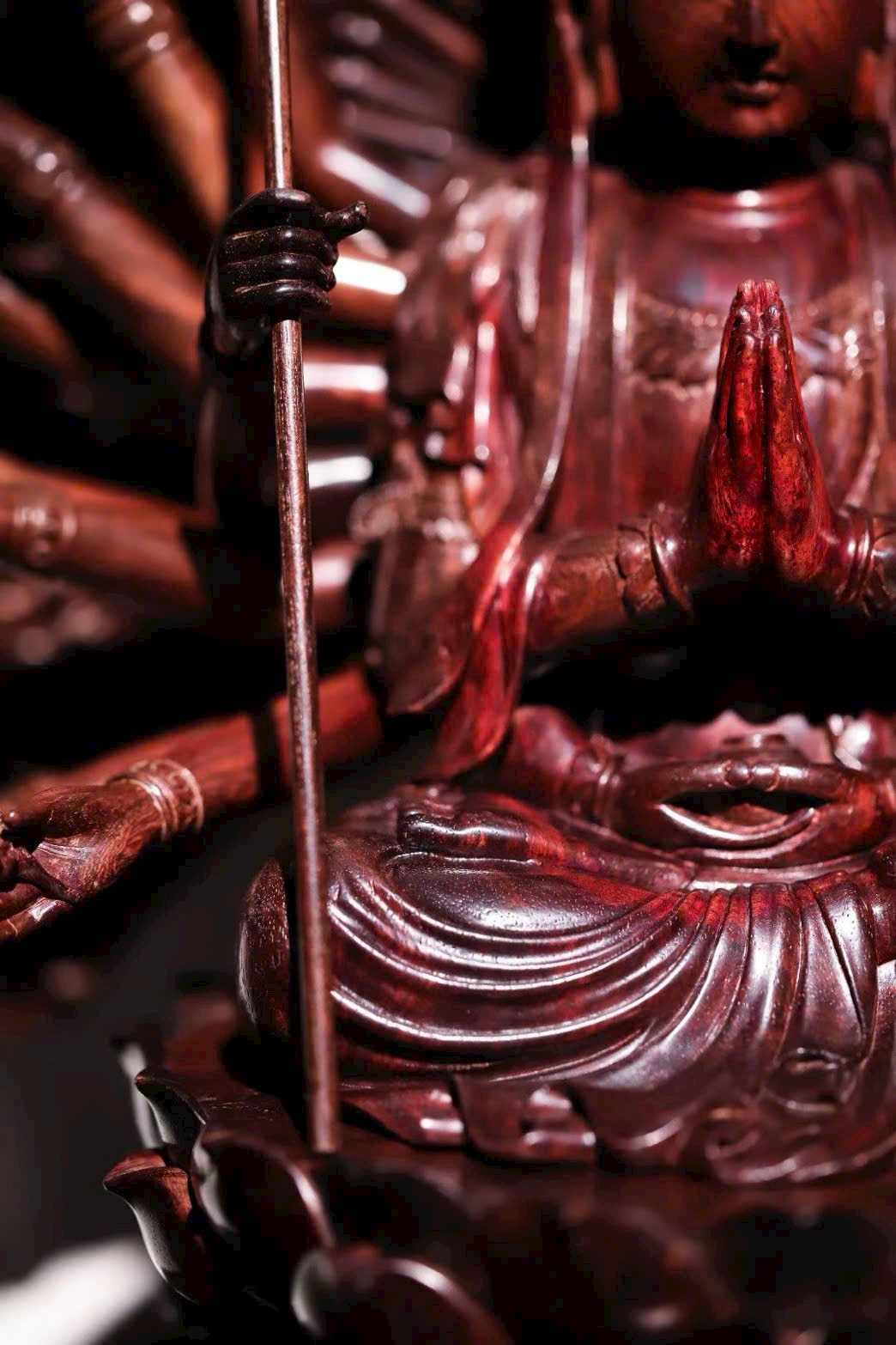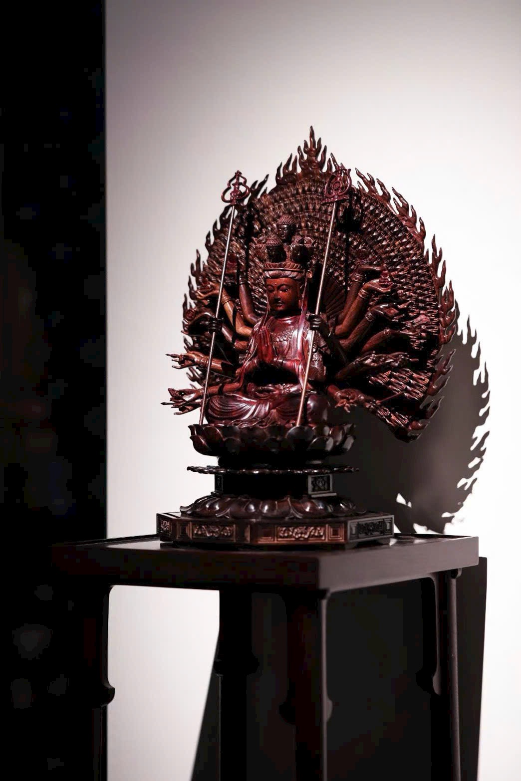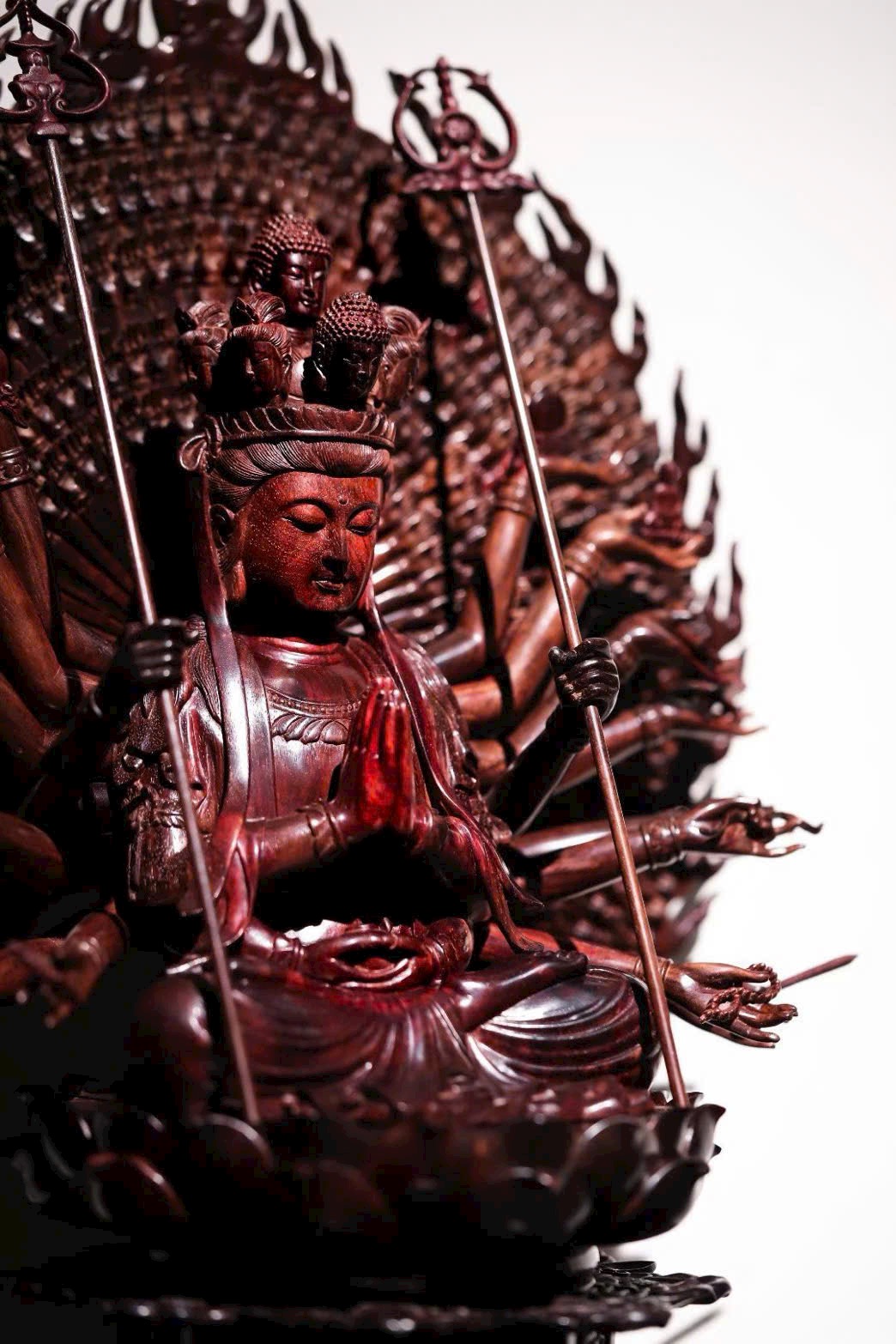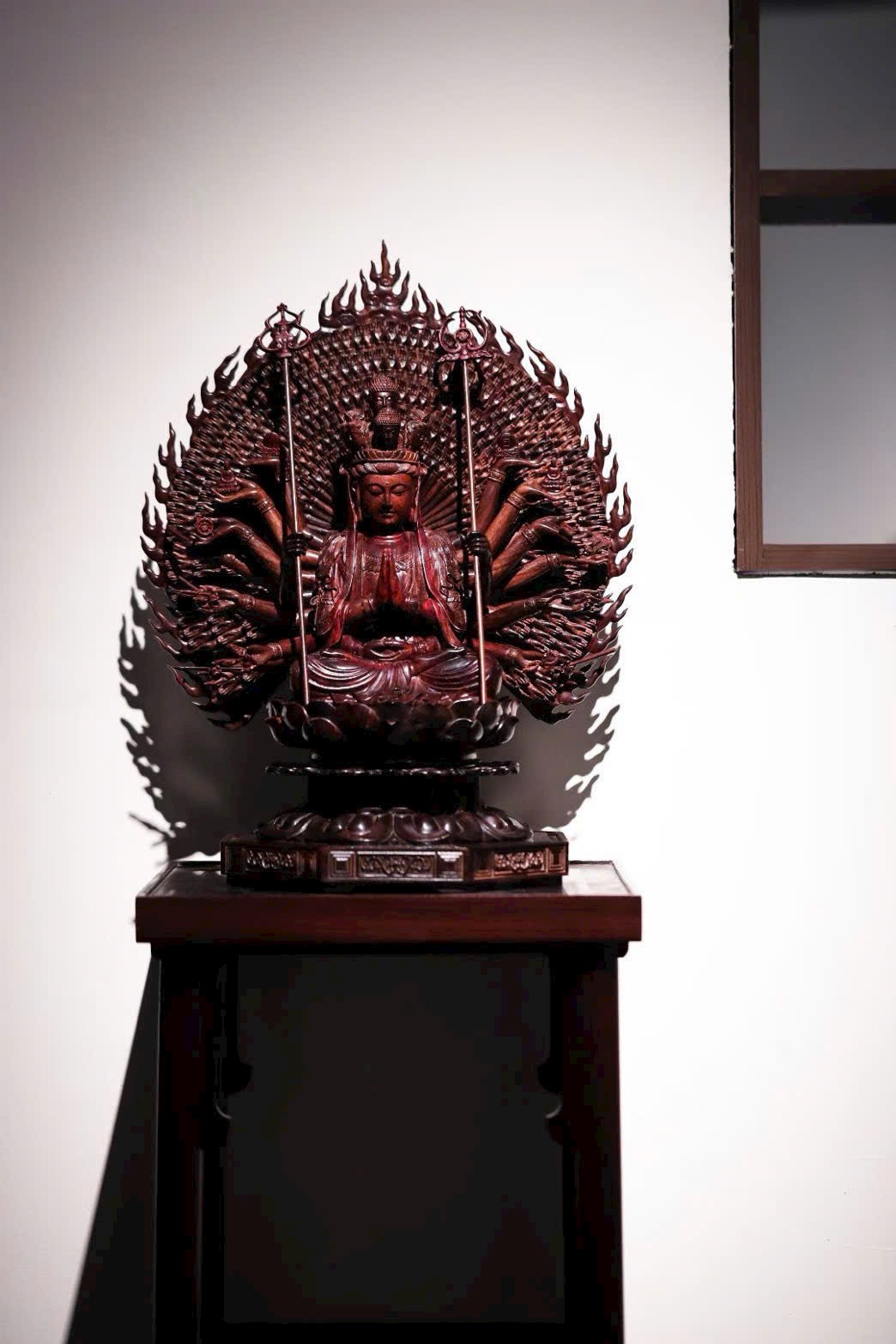 Gỗ tử đàn lâu năm, chất gỗ thâm trầm như ngọc, ánh dầu mịn màng. Tượng Quan Âm pháp tướng trang nghiêm từ bi, nghìn tay tỏa nở như đóa sen rực rỡ, mỗi lòng bàn tay mở con mắt trí tuệ soi thấu nhân gian. Dải y lụa phấp phới như gió lay hương trầm, khi đặt trên bàn thờ, tựa như lắng nghe tiếng Phạn âm tĩnh lặng, thanh khiết.