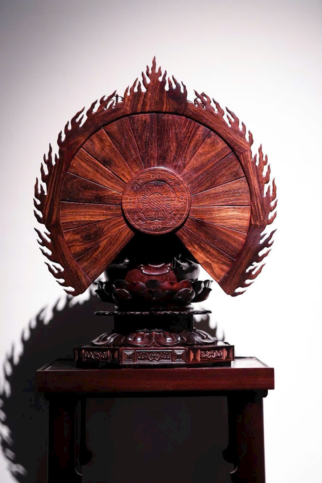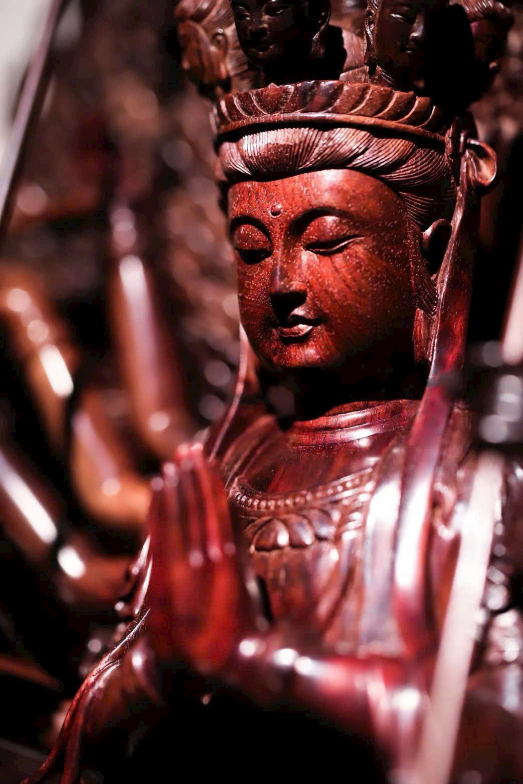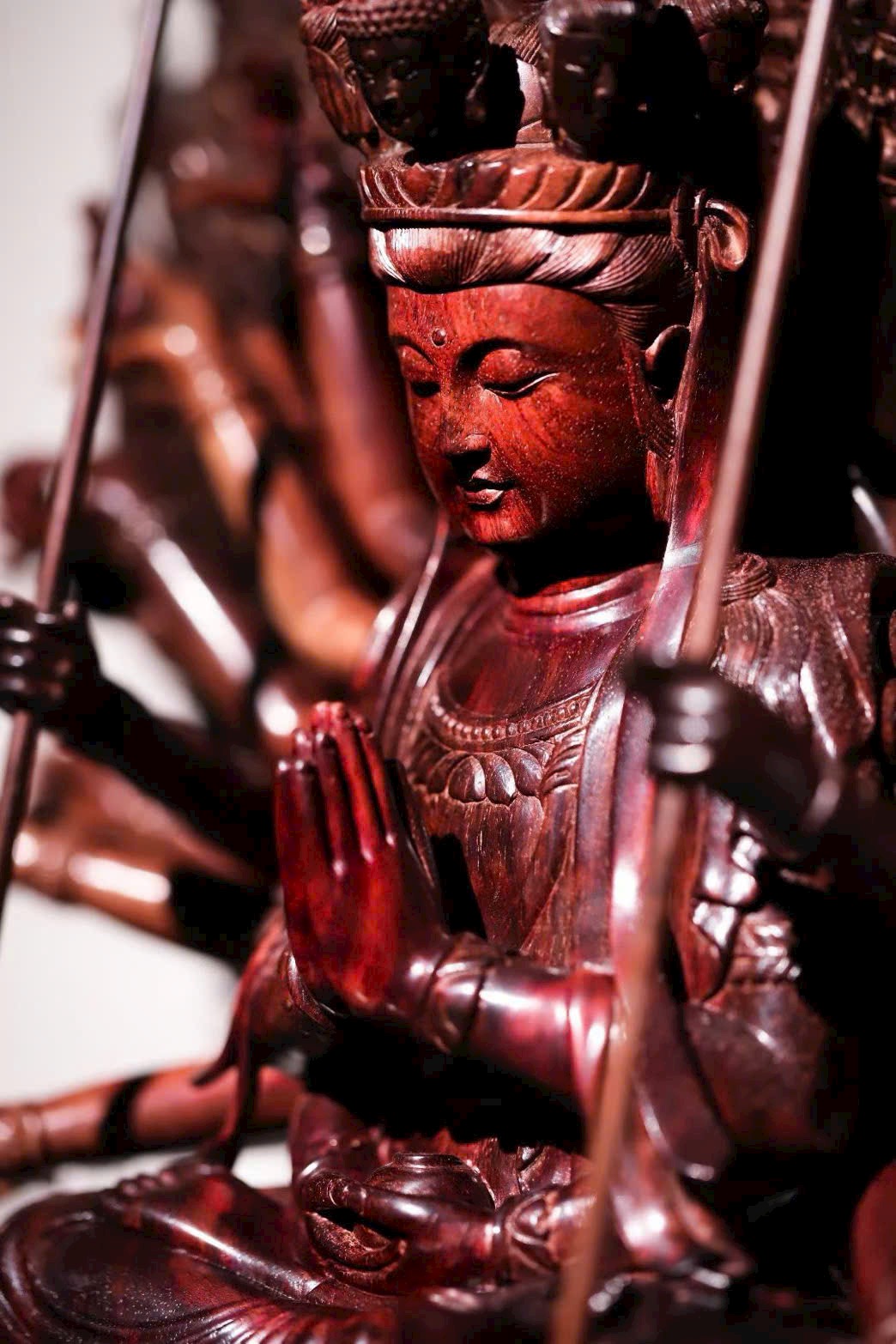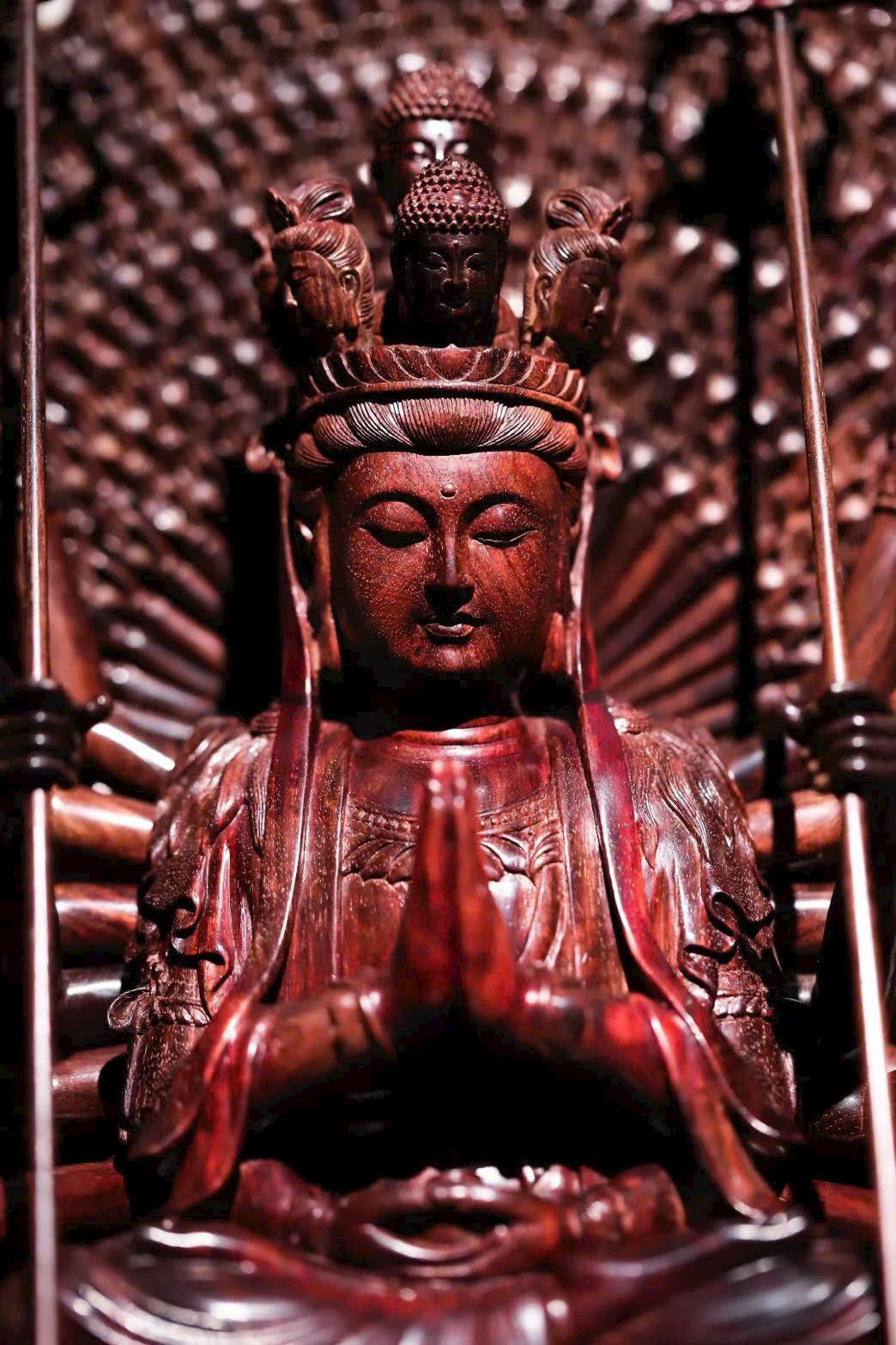 Gỗ tử đàn lâu năm, chất gỗ thâm trầm như ngọc, ánh dầu mịn màng. Tượng Quan Âm pháp tướng trang nghiêm từ bi, nghìn tay tỏa nở như đóa sen rực rỡ, mỗi lòng bàn tay mở con mắt trí tuệ soi thấu nhân gian. Dải y lụa phấp phới như gió lay hương trầm, khi đặt trên bàn thờ, tựa như lắng nghe tiếng Phạn âm tĩnh lặng, thanh khiết.