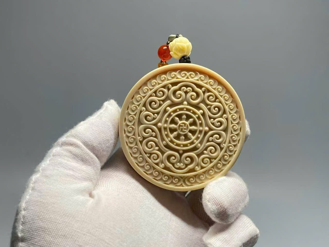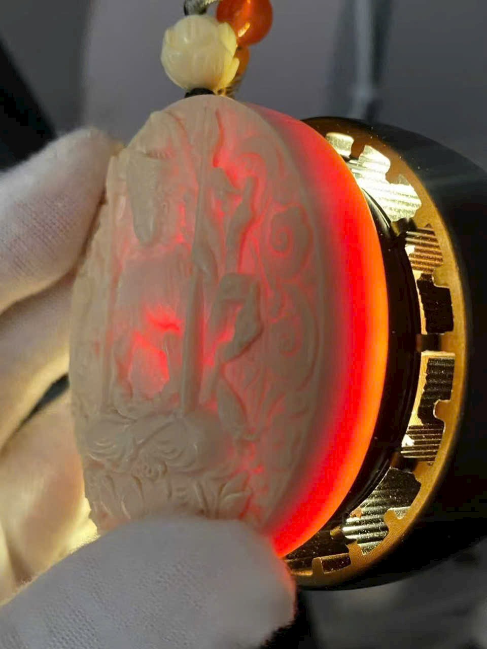 Chất liệu n.gà mamut sắc huyết như quả đông, trong trẻo; chi tiết được chạm khắc sâu, tinh xảo từng đường nét.