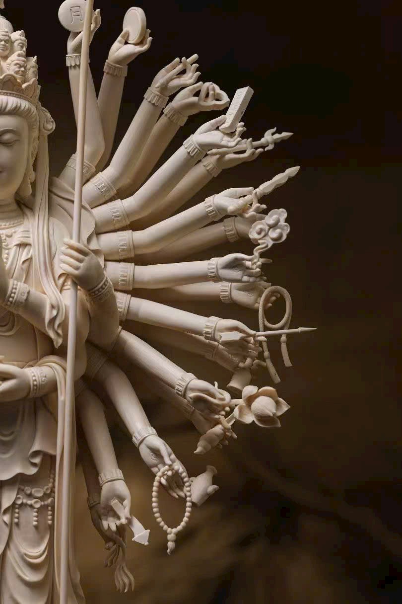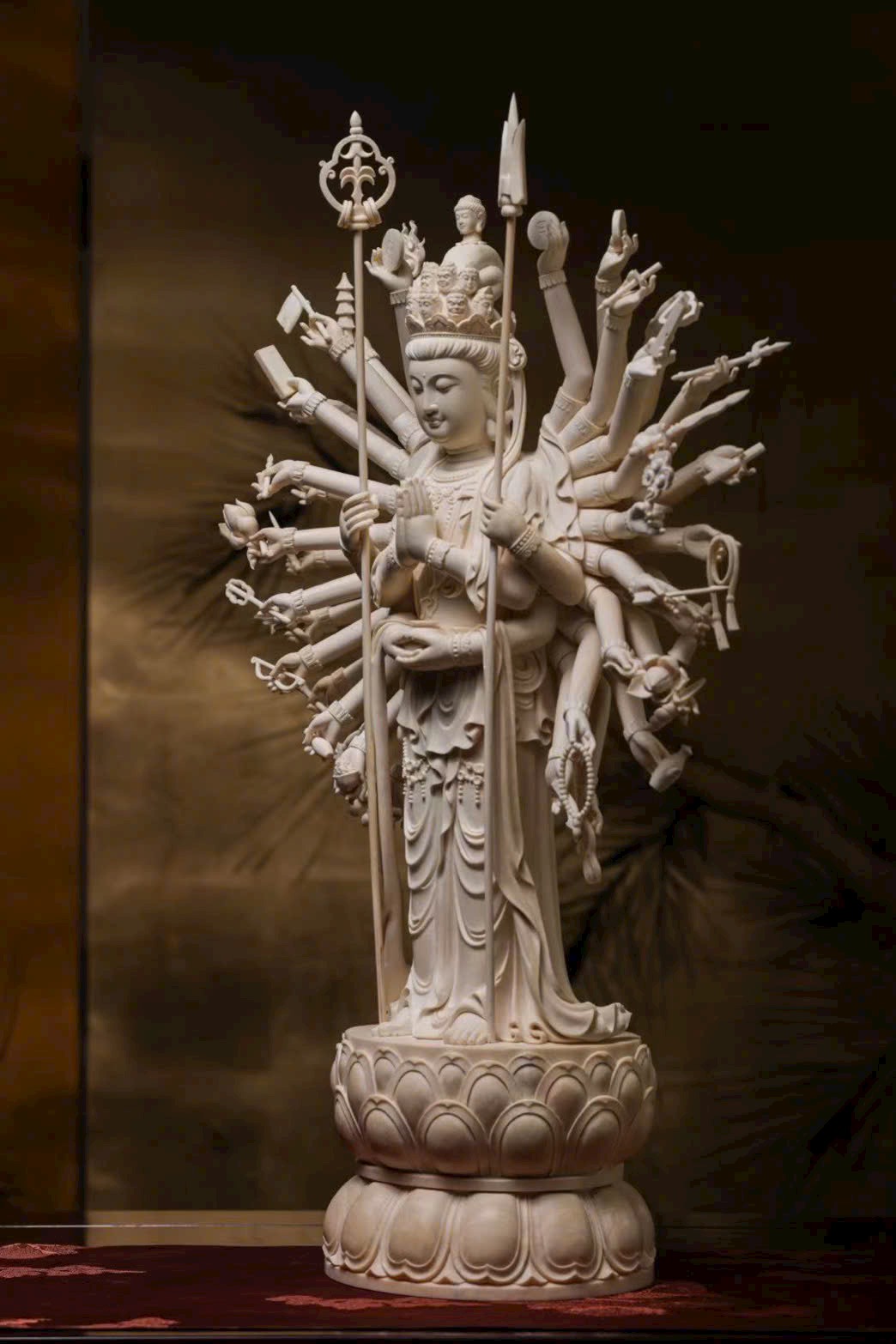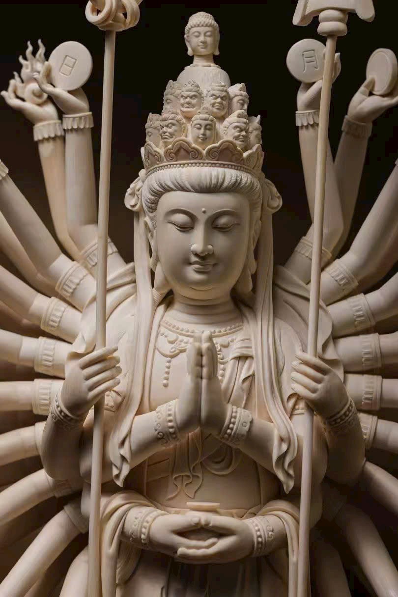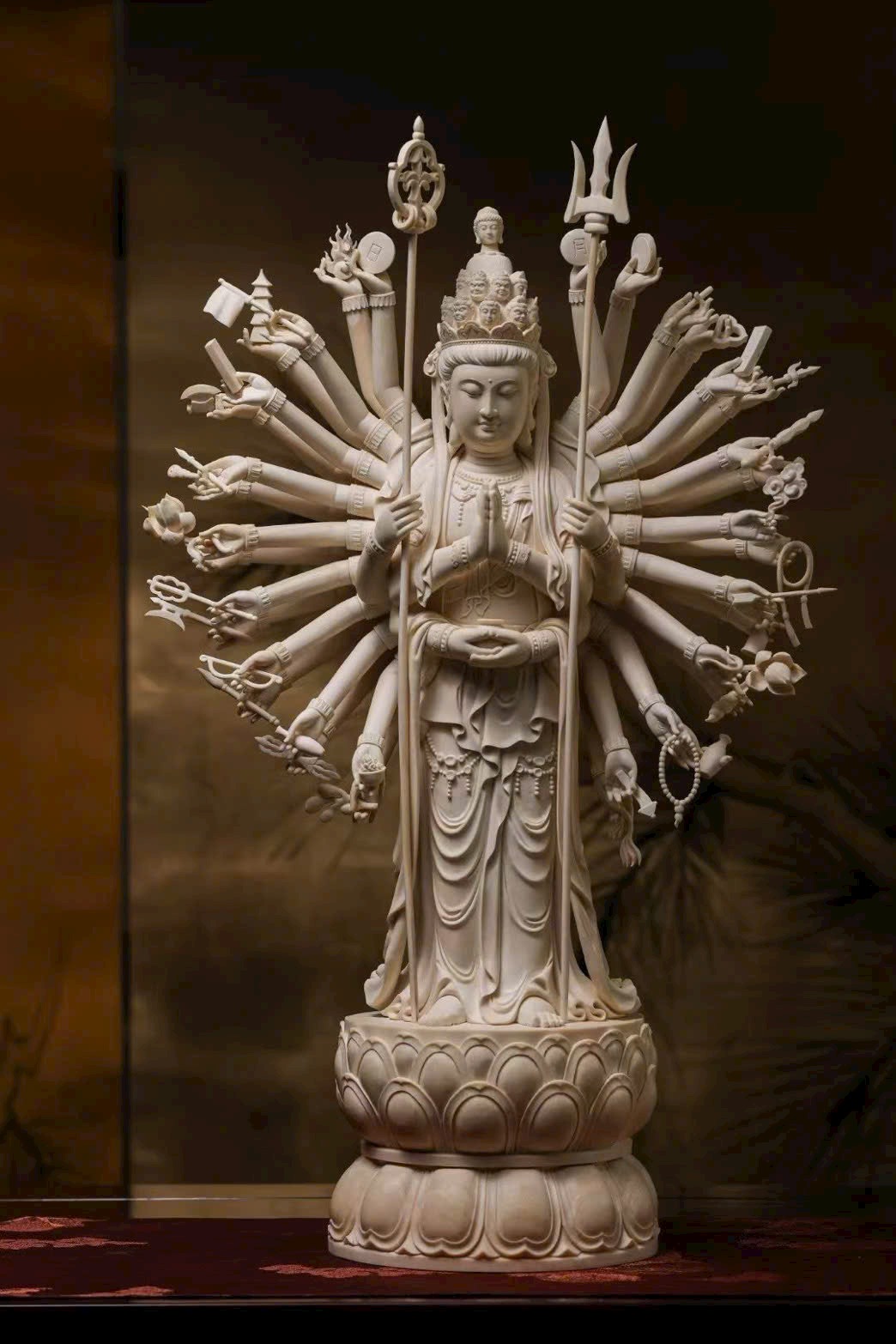 Chế tác công phu, tỉ mỉ và nghiêm cẩn; chạm khắc thành kính, đường dao thuần thục. Quan Âm từ bi đứng trang nghiêm, ngàn tay mở rộng uyển chuyển, mỗi tay như nắm các pháp khí khác nhau để cứu độ chúng sinh ba cõi. Tác phẩm mang vẻ trang nghiêm, linh thiêng — thích hợp để cúng dường, trưng bày và truyền lại phúc đức cùng trí tuệ cho gia đình.