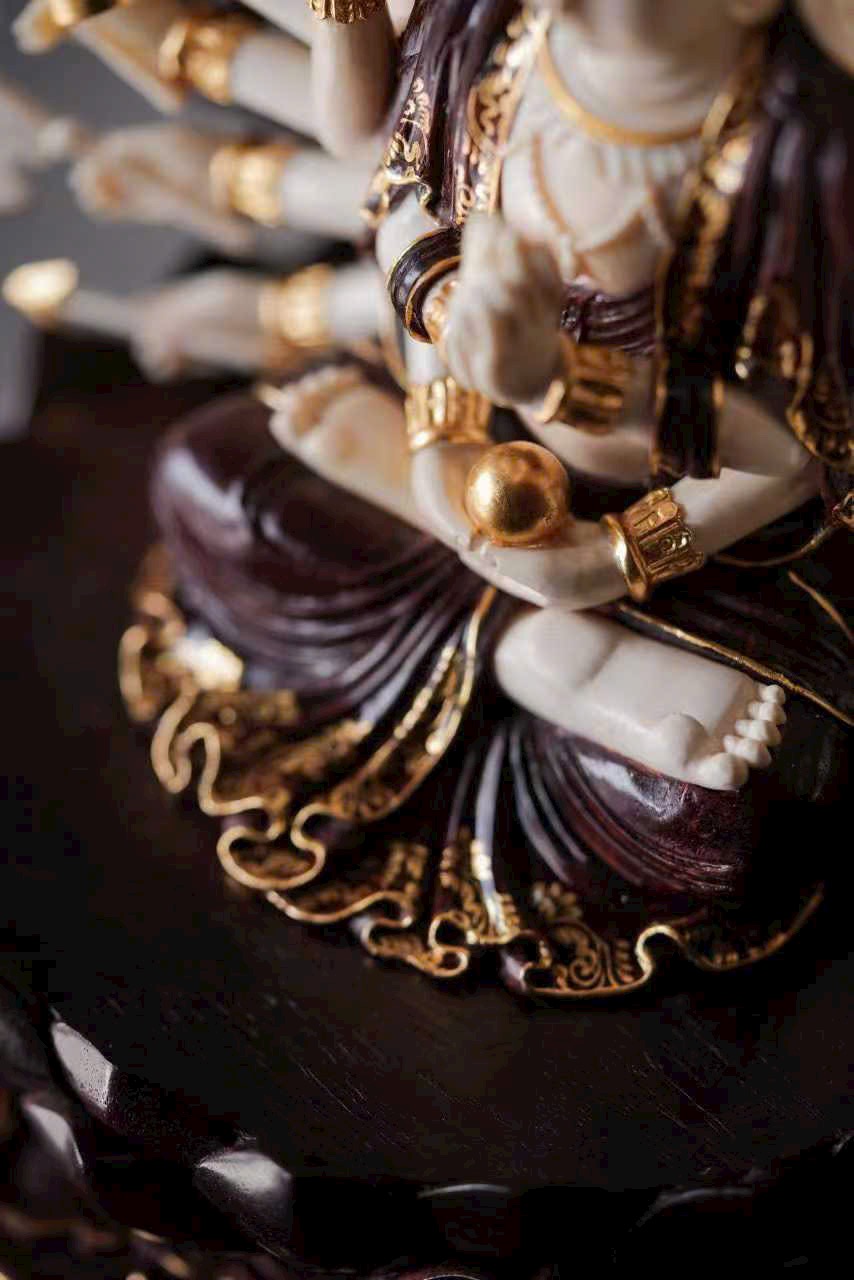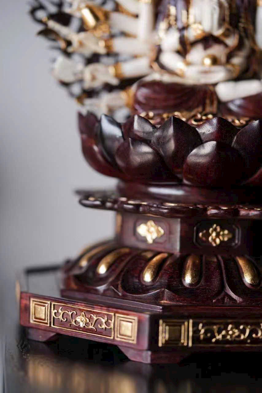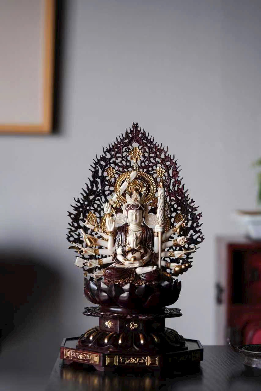 Toàn phẩm chế tác từ gỗ lão liệu, sắc tía trầm trang nhã, ánh lên độ bóng nhuận tinh tế. Kỹ pháp điêu khắc tinh xảo, phần ghép ngà và gỗ hòa quyện thành một thể hoàn mỹ. Diện tượng Quan Âm đầy đặn, thần thái sinh động; nghìn tay nghìn pháp khí, ứng hiện khắp nơi cứu độ chúng sinh. Điểm xuyết mạ vàng, tạo nên hiệu quả thị giác trang nghiêm rực rỡ.
