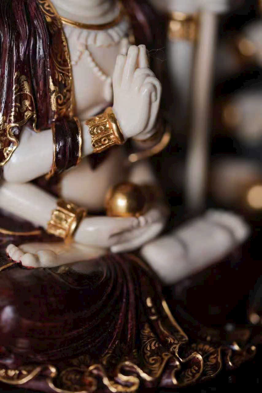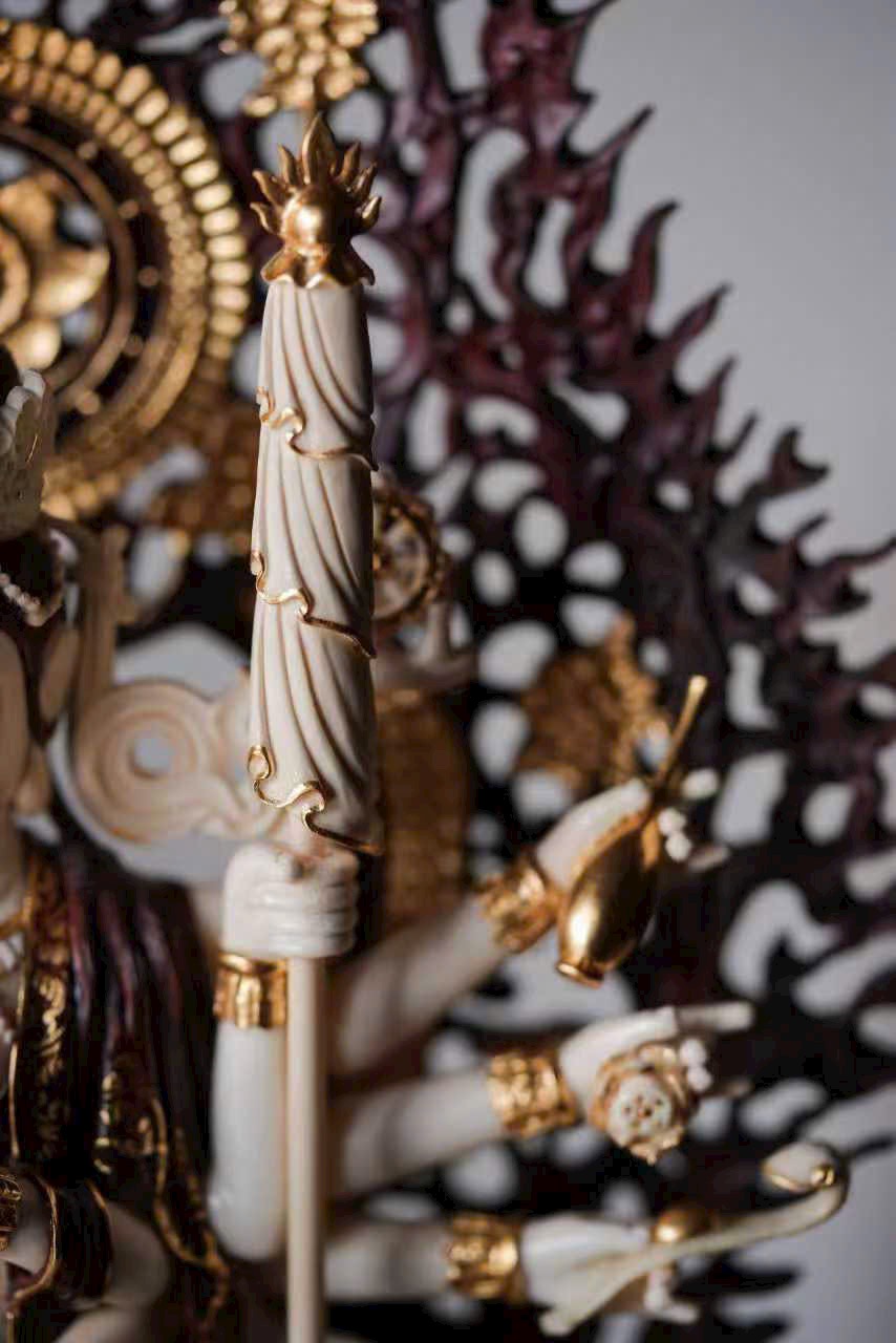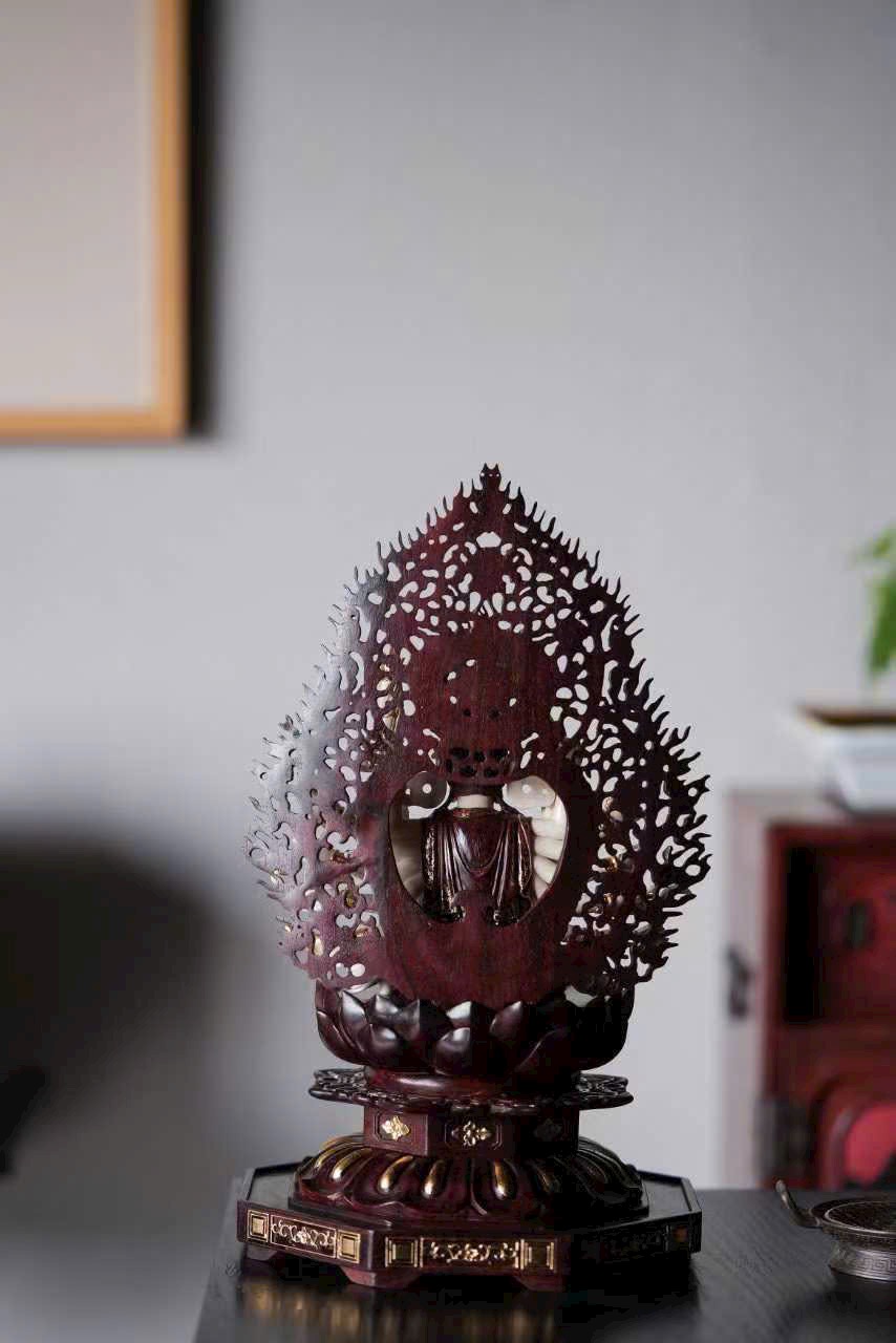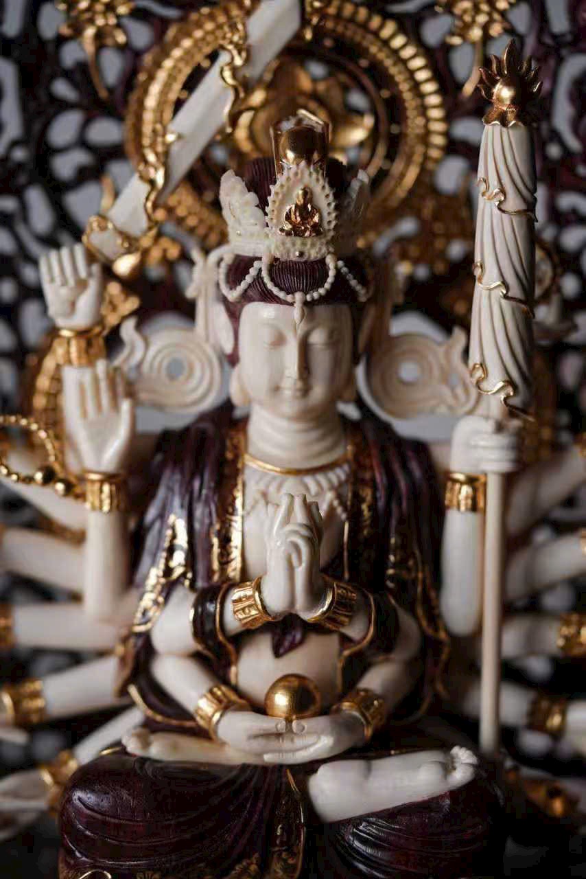Toàn phẩm chế tác từ gỗ lão liệu, sắc tía trầm trang nhã, ánh lên độ bóng nhuận tinh tế. Kỹ pháp điêu khắc tinh xảo, phần ghép ngà và gỗ hòa quyện thành một thể hoàn mỹ. Diện tượng Quan Âm đầy đặn, thần thái sinh động; nghìn tay nghìn pháp khí, ứng hiện khắp nơi cứu độ chúng sinh. Điểm xuyết mạ vàng, tạo nên hiệu quả thị giác trang nghiêm rực rỡ.