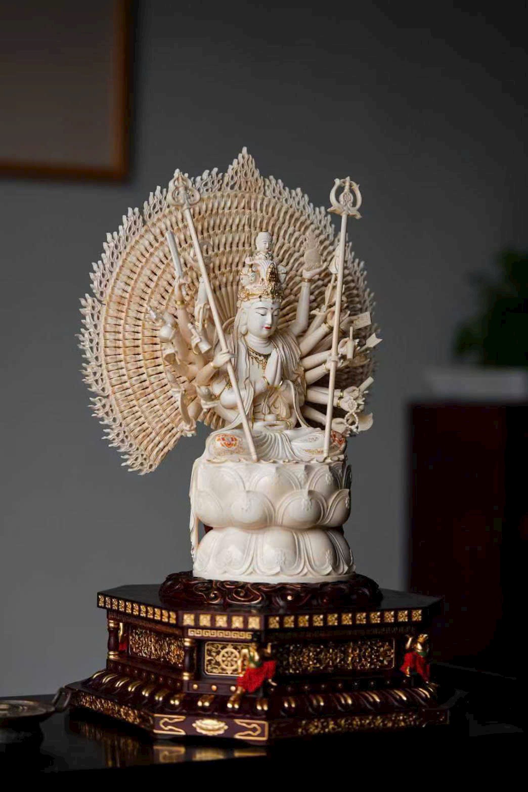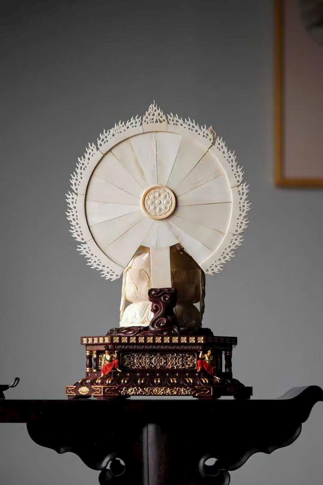 Sự kết hợp giữa n.gà voi ma mút thuần tịnh, tử đàn thâm trầm và họa pháp kim tuyến tạo nên một tác phẩm kỳ mỹ hiếm có, vừa linh thiêng vừa sang quý — là biểu tượng của từ bi, trí tuệ và cát tường viên mãn.