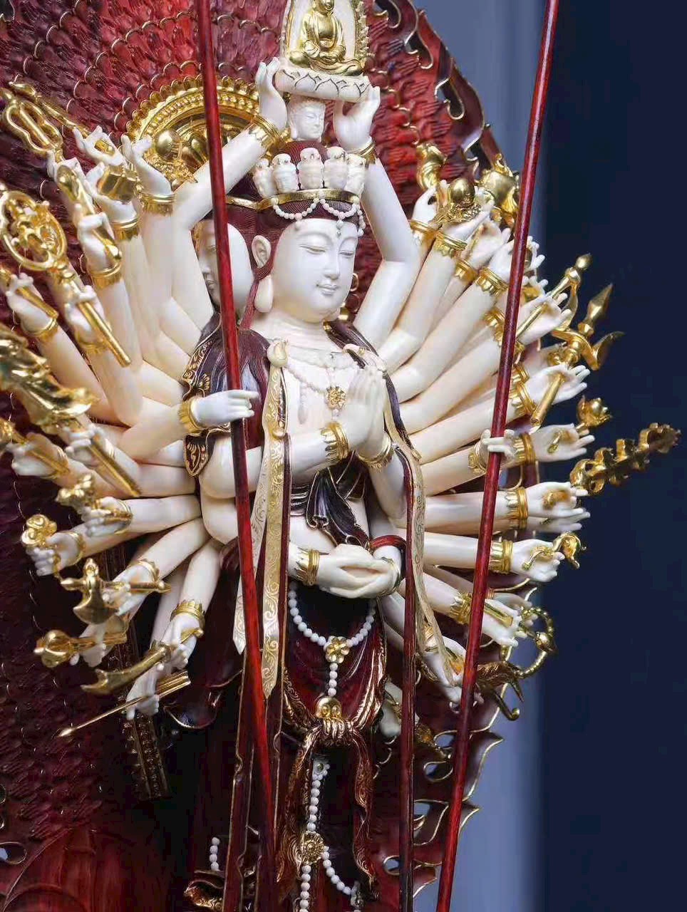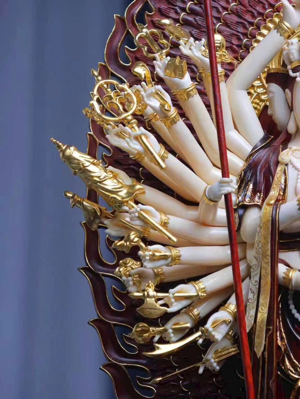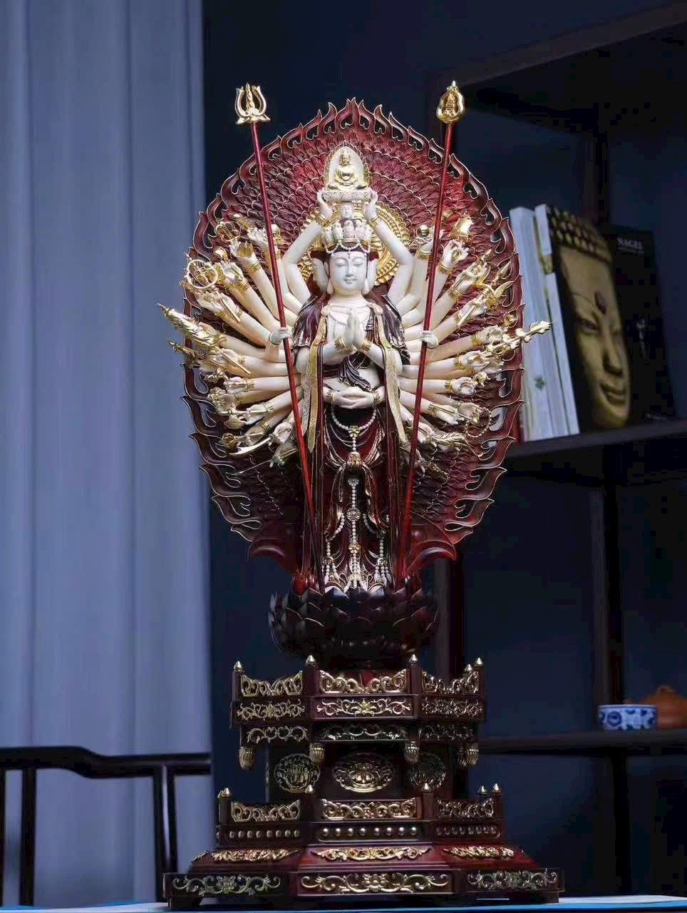 - Tượng Thiên Thủ Quan Âm điêu khắc tinh xảo, chi tiết tỉ mỉ, các pháp khí bóng loáng, mạ vàng thủ công rõ nét, uy nghiêm hùng tráng.