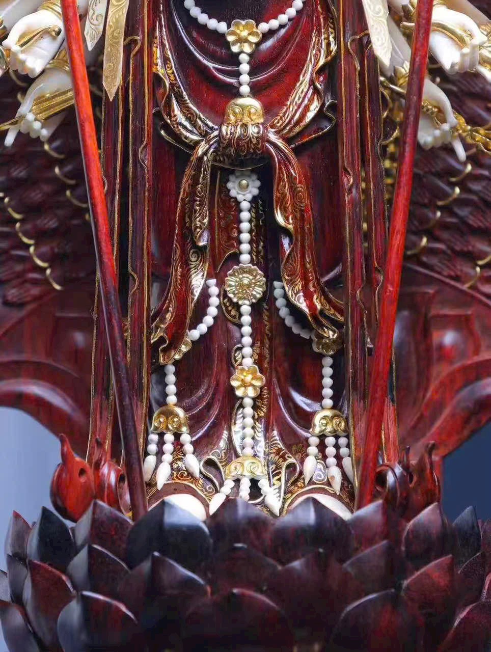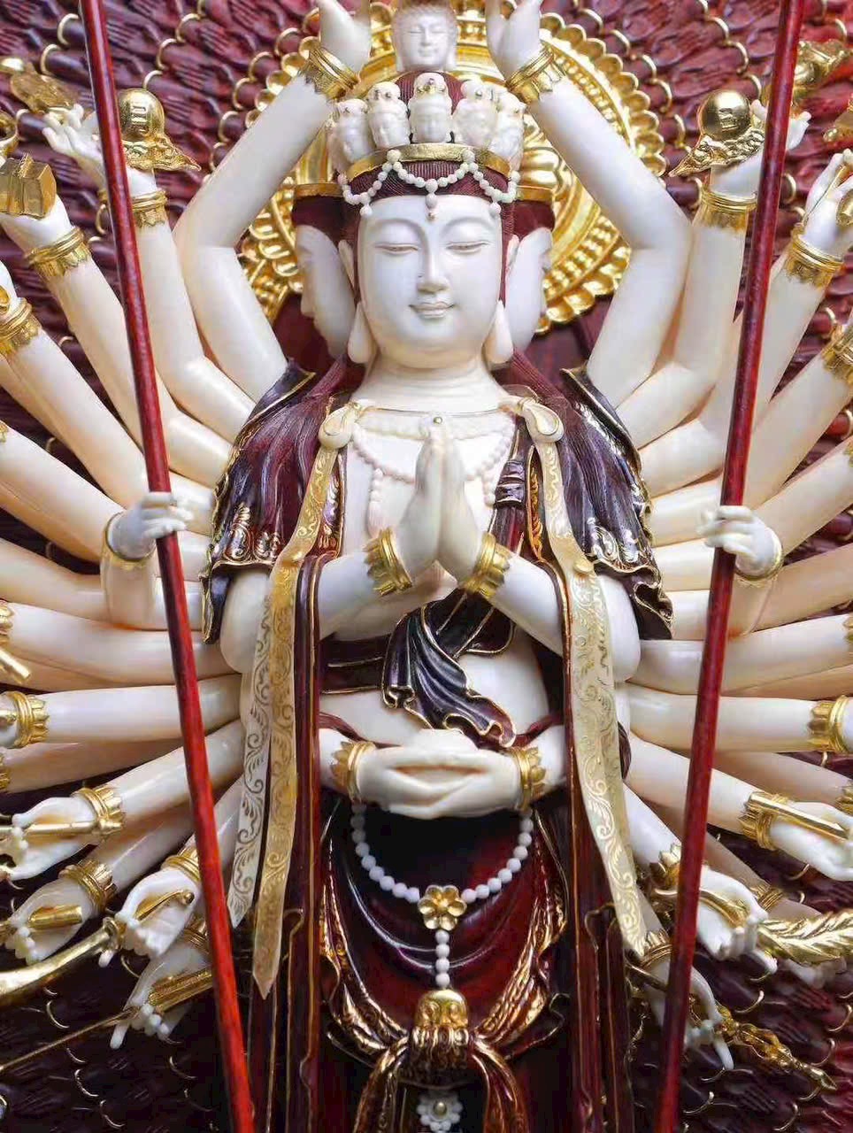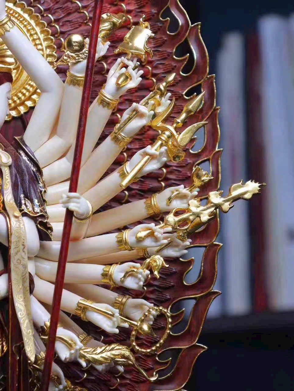 - Tượng Thiên Thủ Quan Âm điêu khắc tinh xảo, chi tiết tỉ mỉ, các pháp khí bóng loáng, mạ vàng thủ công rõ nét, uy nghiêm hùng tráng.