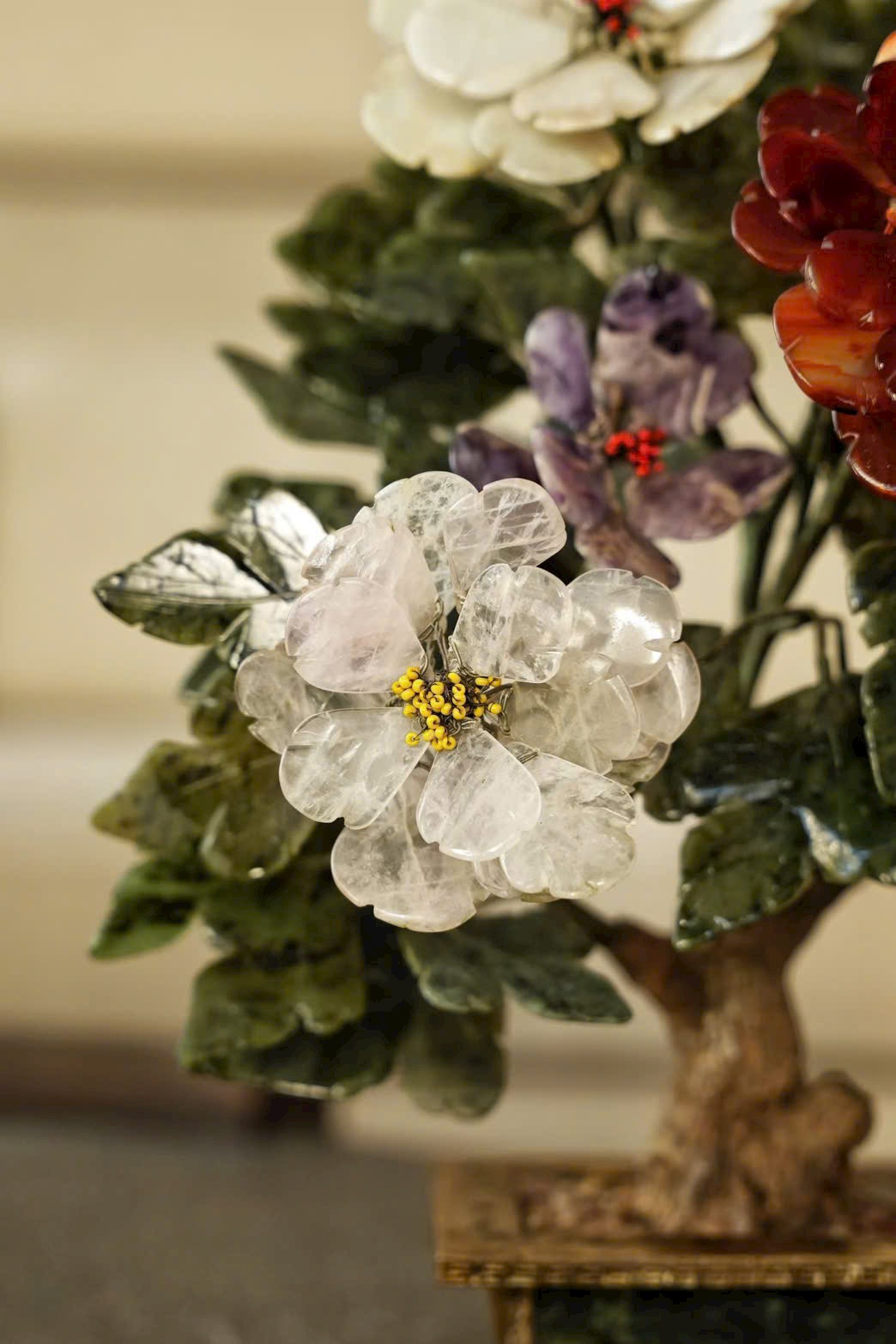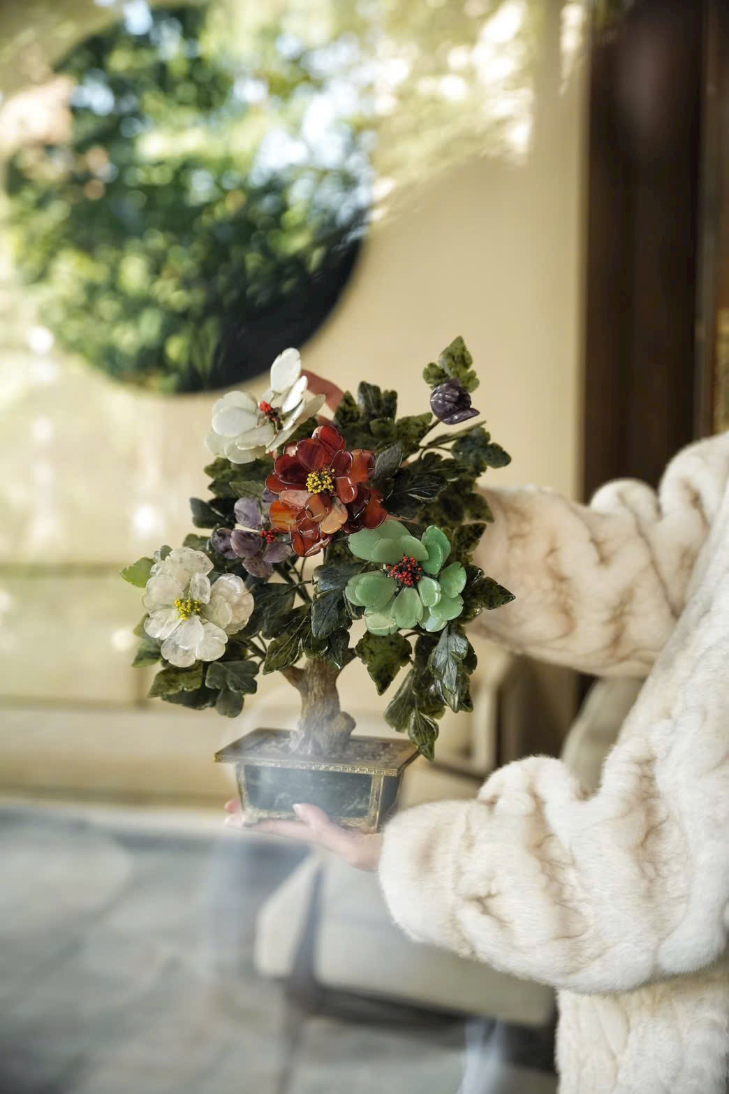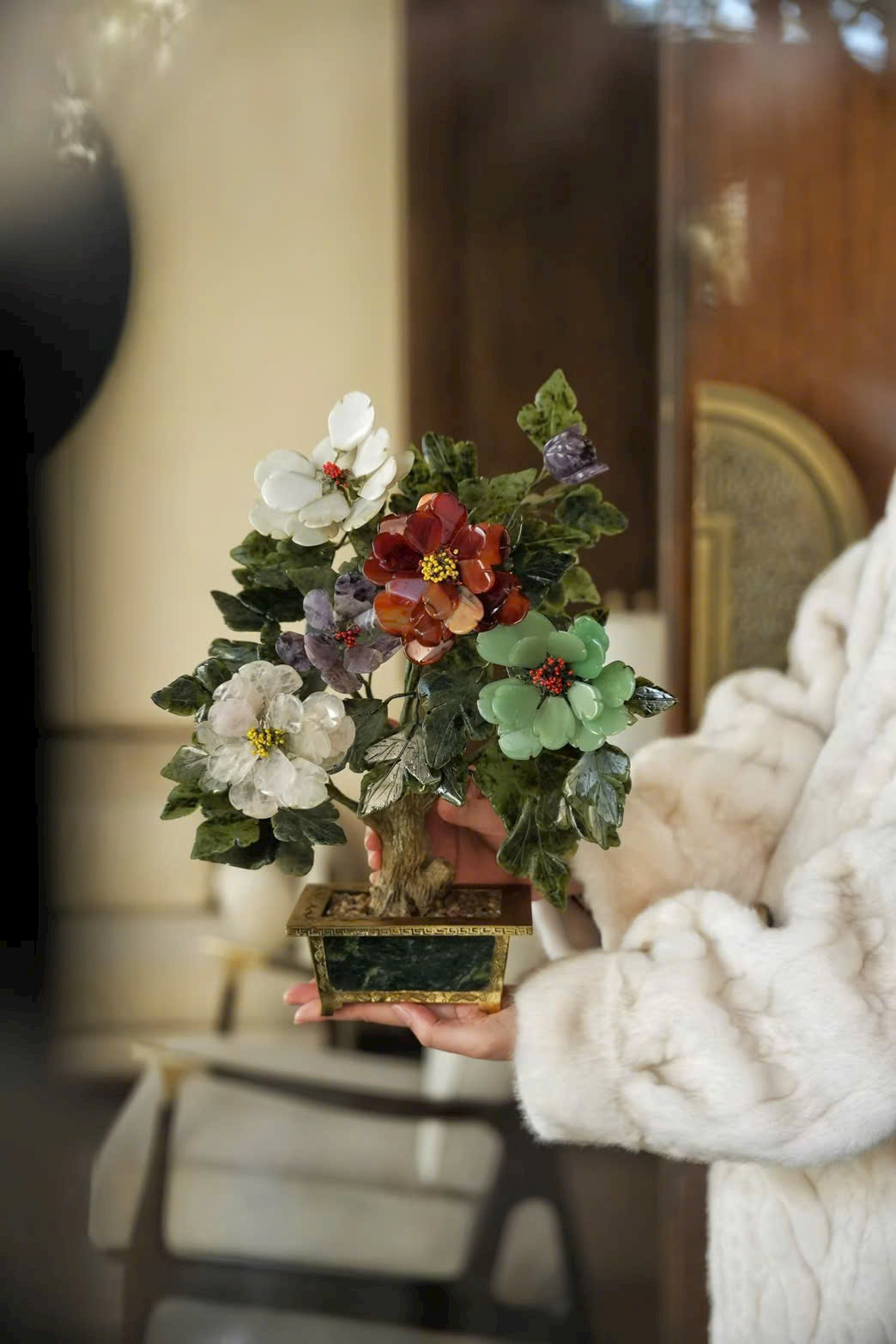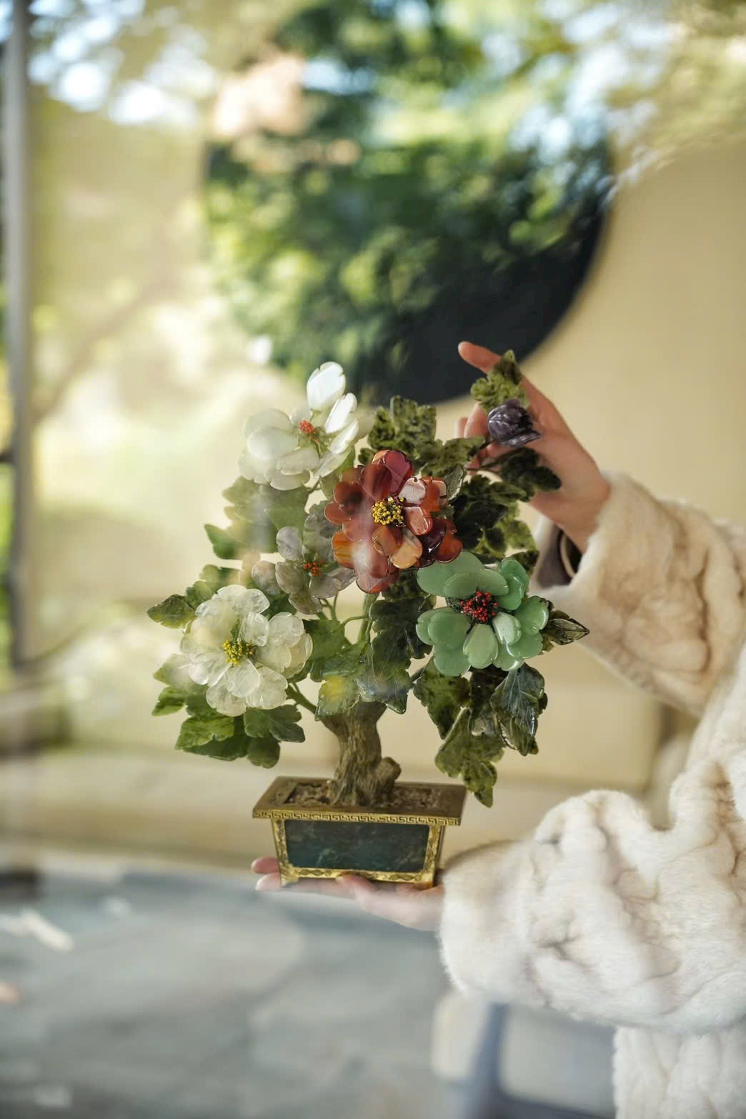Tác phẩm bồn cảnh tượng sinh tái hiện mẫu đơn ngọc nhiều màu, tượng trưng cho phú quý, thịnh vượng và vinh hoa. Chậu mạ vàng khảm ngọc tạo cảm giác quý khí – sang trọng, cực kỳ hợp trưng tủ cổ, bàn trà, phòng khách hoặc phòng sưu tầm.