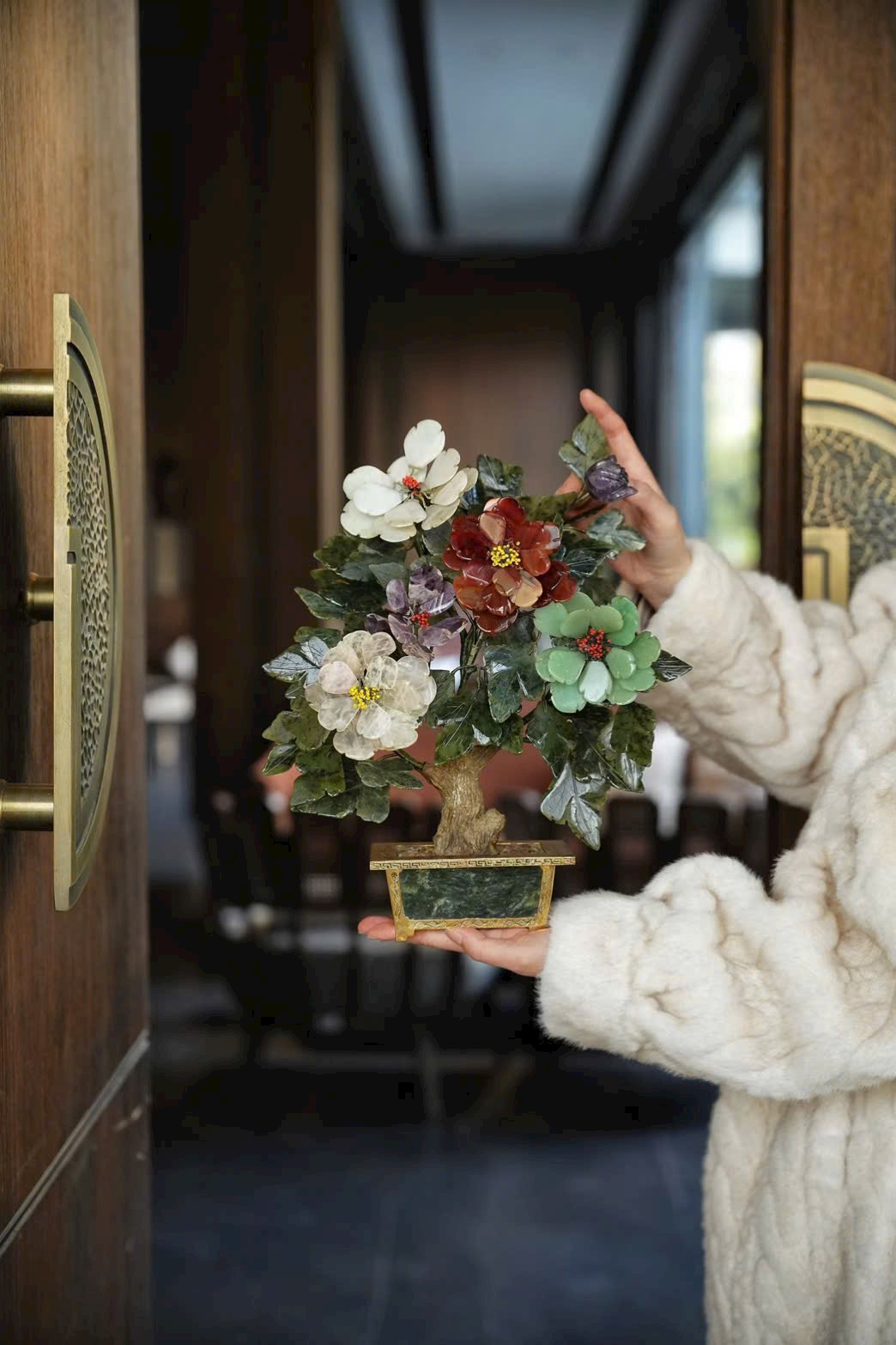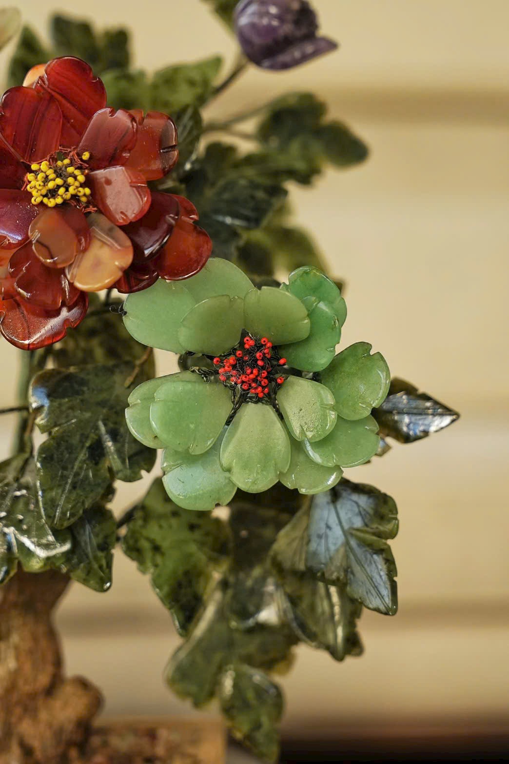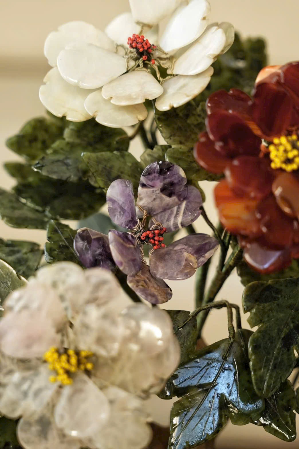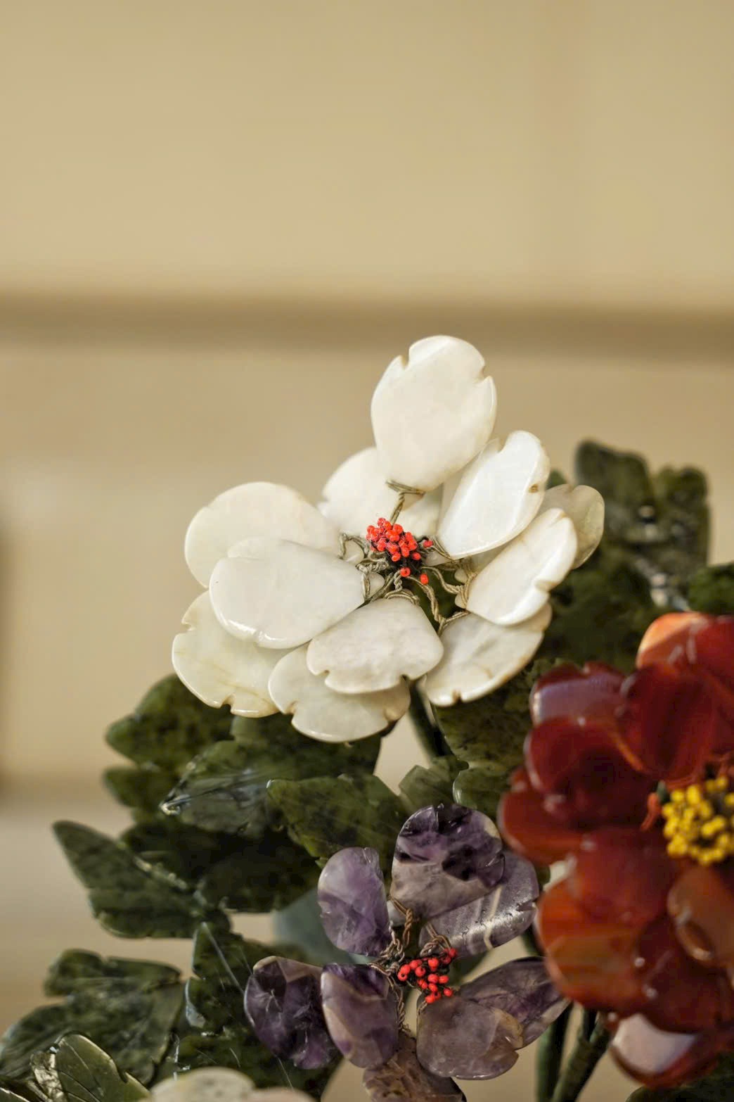 Tác phẩm bồn cảnh tượng sinh tái hiện mẫu đơn ngọc nhiều màu, tượng trưng cho phú quý, thịnh vượng và vinh hoa. Chậu mạ vàng khảm ngọc tạo cảm giác quý khí – sang trọng, cực kỳ hợp trưng tủ cổ, bàn trà, phòng khách hoặc phòng sưu tầm.