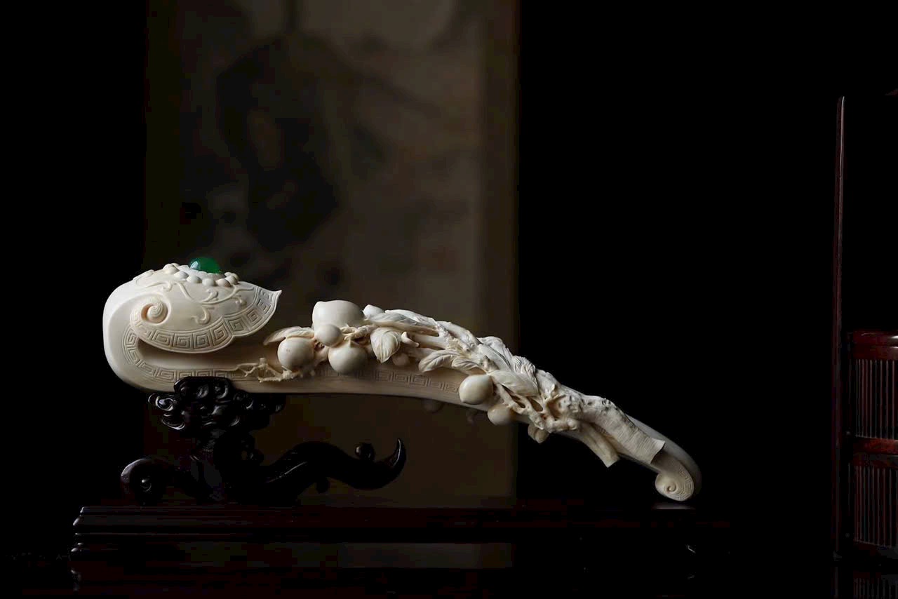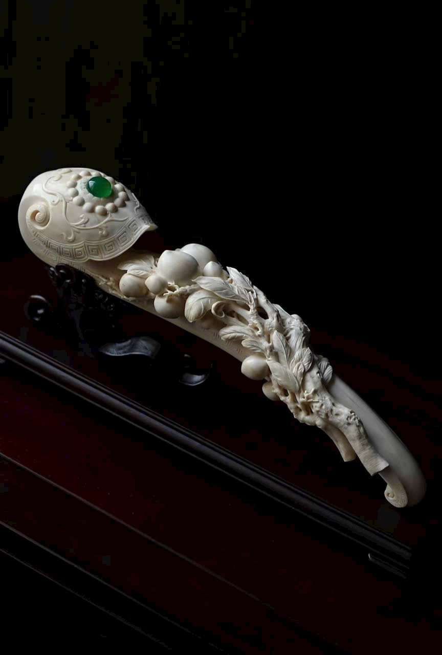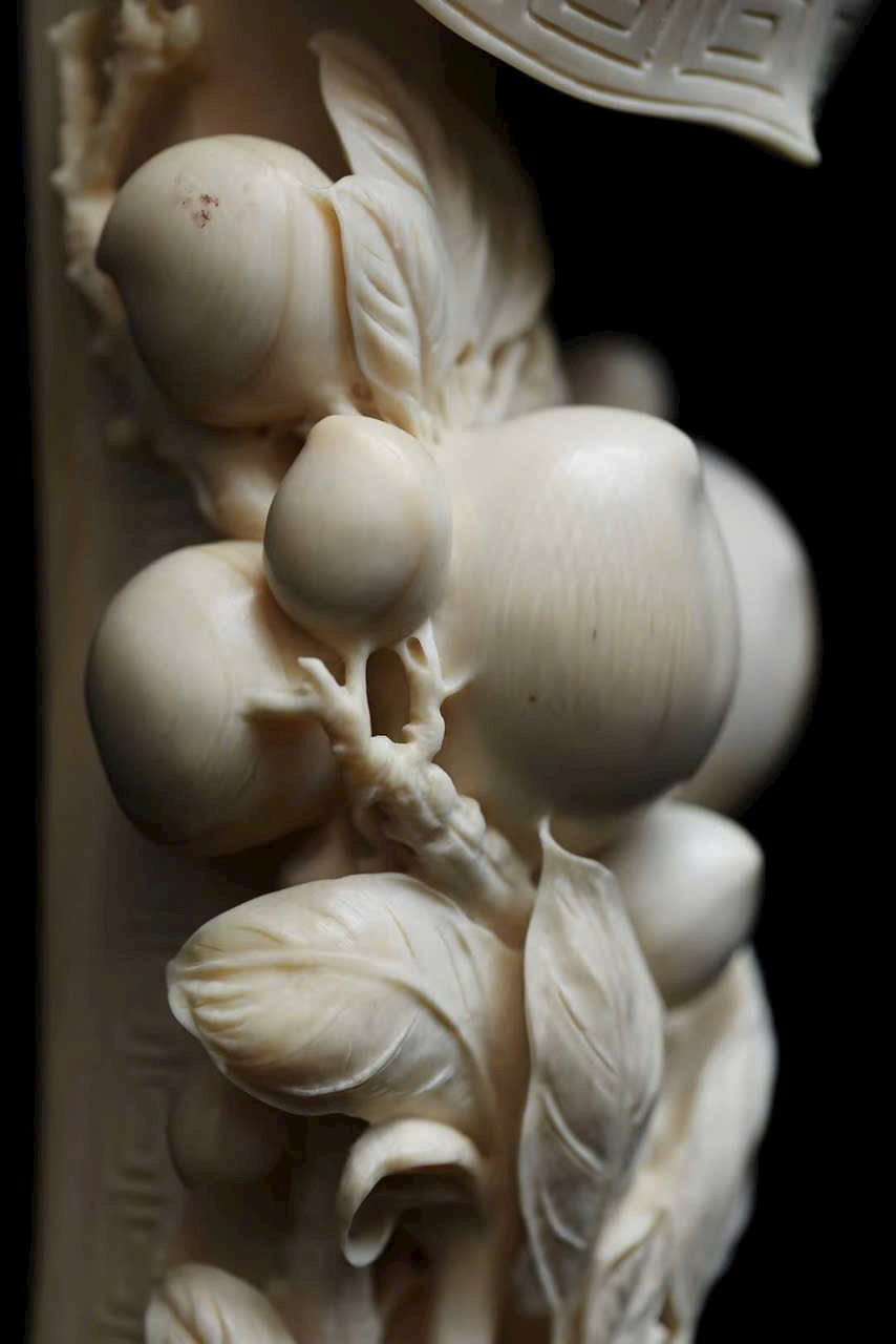Tác phẩm điêu khắc từ một khối n.gà lớn, quả đào thọ nối liền với nhành lá uốn quanh như ý, mang ý nghĩa cát tường