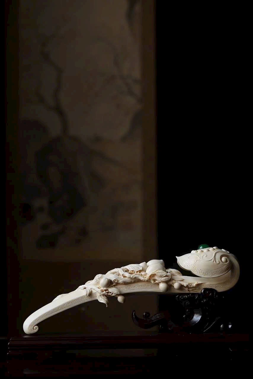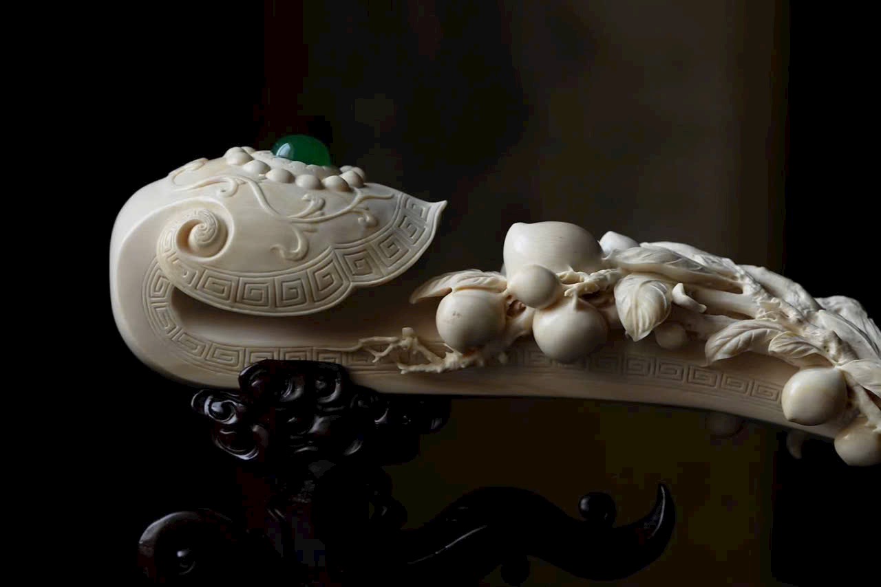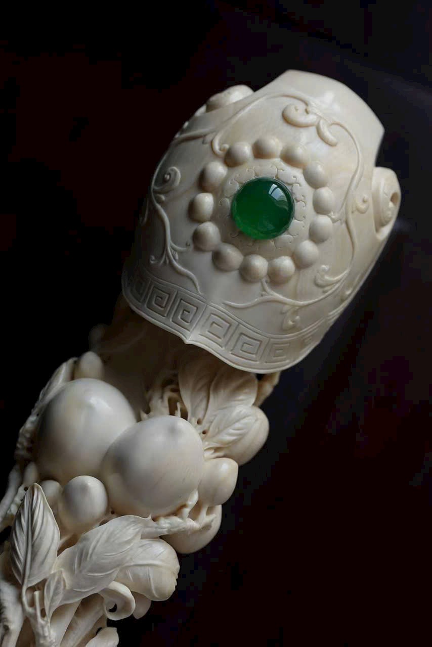 Tác phẩm điêu khắc từ một khối n.gà lớn, quả đào thọ nối liền với nhành lá uốn quanh như ý, mang ý nghĩa cát tường