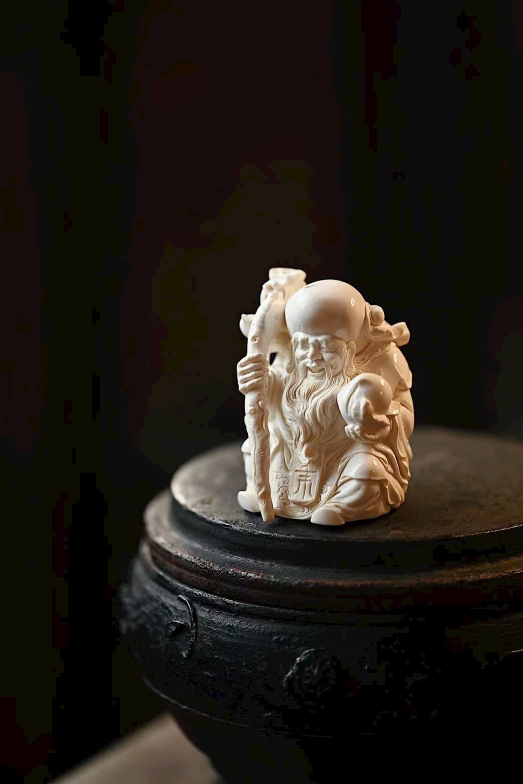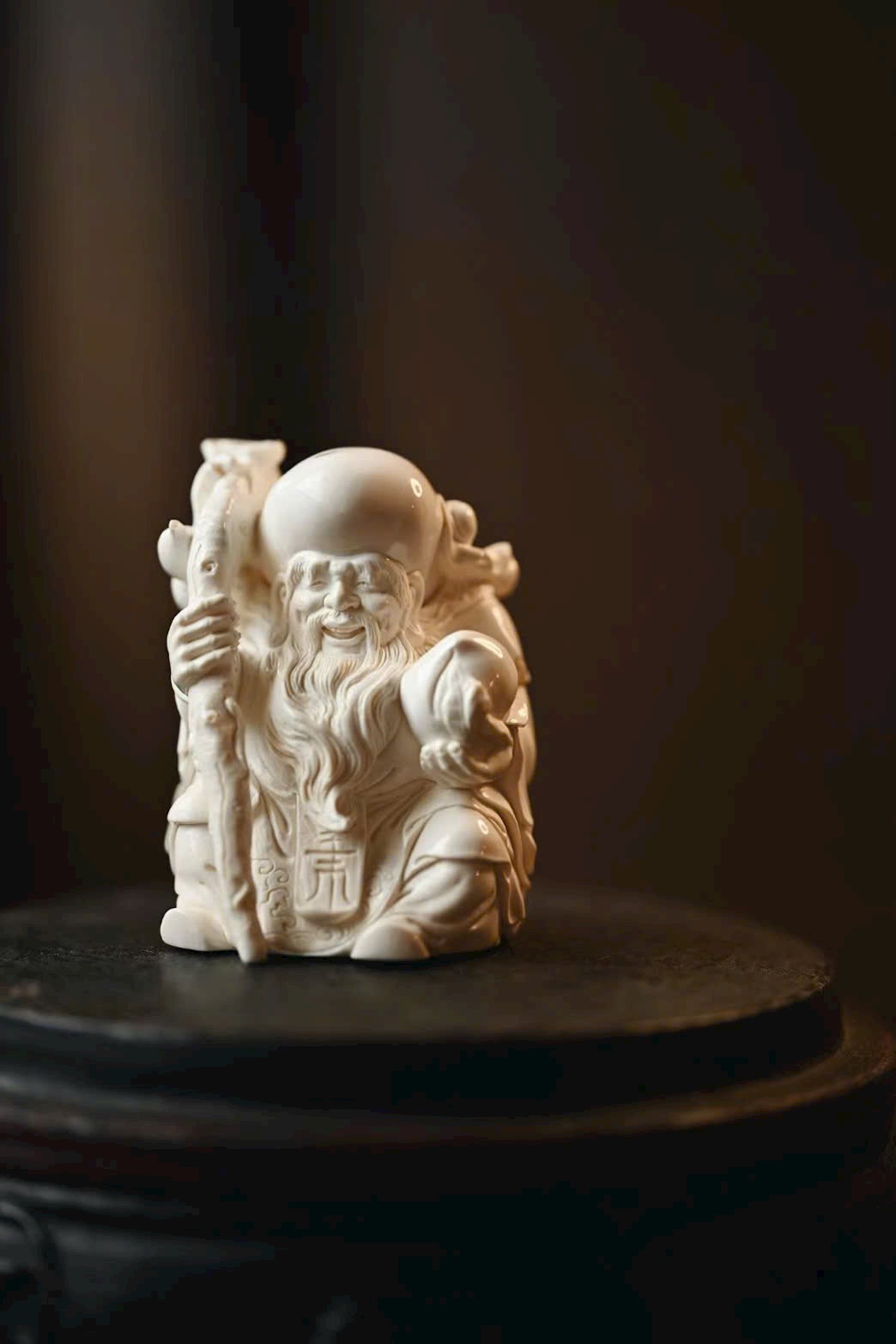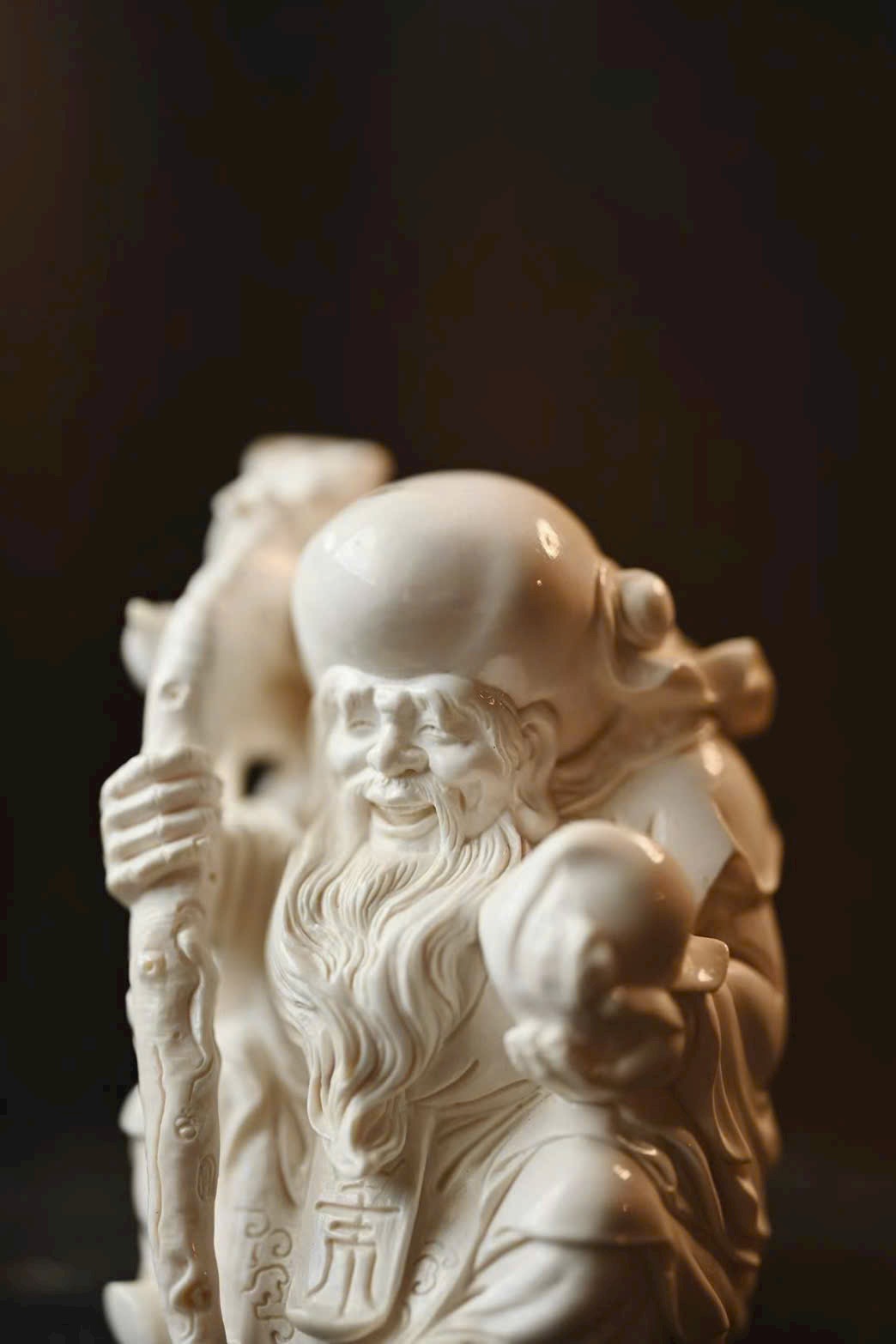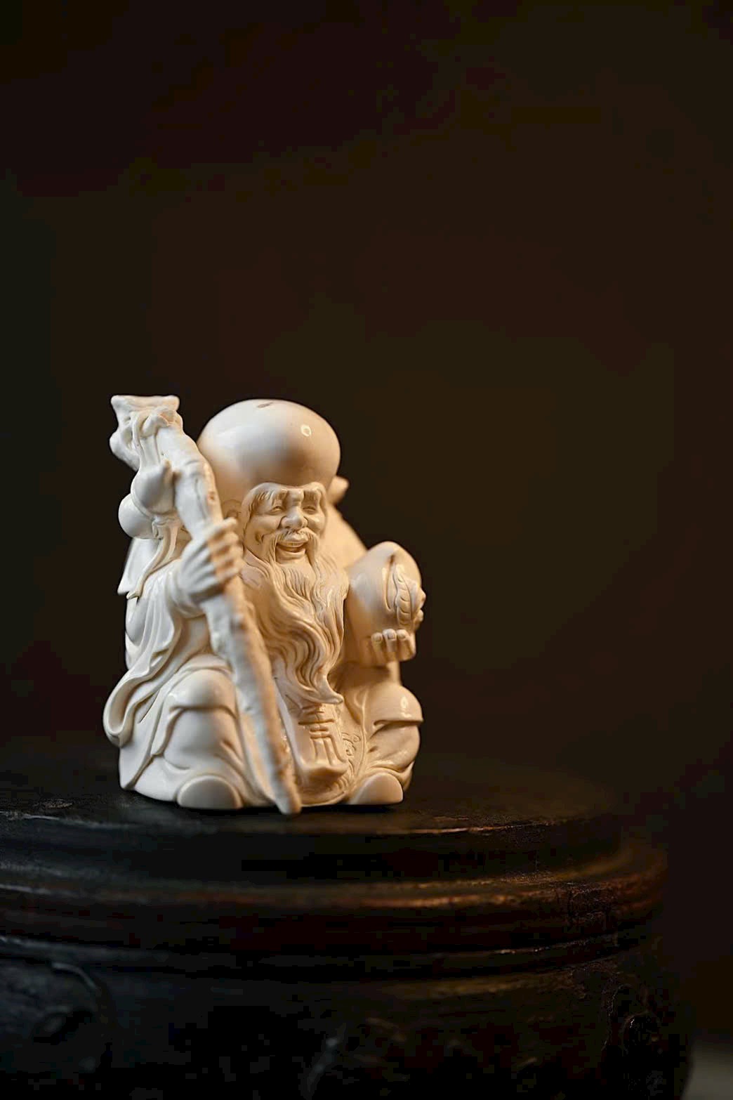 Tượng Thọ Tinh đầu cao trán rộng, khăn buộc sau đầu, mày rậm mắt hiền, râu dài đến ngực, nụ cười hiền hòa. Khoác áo rộng tay, nếp áo mềm mại tự nhiên, tay cầm tiên đào – biểu tượng trường thọ và cát tường. Phù hợp bày trên án thư, mang ý nghĩa may mắn.