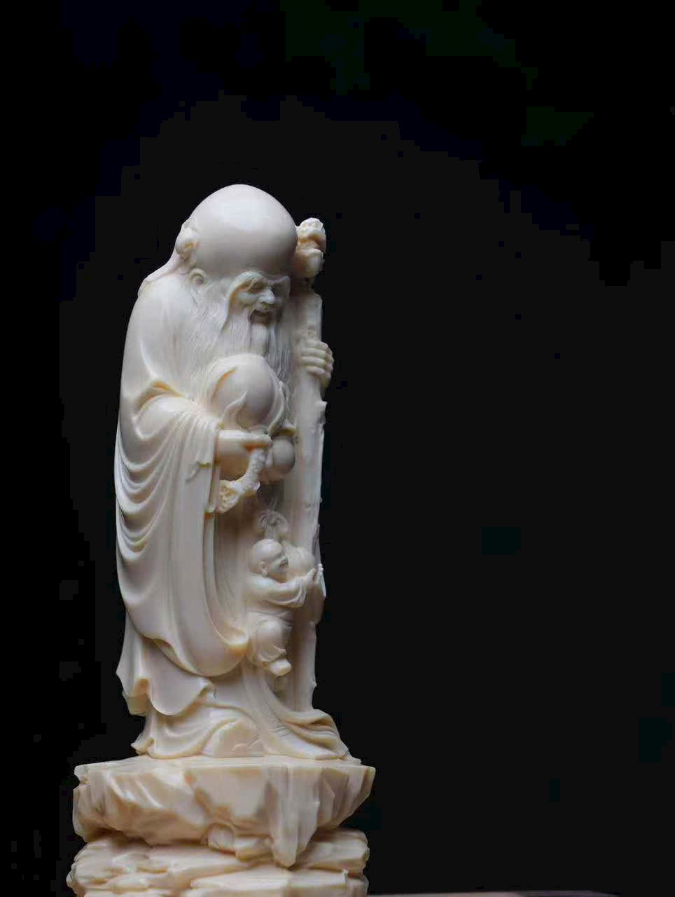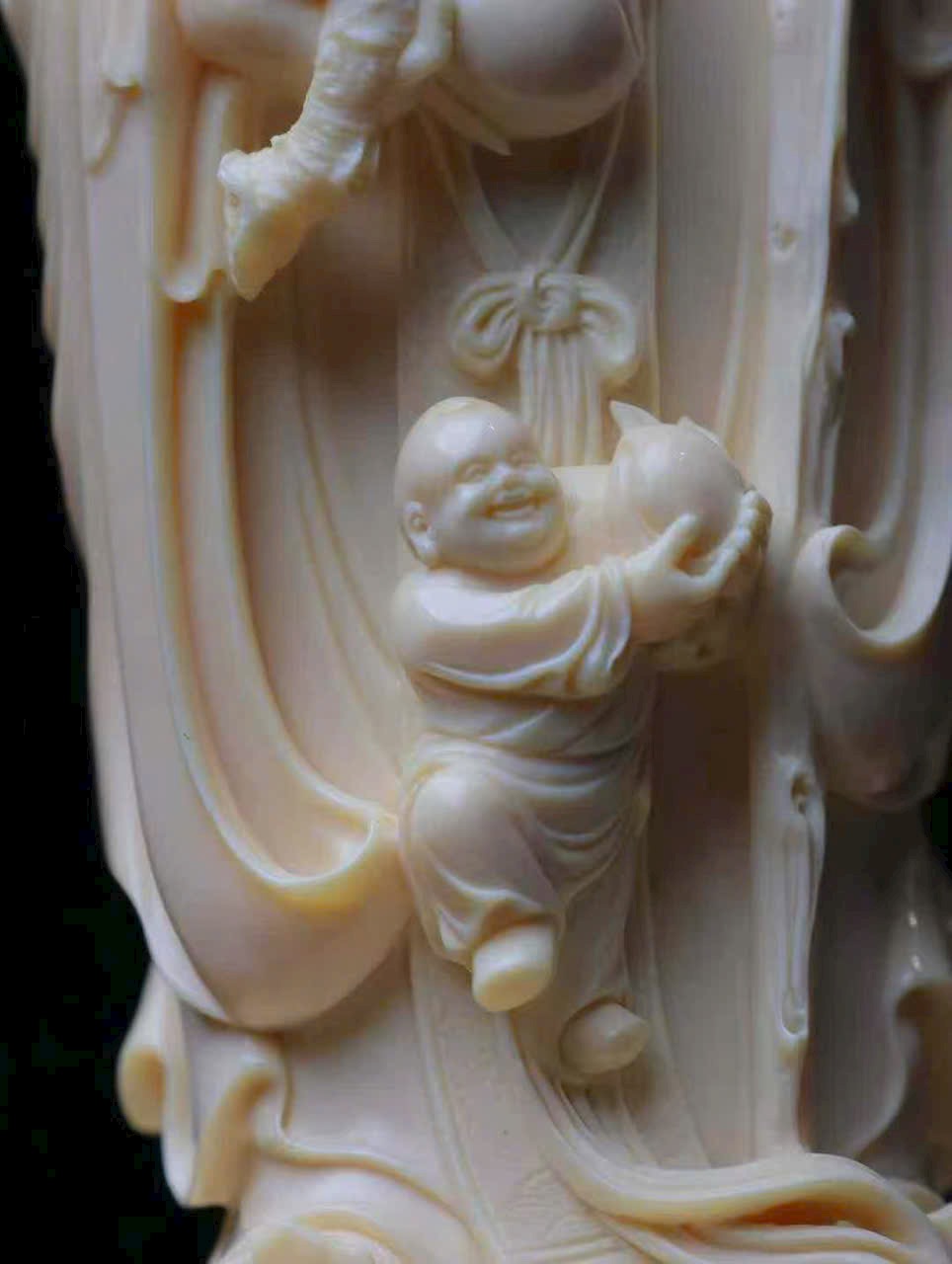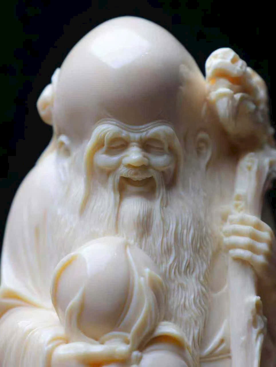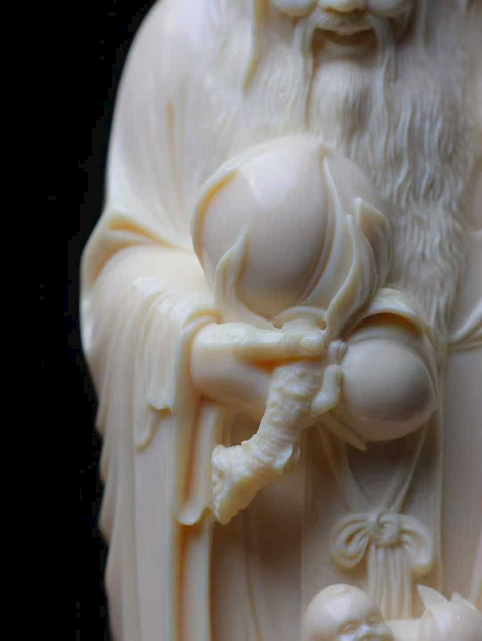 Gương mặt Thọ Tinh tròn đầy, trán cao nhô, râu tóc trên ngực bay bồng; đôi lông mày hiền từ, biểu cảm nhân hậu. Tay phải nâng quả đào trường thọ, bên cạnh là đứa trẻ tinh nghịch, đáng yêu, toát lên khí chất tiên phong đạo cốt.