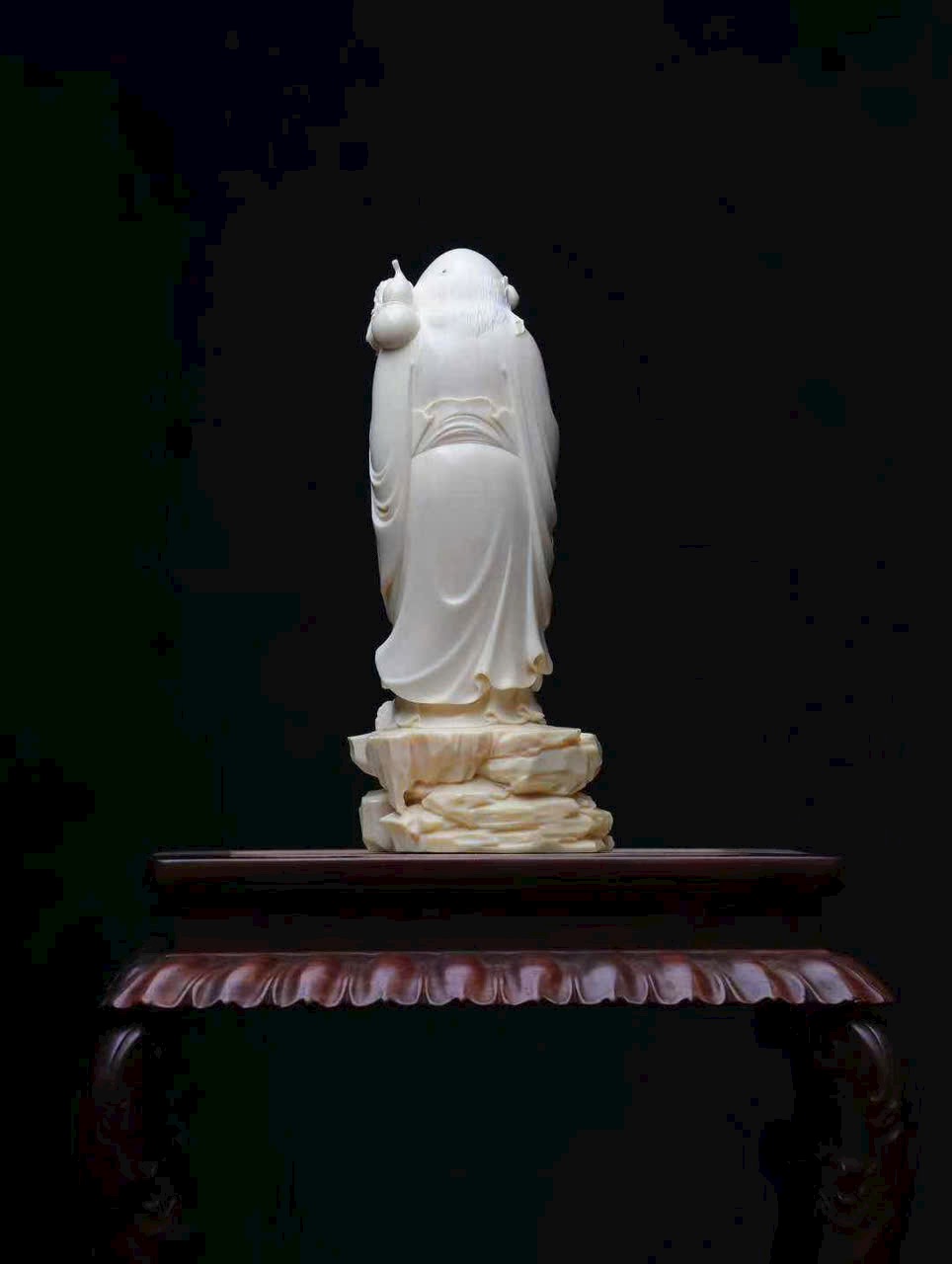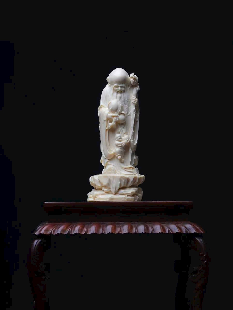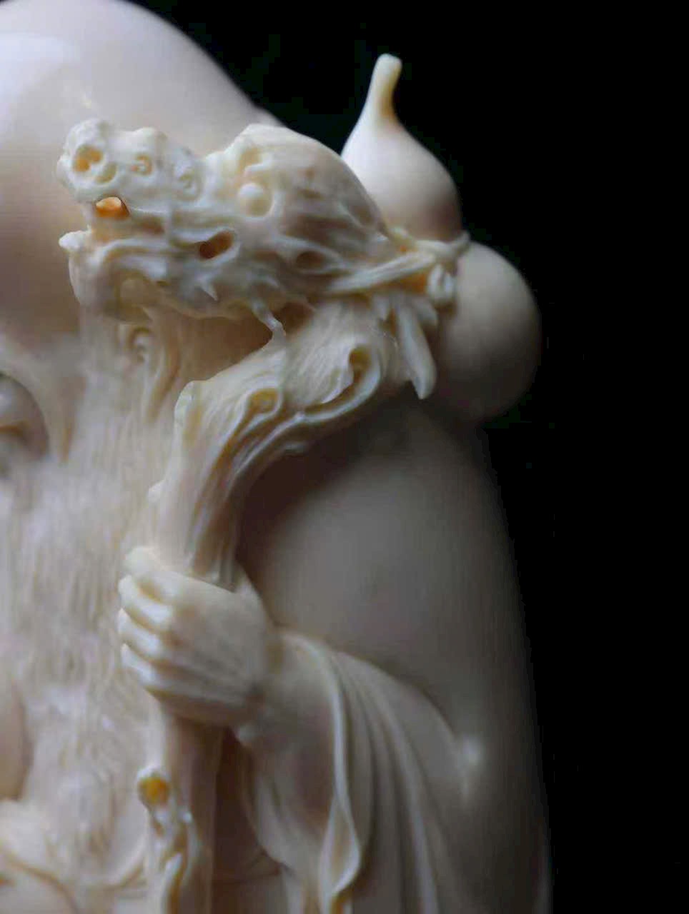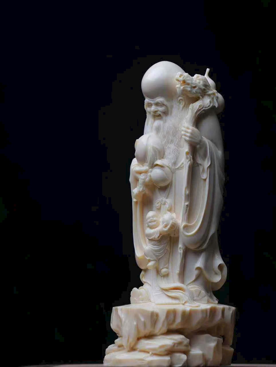 Gương mặt Thọ Tinh tròn đầy, trán cao nhô, râu tóc trên ngực bay bồng; đôi lông mày hiền từ, biểu cảm nhân hậu. Tay phải nâng quả đào trường thọ, bên cạnh là đứa trẻ tinh nghịch, đáng yêu, toát lên khí chất tiên phong đạo cốt.