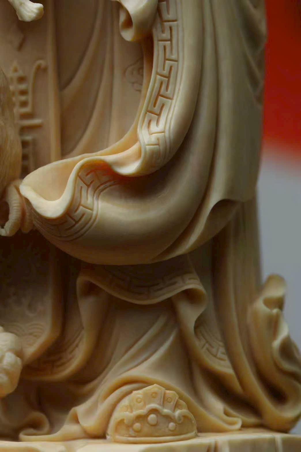 Chiếc đào tiên trong tay biểu trưng cho trường sinh bất lão, tổng thể tạo nên dáng vẻ thanh thoát mà trang nghiêm, thích hợp trưng bày trong phòng khách, thư phòng hoặc không gian thờ tự, mang ý nghĩa cầu phúc thọ an khang cho gia chủ.