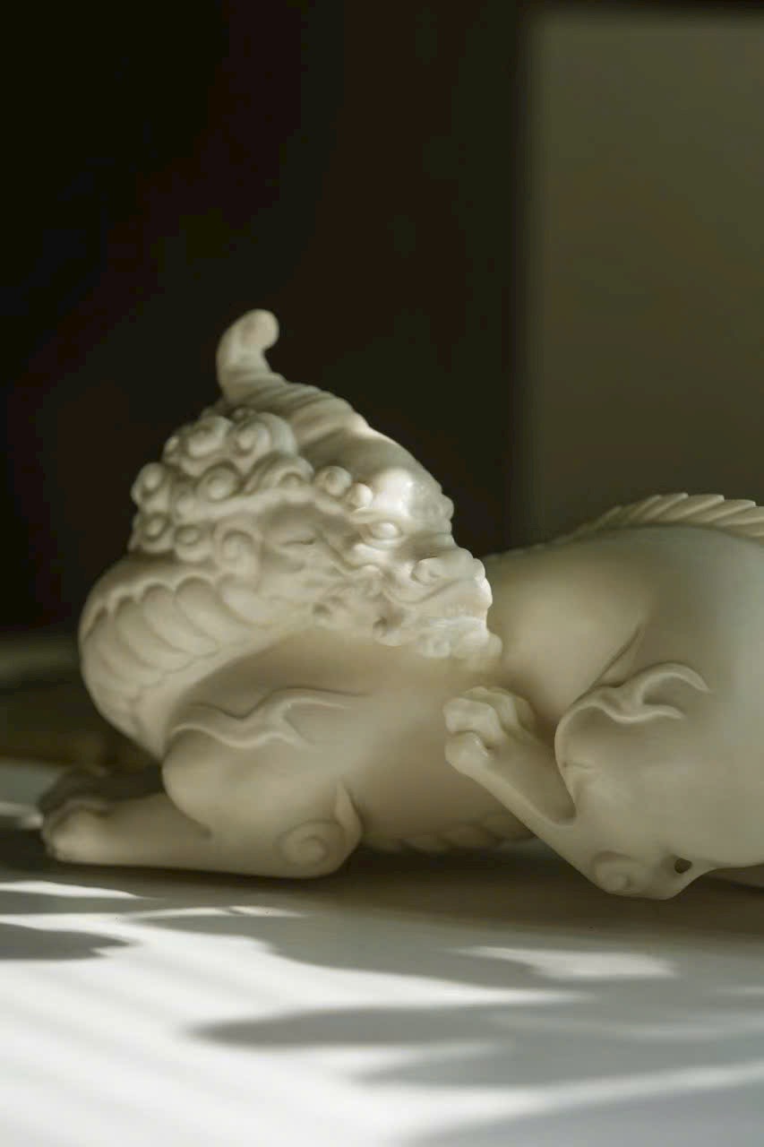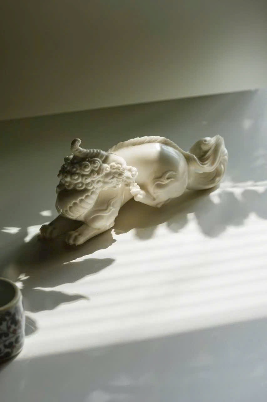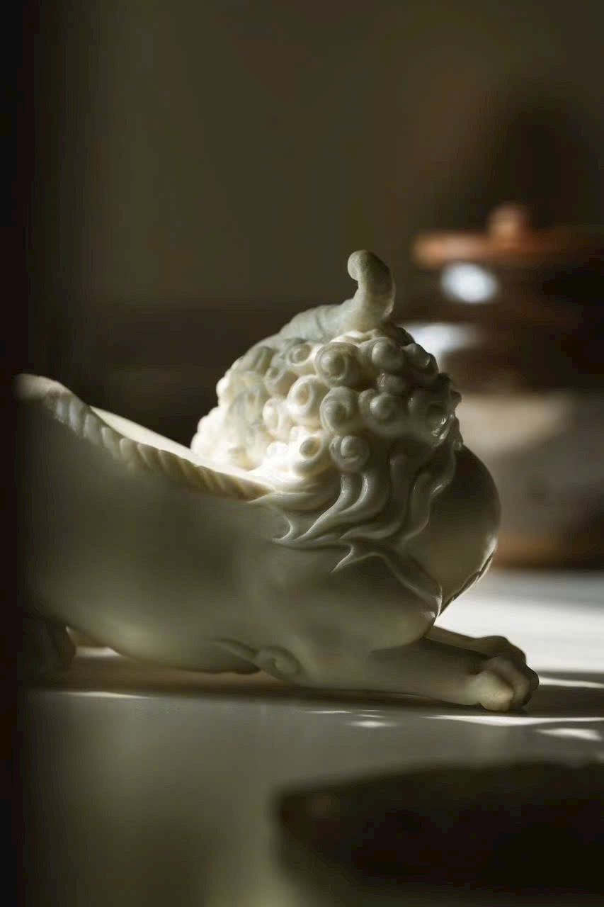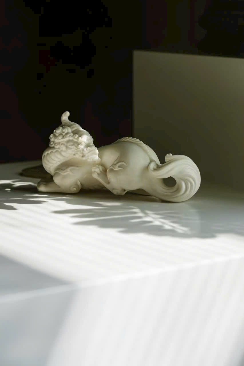 Đầu thú toát khí thế uy hùng, tư thế nằm ngồi vững chãi, không giận mà vẫn uy nghi. Thân hình cân đối khỏe mạnh, khoác họa tiết lửa cháy, chất liệu trong sáng tinh khiết, tay nghề và phẩm chất đều đủ. Phẩm chơi tao nhã nơi án thư.