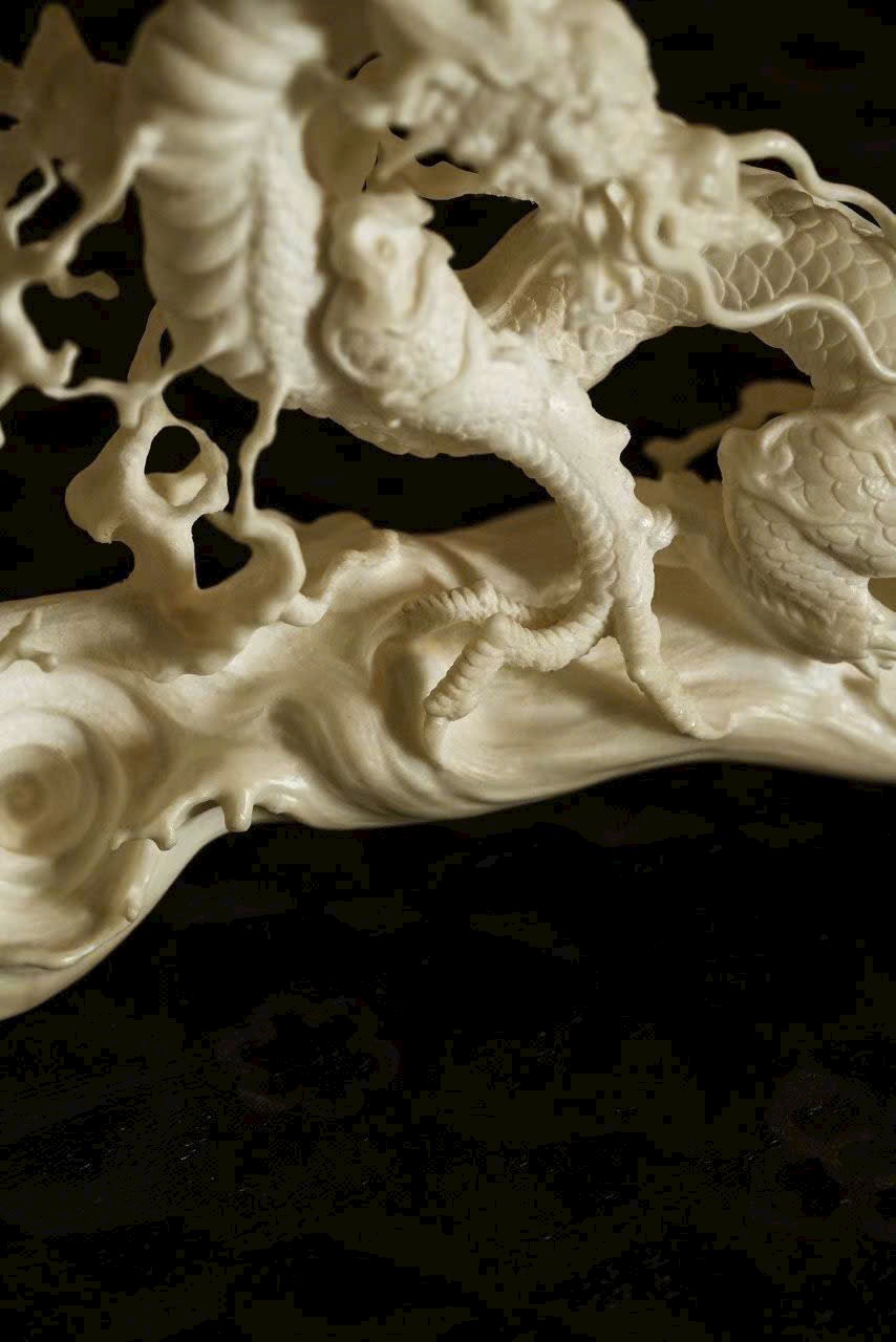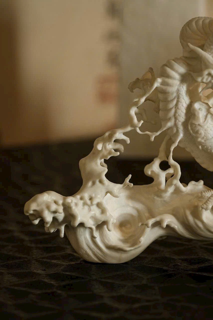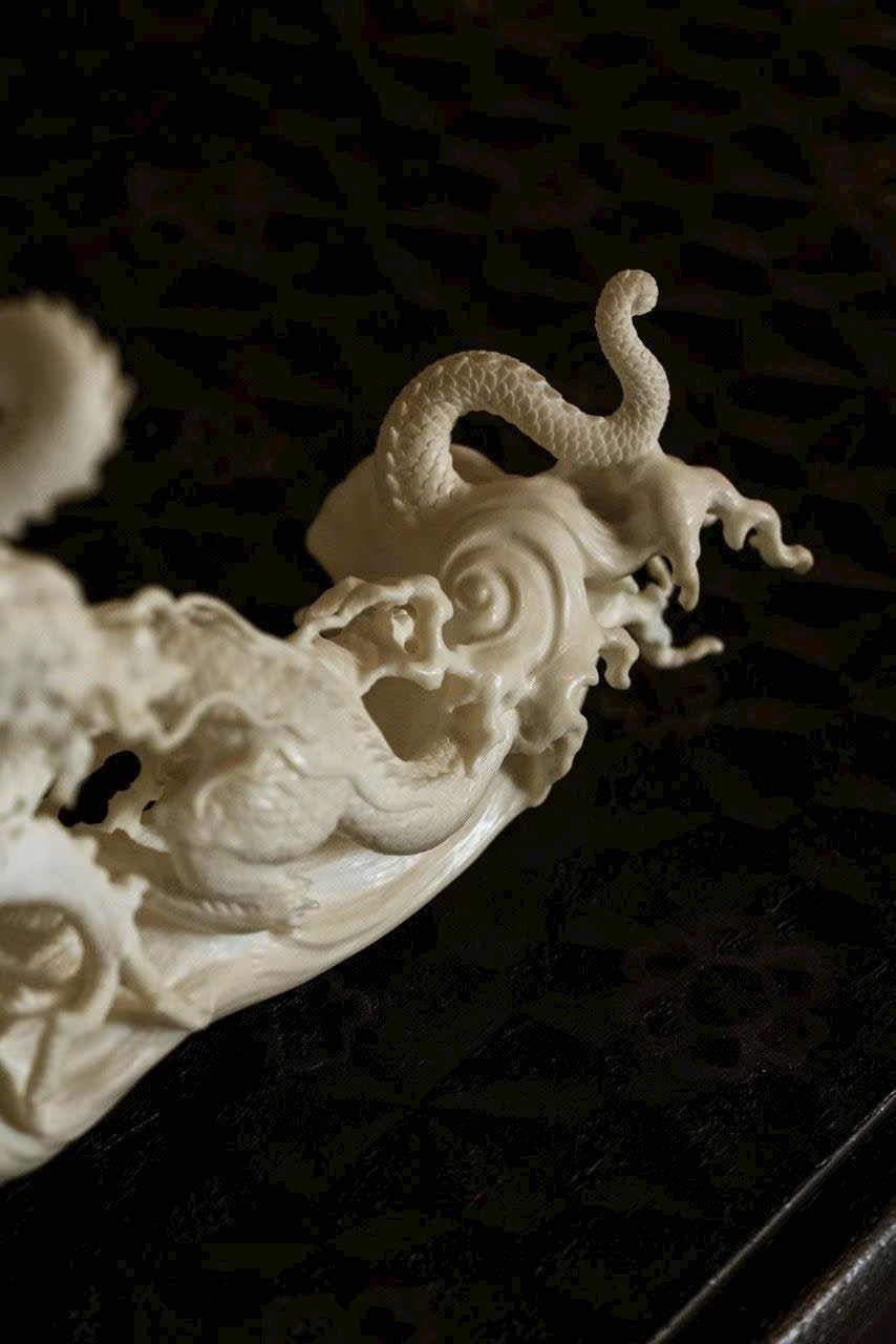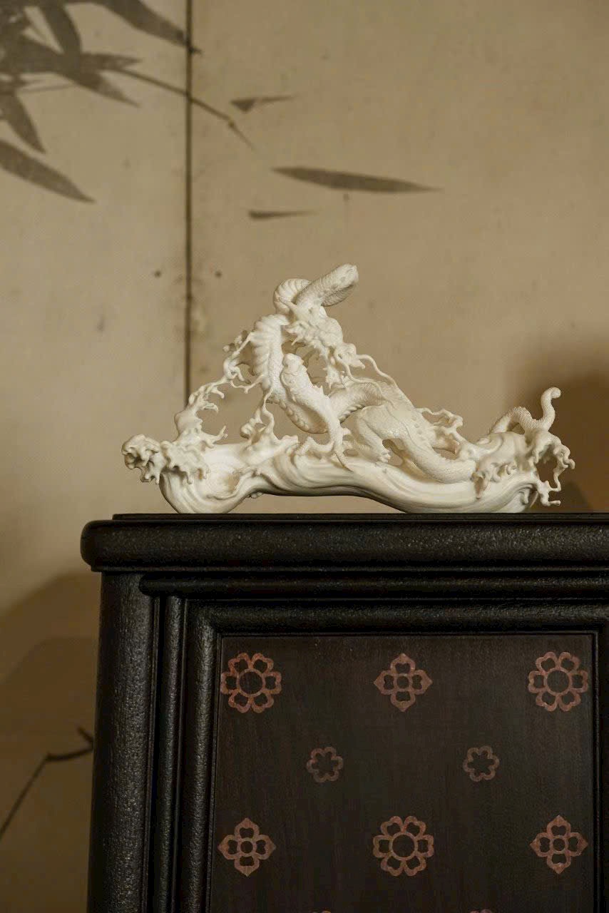 Tác phẩm được điêu khắc hoàn toàn thủ công, từng nhát dao đều mang khí tượng hồng hoang. Nghệ nhân dùng dao làm bút, tạo nên cảnh thương long phá sóng:
