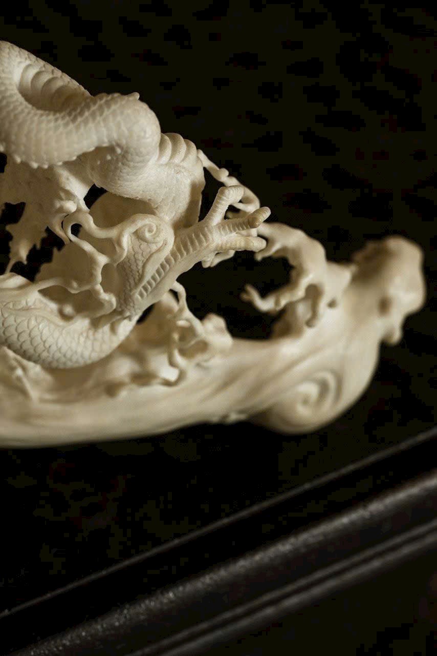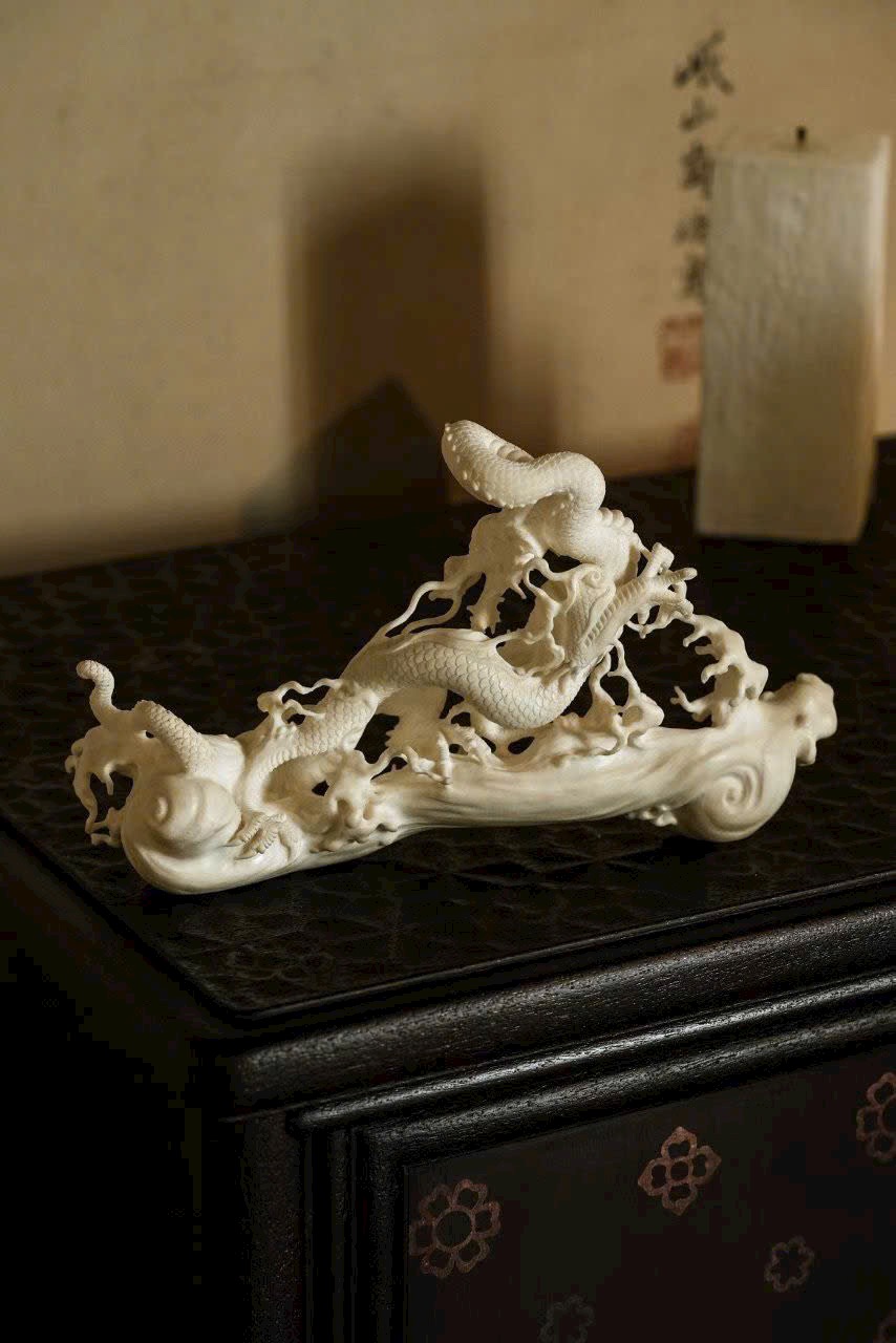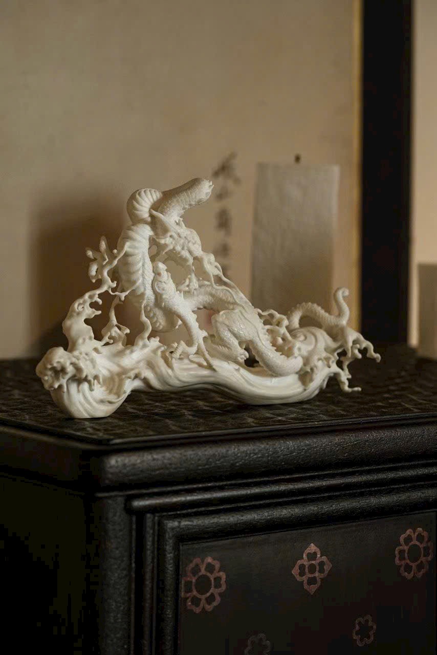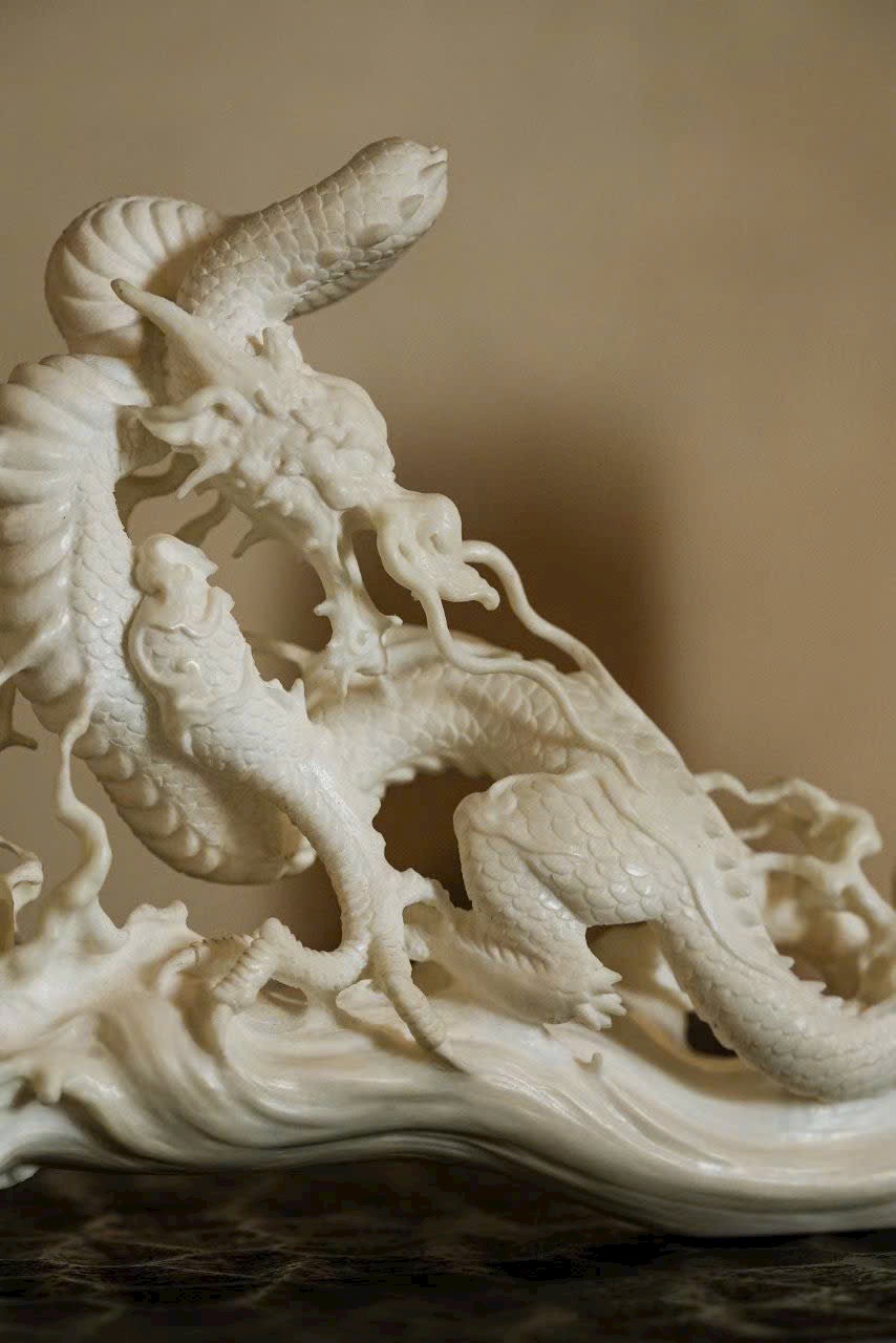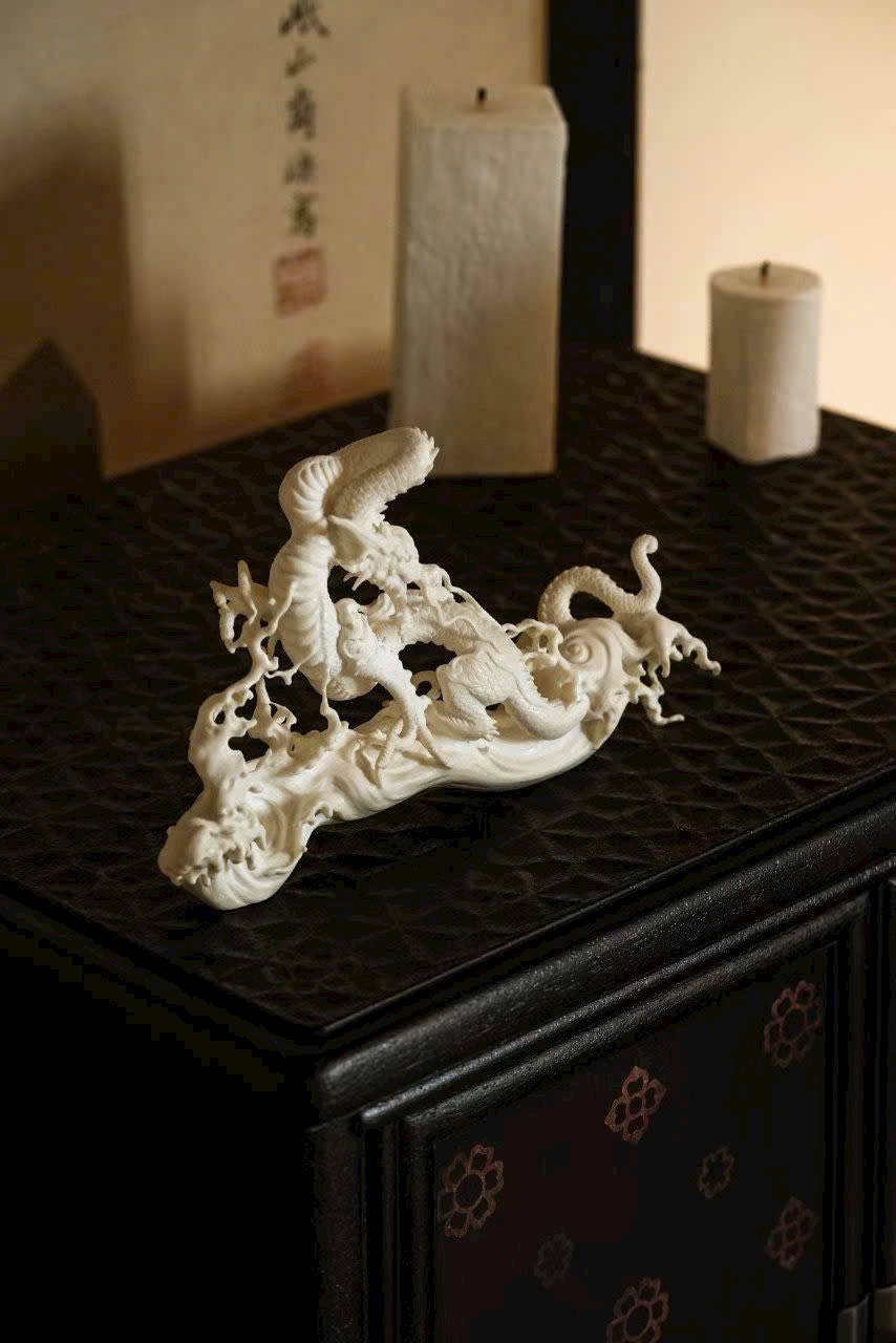 Tác phẩm được điêu khắc hoàn toàn thủ công, từng nhát dao đều mang khí tượng hồng hoang. Nghệ nhân dùng dao làm bút, tạo nên cảnh thương long phá sóng: