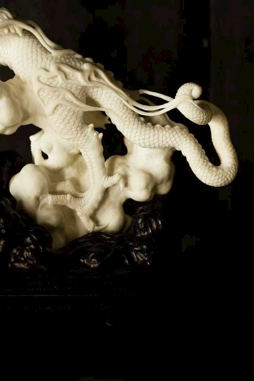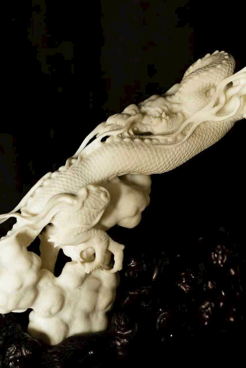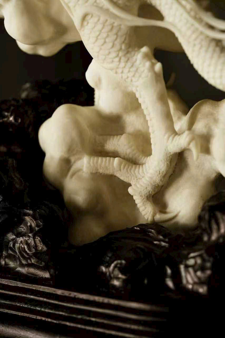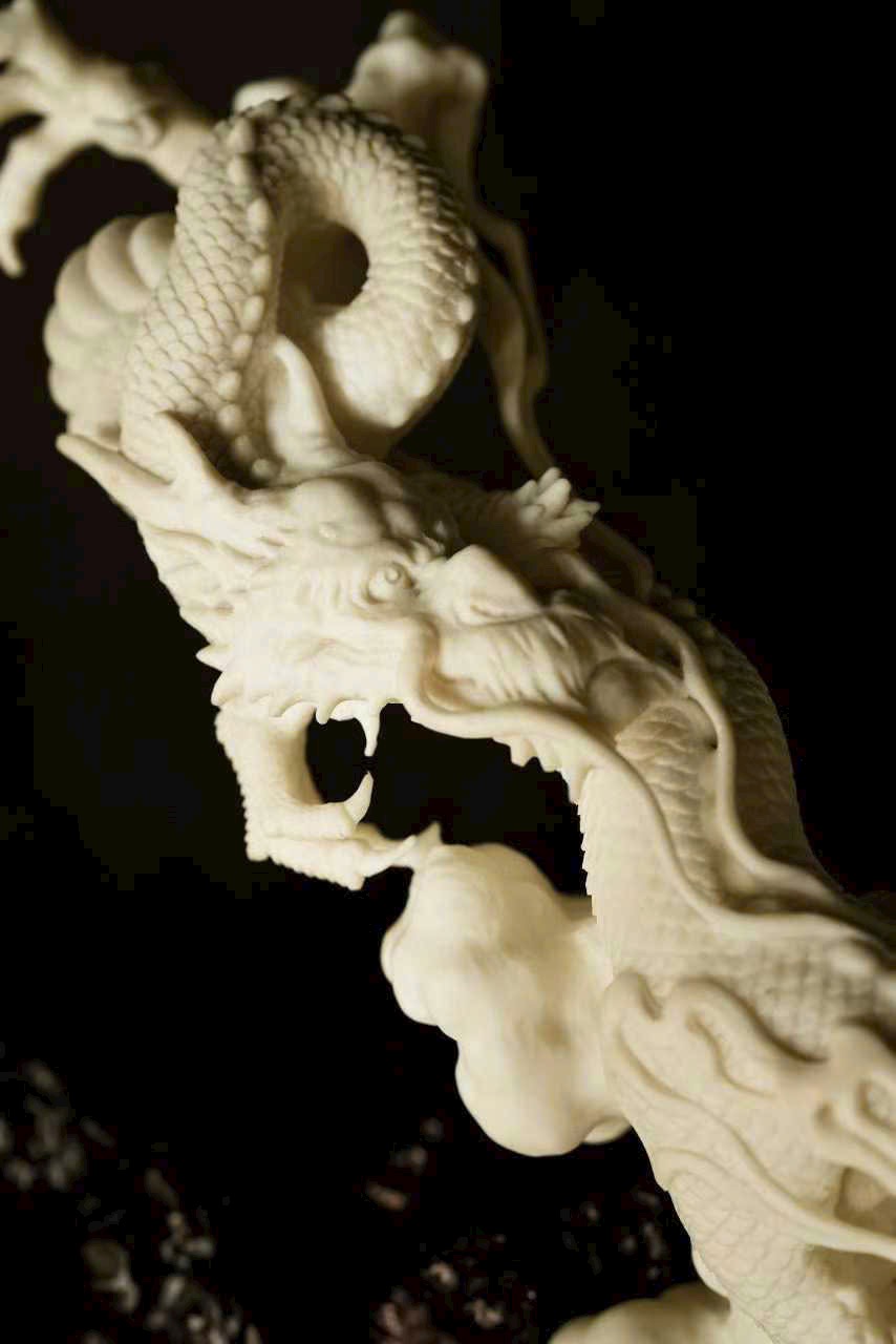 Một nhát đao định càn khôn, toàn bộ thủ công, lấy dao làm bút, hàm chứa khí tượng hồng hoang. Vận dụng kỹ pháp chạm khắc điêu luyện: chính diện thương long phá sóng xuất hải, mắt rực tách mây, râu rồng bay lượn như đai áo gió thổi; đuôi rồng quét biển, vảy giáp sắc sảo vang ngân.